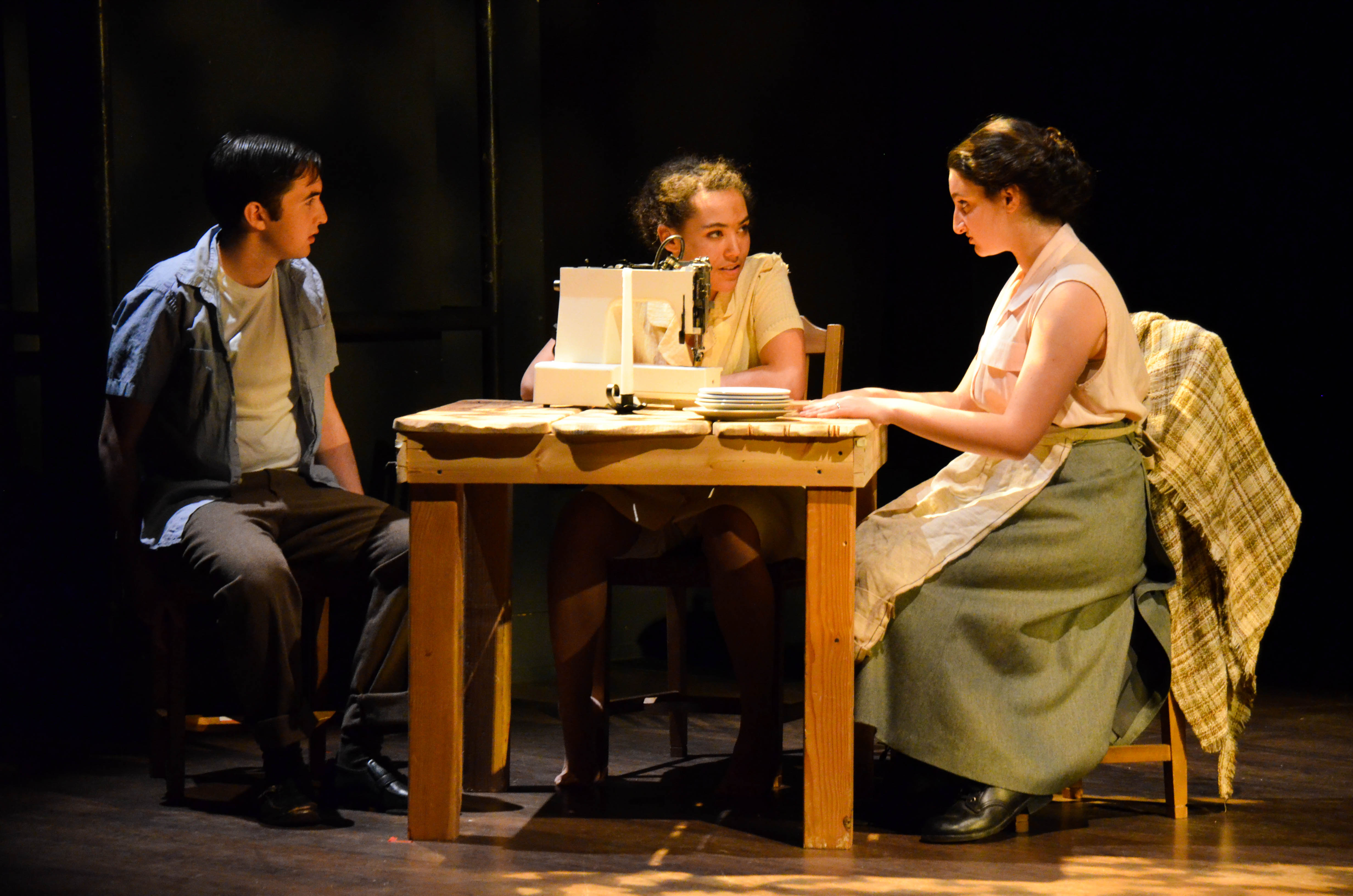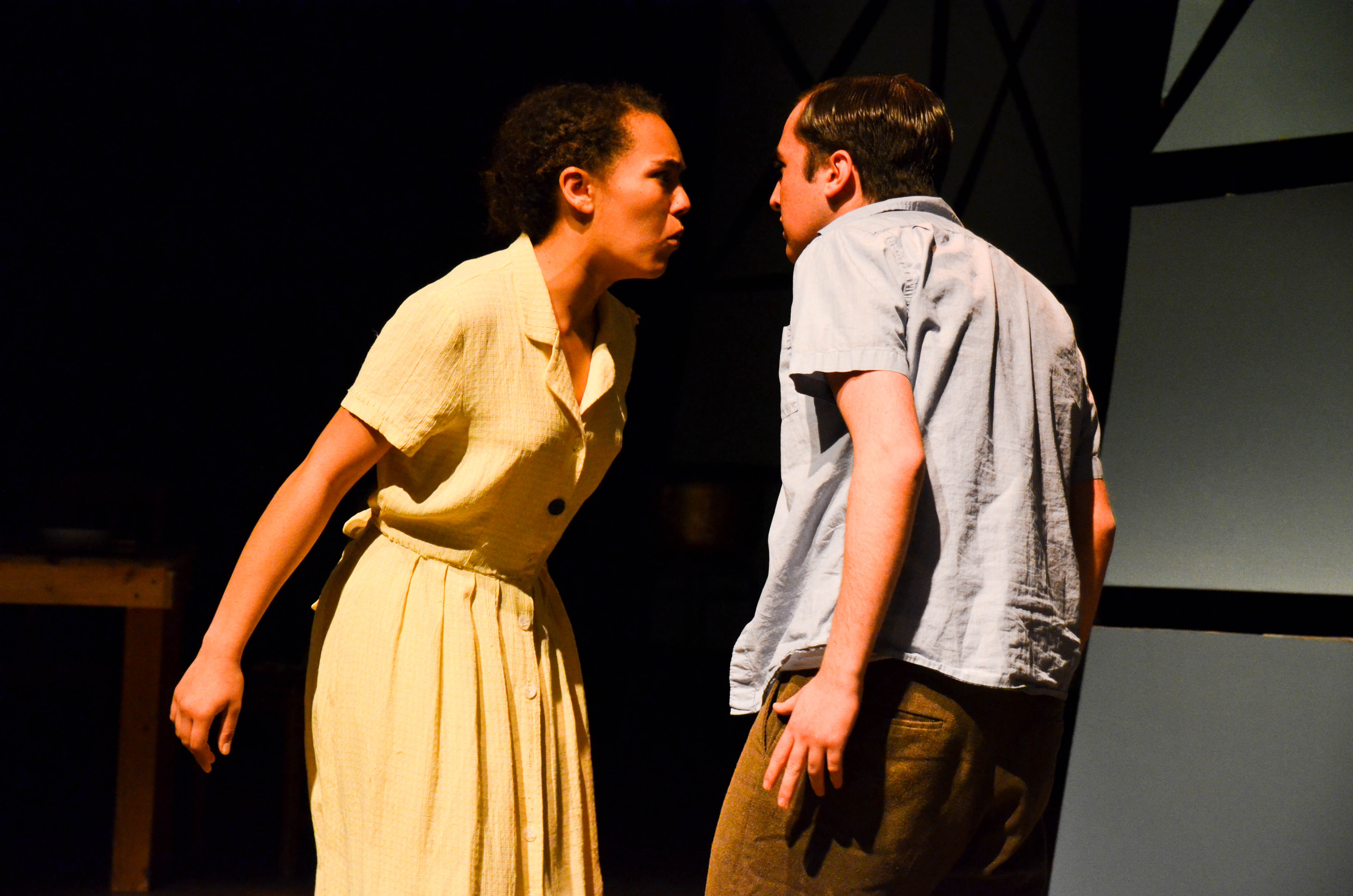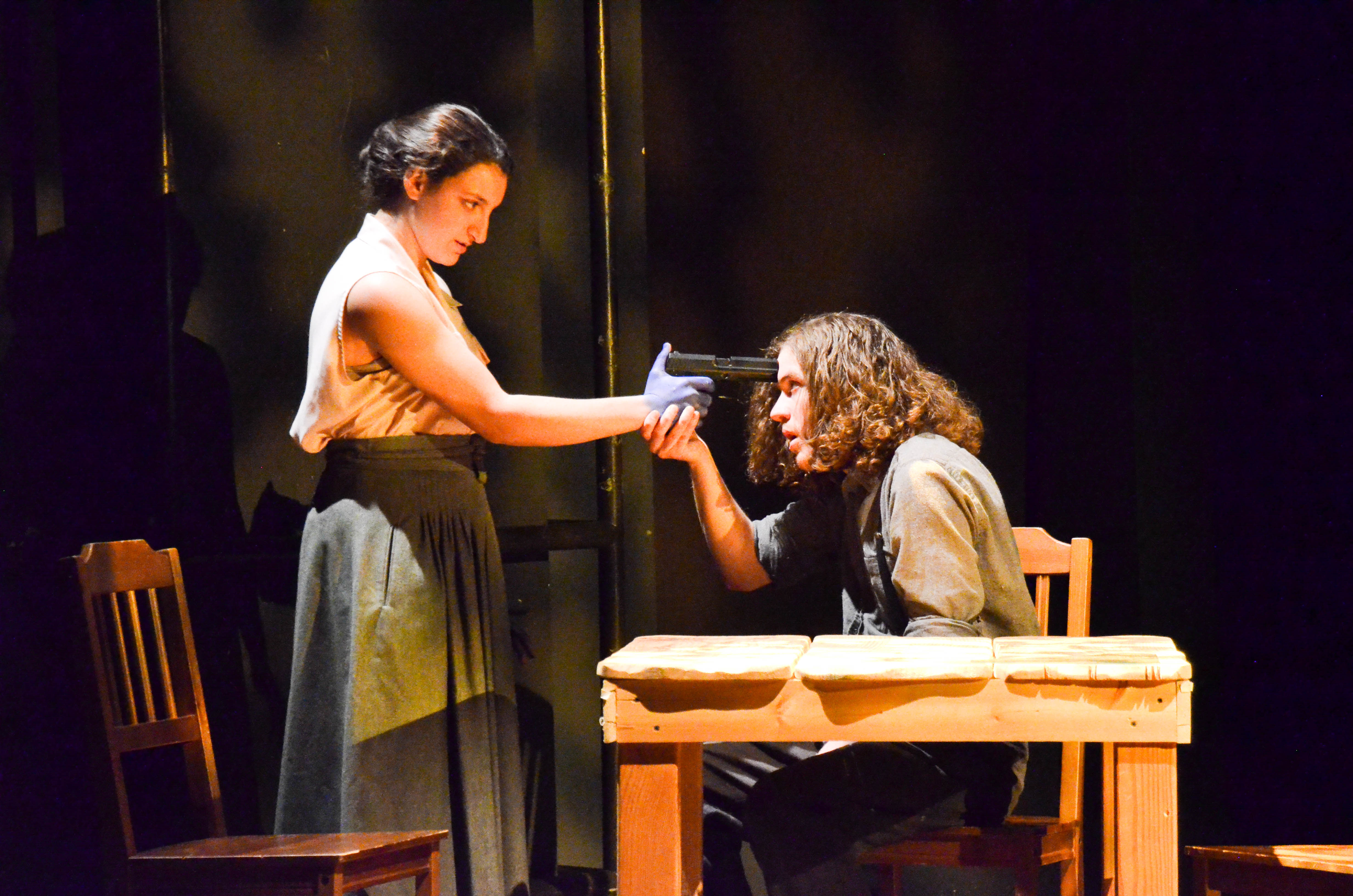 Trestle takes place during the Great Depression and begins with two teens—the brash and enigmatic Pace Creagan (Cheyanne Williams ’17) and the reserved, angsty Dalton Chase (Jack Reibstein ’17)—under a railroad. Pace has dared Dalton to run the train that passes through their town every day. They begin practicing running the train, becoming more and more enthralled with one another, sharing hopes, fears, mourning, abstraction, and developing a strange, ethereal love. Interspersed with these scenes are glimpses into Dalton’s home, with his mother (Elli Scharlin ’18) and father (Connor Boughton ’15) breaking under the strain of their financial troubles and the weight of their own beings. There are also several scenes in a jail cell with a strange, funny, sad prison guard (Thomas Van de Pas ’17) attempting to understand self-destruction in the people he’s guarding through the contexts of other animals. The three worlds of “Trestle”—the home, the train, and the prison—converge and diverge to thrilling narrative and metaphysical effect.