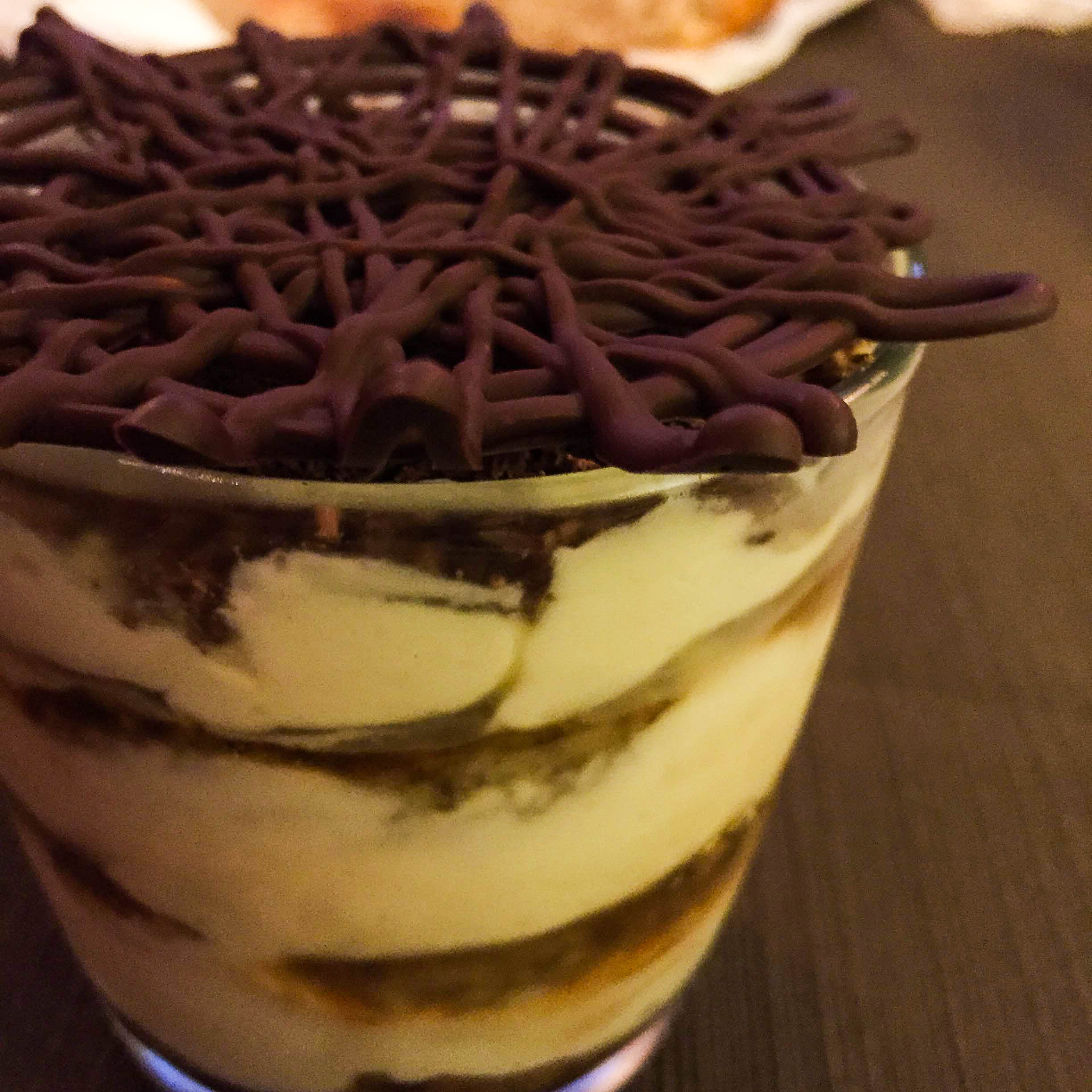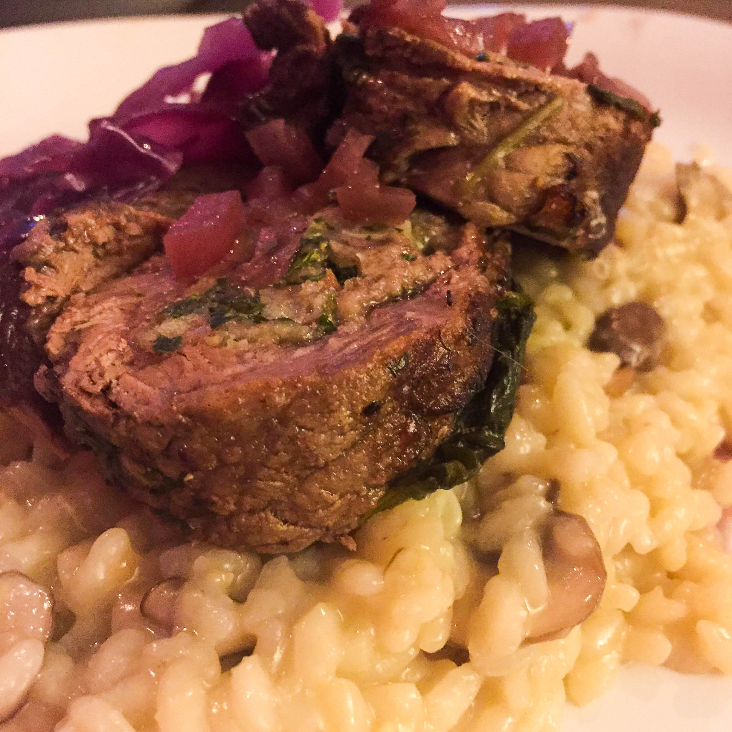 To start, we munched on freshly made focaccia, baked to perfection and finished with coarse grains of salt. Next, we were served an antipasto platter of prosciutto-wrapped honeydew, mini peppers stuffed with sausage, and bruschetta topped with the classic Caprese combo of tomato, mozzarella, and basil. All this was then followed by the main course—braciola (tender flank steak rolled into spiral medallions) over a bed of perfectly flavored mushroom risotto and cabbage braised in red wine—and, finally, dessert: creamy tiramisu served in individual glasses adorned with fancy snowflakes crafted in chocolate by Gruppuso herself.