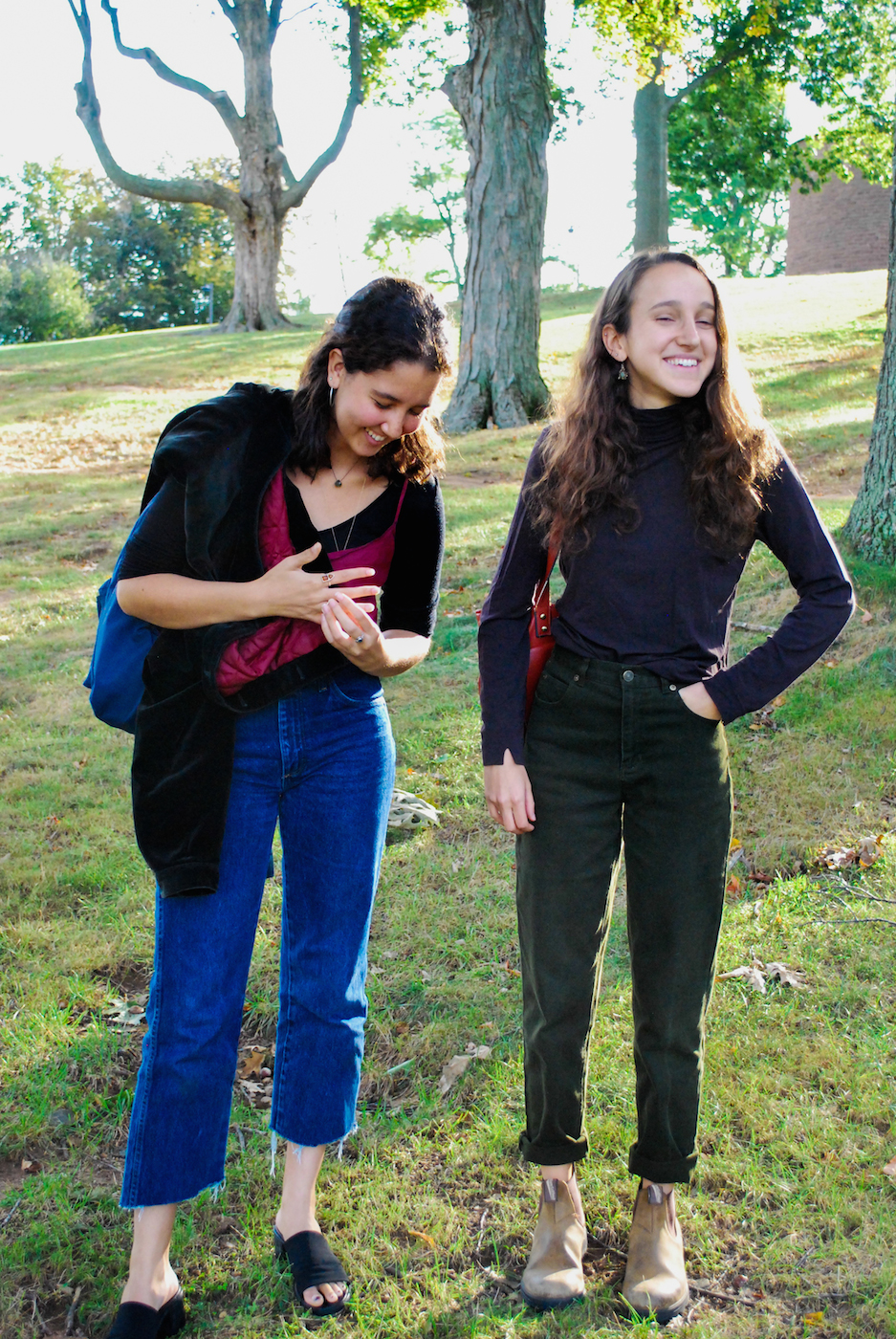 Rosin has only gone to Savers once so far this school year, but she has emerged with some of her favorite thrifted pieces ever: vintage moss-colored jeans and a cheeky T-shirt with “Let’s talk about me!” written above two pink high heels. Like Rosin, Sarah Sanders-Messmann ’19 reports similar finds, with a bejeweled “Mamma Mia!” graphic tee, blue Wrangler jeans, and mule sandals rounding out some of her favorites.