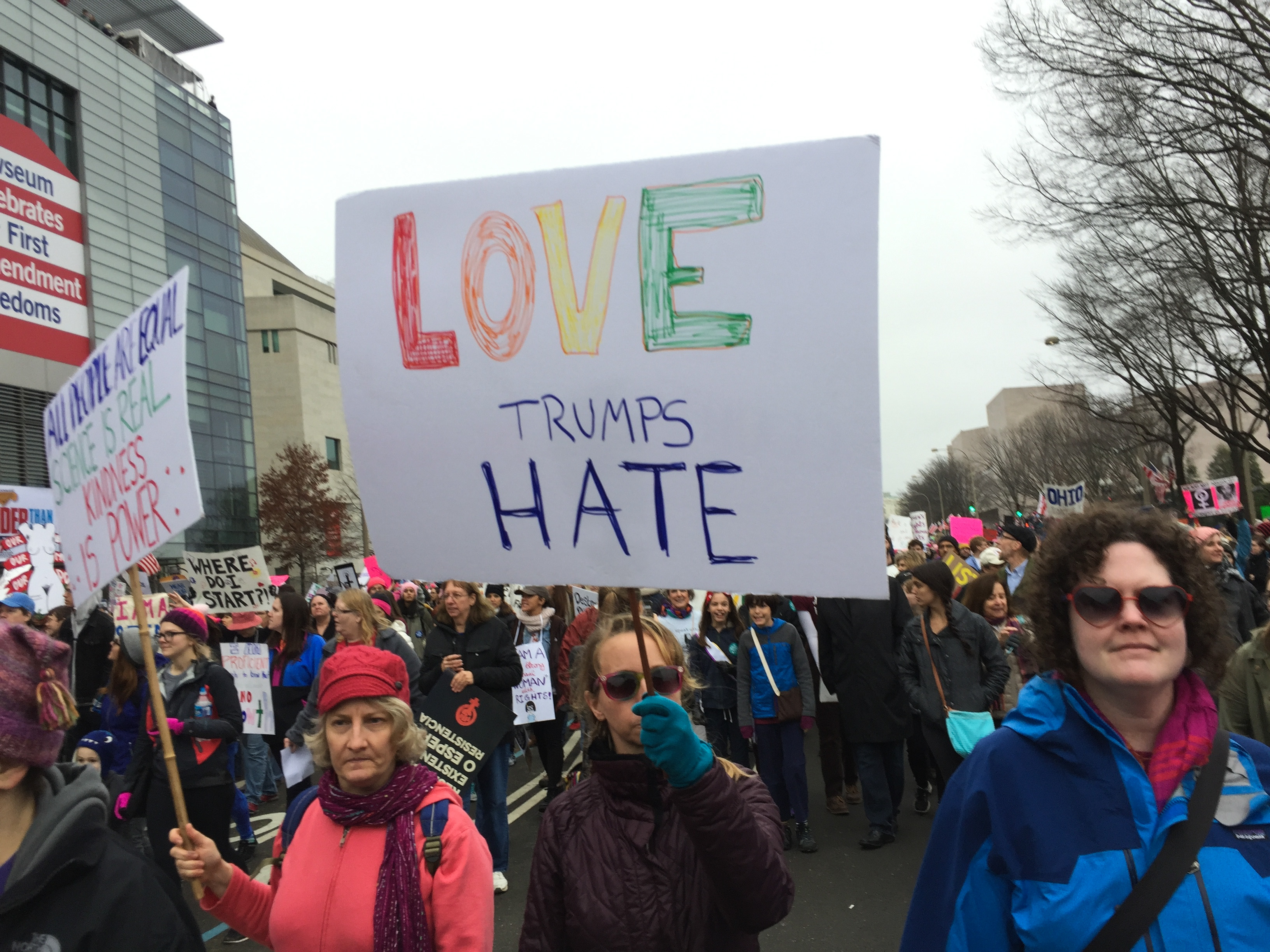 Sure enough, as we waited for the Metro, we stood at a mostly empty station between a pack of older men wearing suits and “Make America Great Again” baseball caps and a group of women wearing pink “pussy hats.” They eyed each other suspiciously.