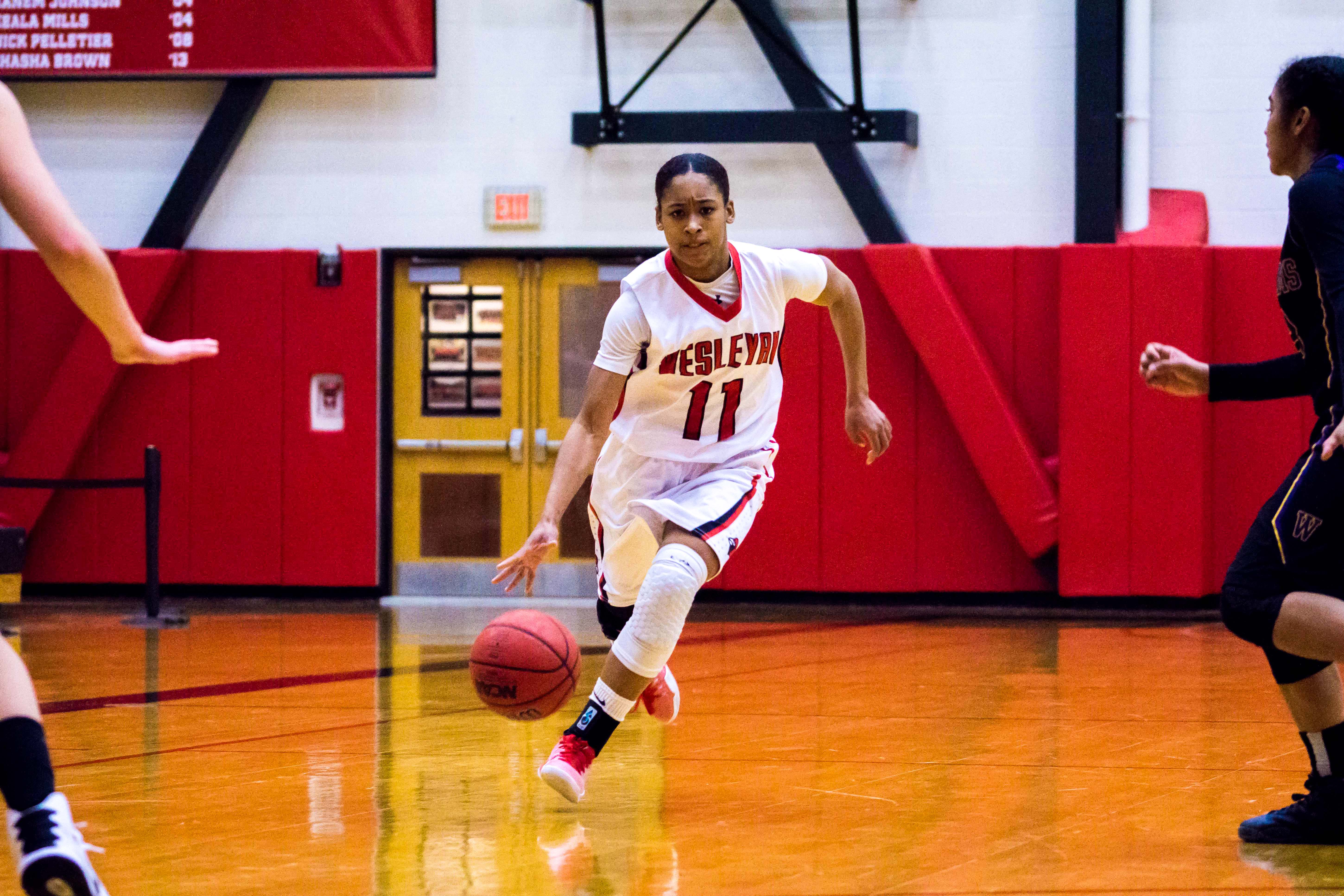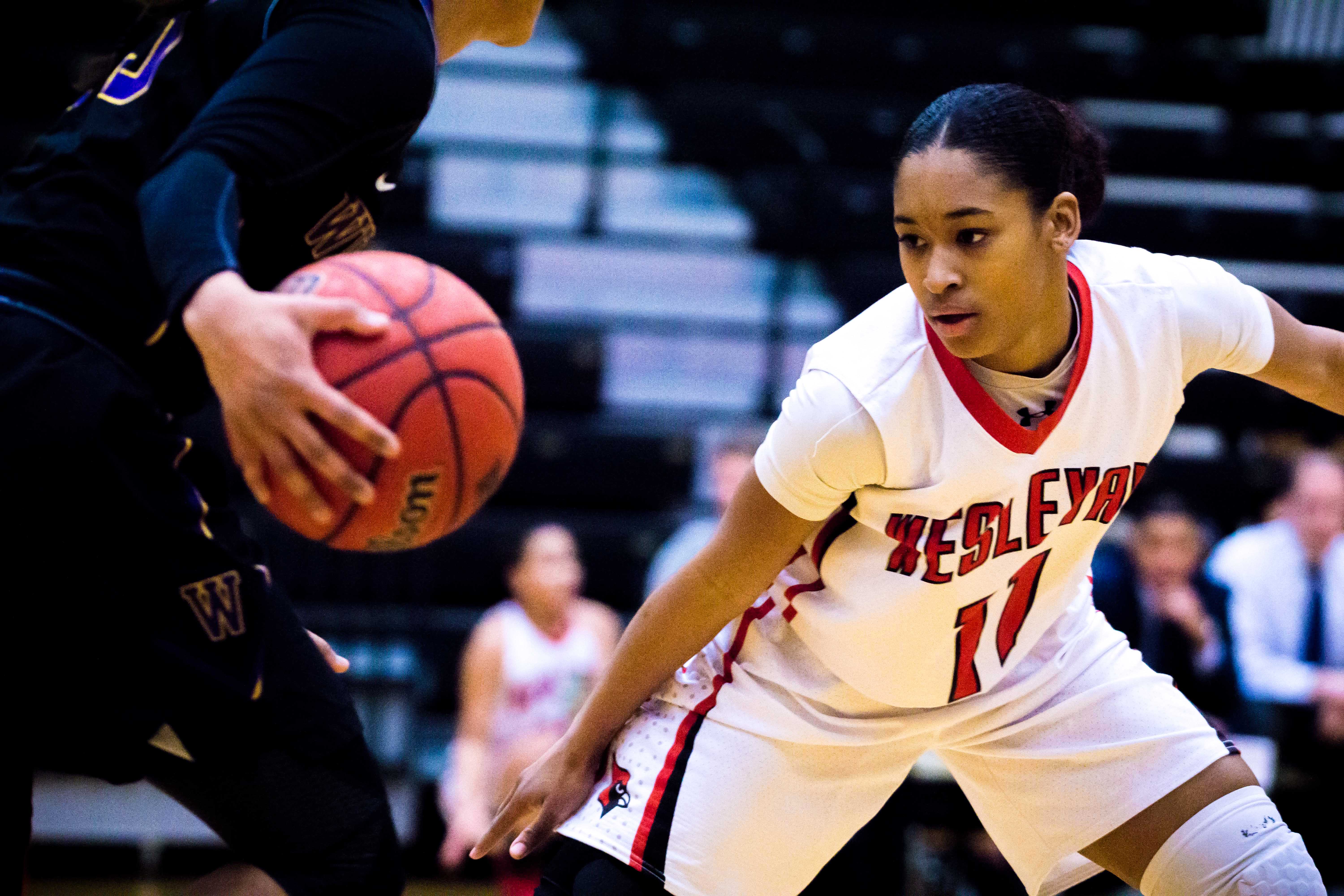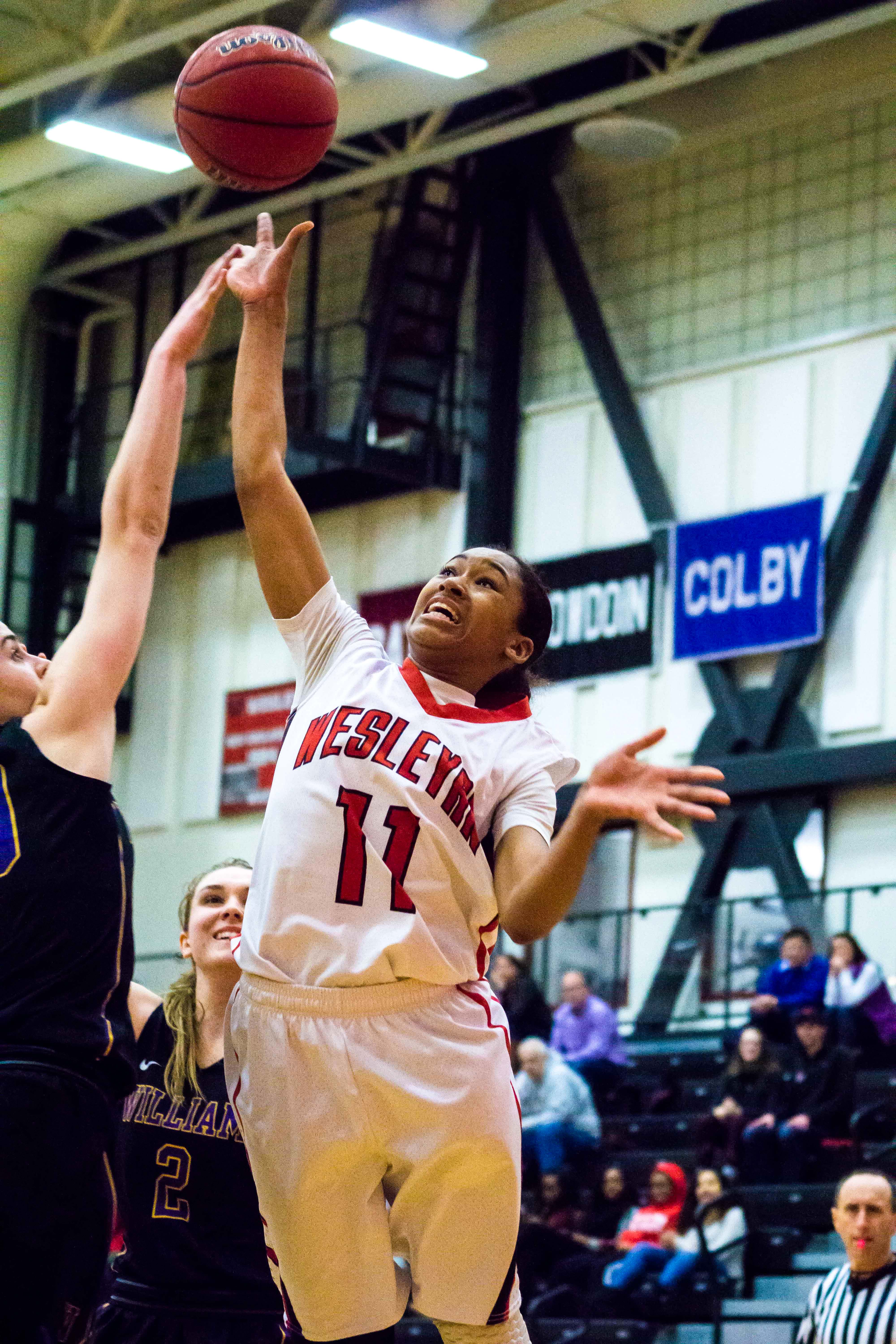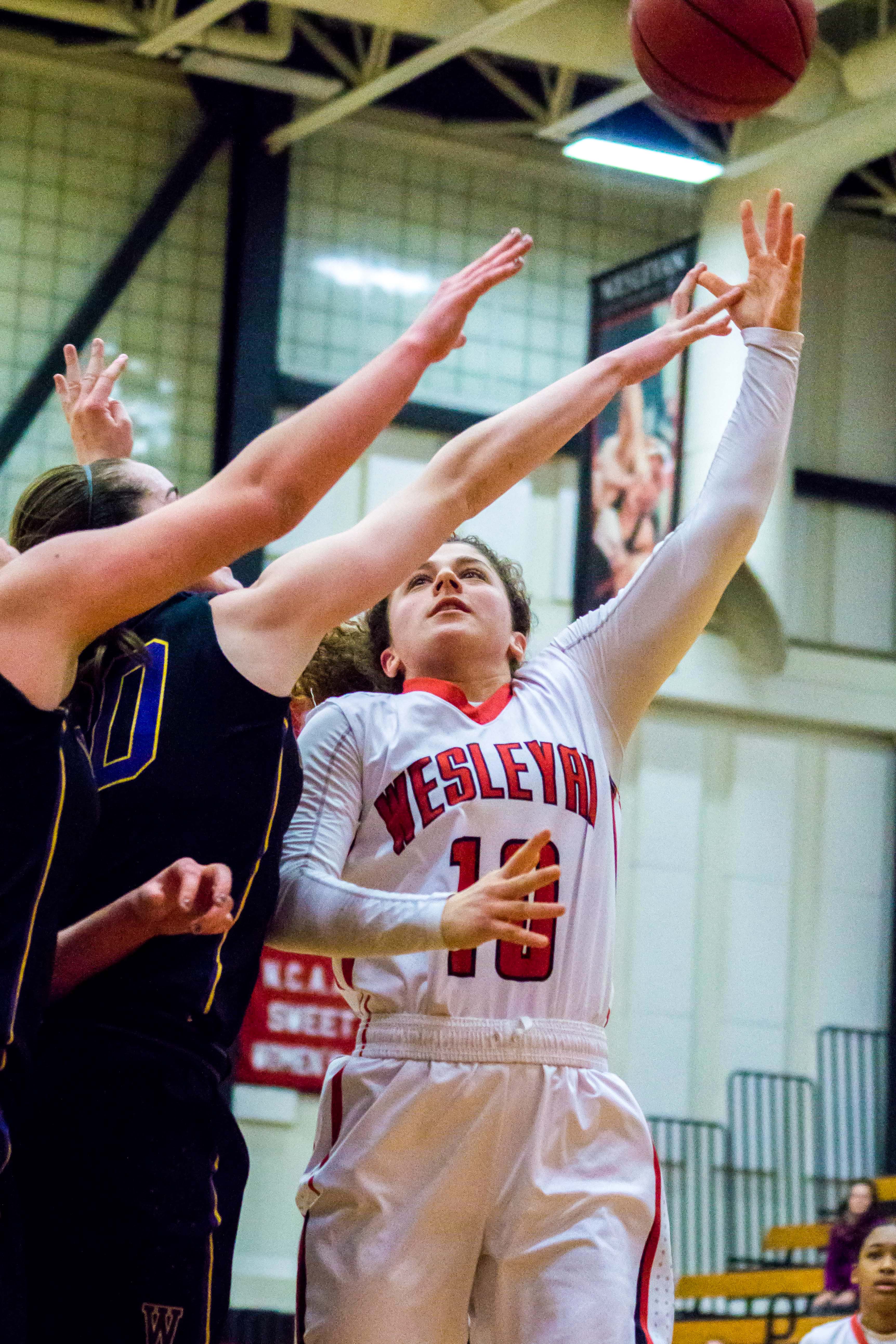 Though both teams kept up their strong defense in the first quarter, they struggled to score. The Cardinals went ahead with a 6-2 lead at the seven minute mark. However, after an 8-0 run, the Polar Bears entered the second quarter with a 12-9 lead. Captain Danielle Gervacio ’17 tied the game at the 10 minute mark of the second quarter, 12-12, with a three-pointer. With only two and a half minutes left in the first half, Mathews and Maddie Bledsoe ’18 scored, giving Wesleyan the lead at the end of the first half 25-22.