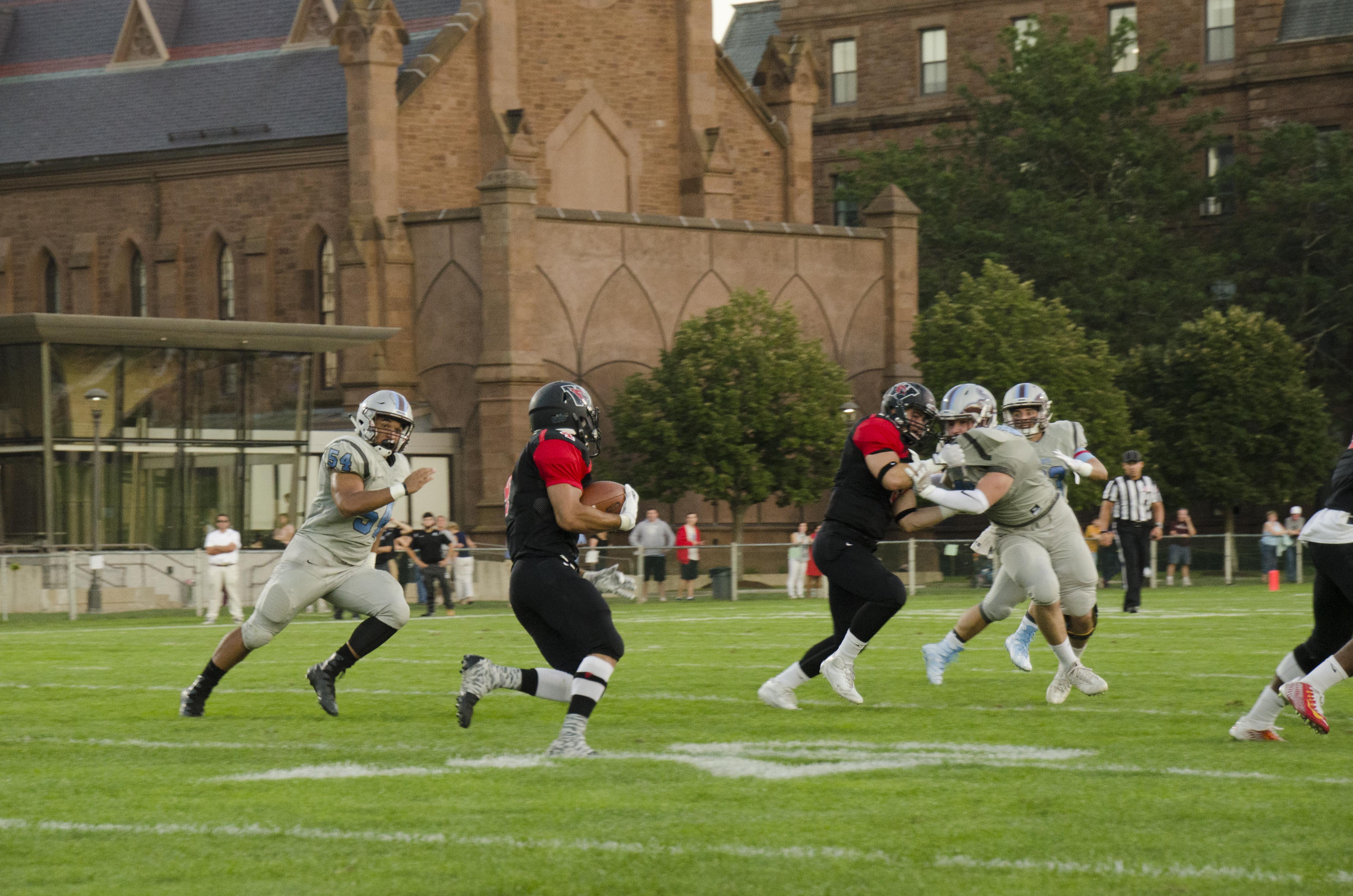 Despite offensive struggles in the first half, the Cardinals were able to pull off a miraculous comeback in the final minute against a stout Tufts defense that restrained the Red and Black for much of the game. Once again, Mark Piccirillo ’19 was the center of Cards’ offense as both the passing and rushing leader for the team this week. On defense, Grant Williams ’19 and captain Shayne Kaminski ’18 were standout players, with Williams notching one and a half sacks and Kaminski sealing the win with an interception in overtime.