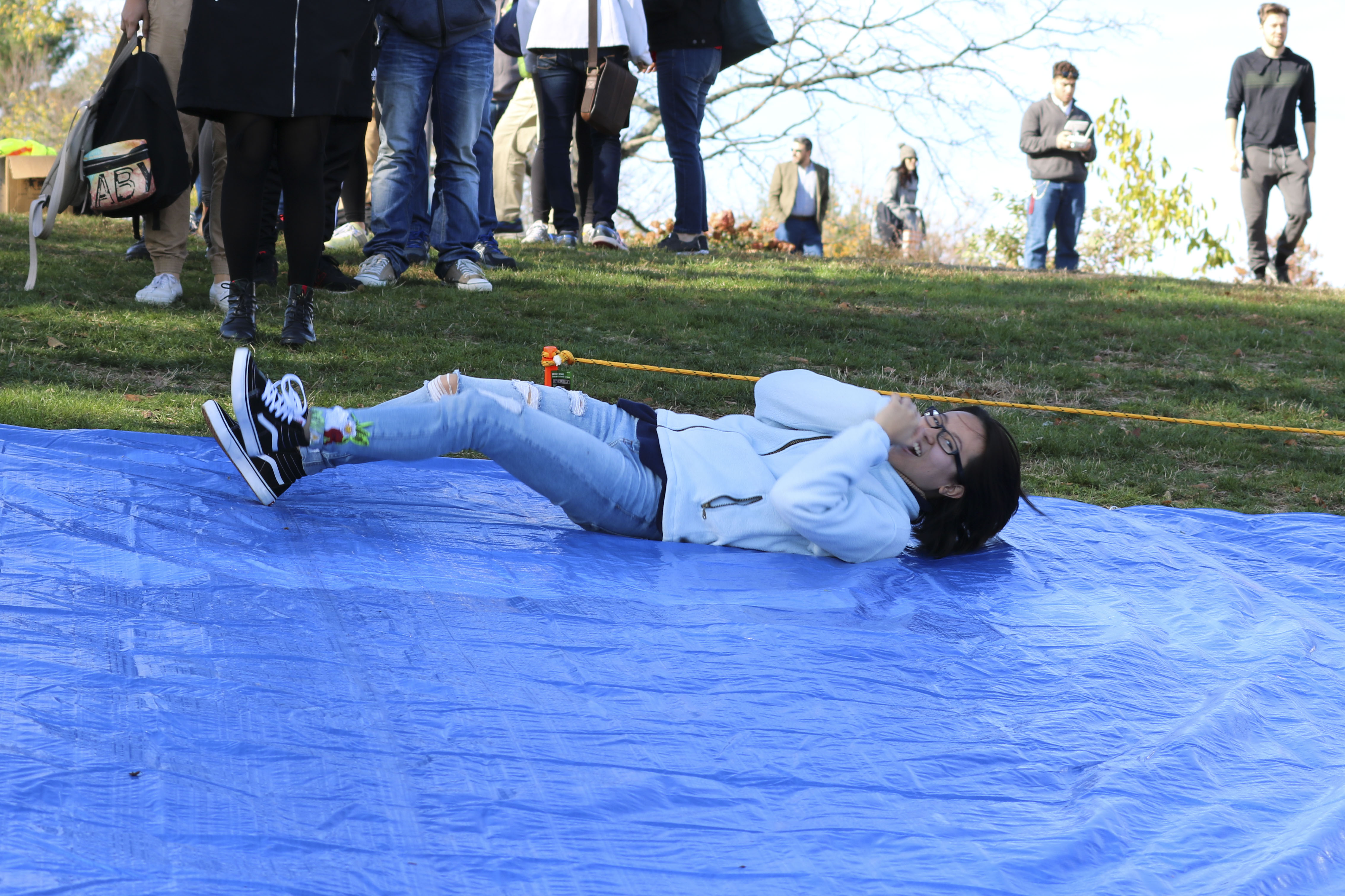This event was the first large-scale event hosted by WesMaSS, and took place from 10 a.m. to 12 p.m. Rollers walked up to the top of Foss Hill and entered into three lines, which led to large blue tarps that the participants rolled down. At the bottom of the tarps, participants were helped up by volunteers and given stickers that read “I rolled!” Many participants stayed in the vicinity to watch others roll down the hill.