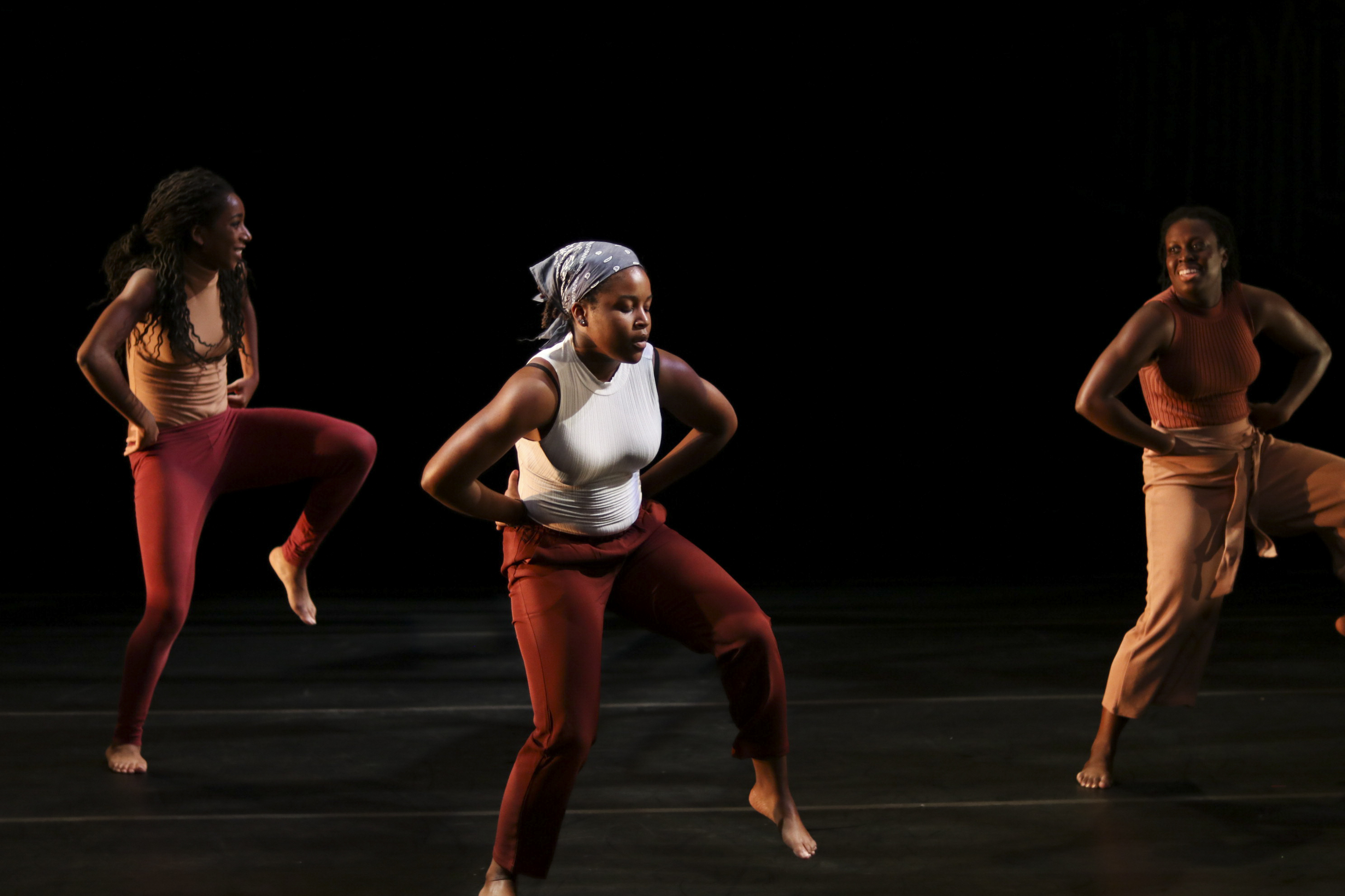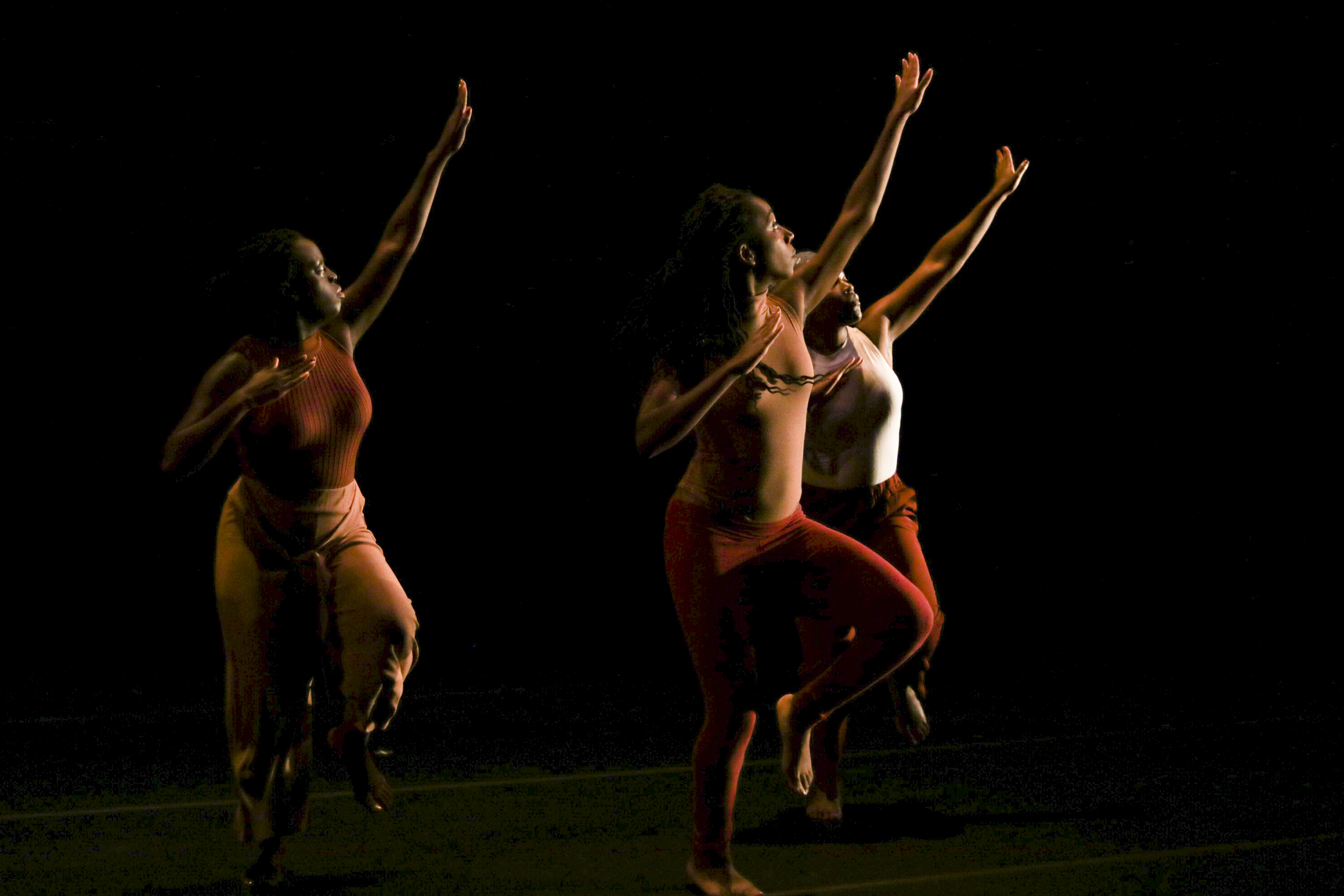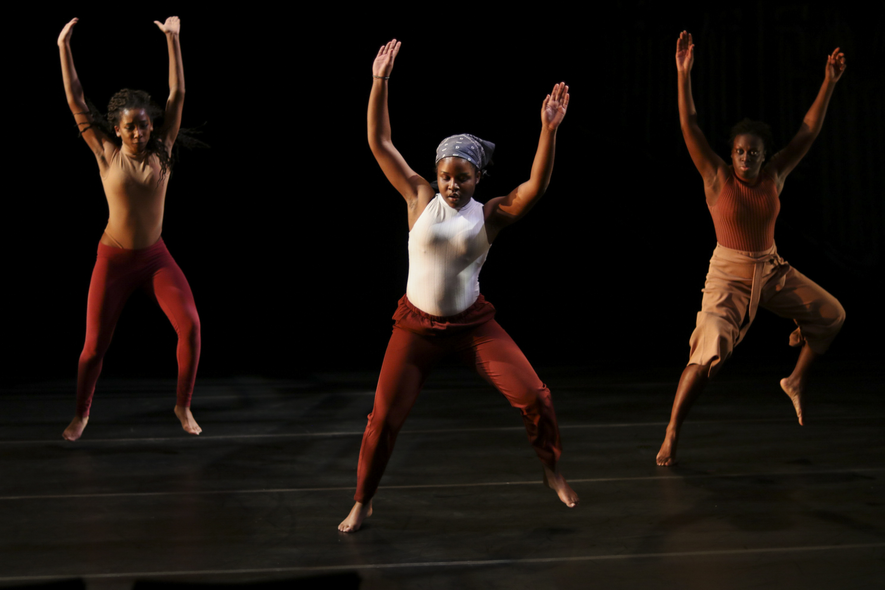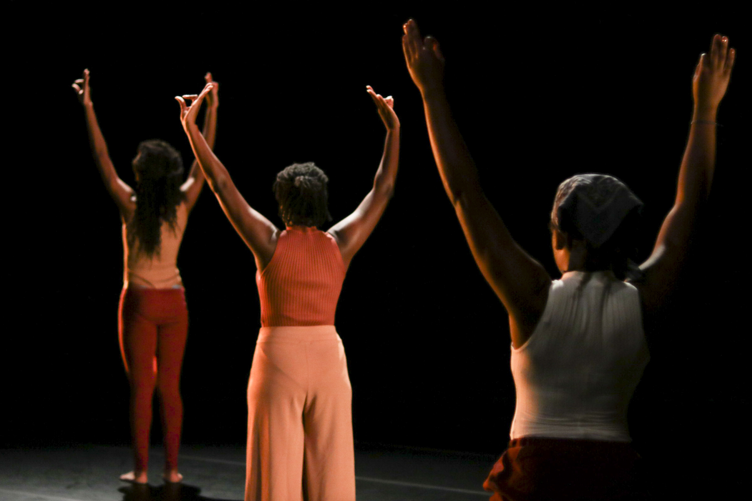 The multi-act piece began with a voice recording: “Friday night dances were my shit.” Immediately, the three dancers moved across the stage, wearing washed colors of red and yellow on loose clothing. Their wardrobes suspended in the air as the dancers began a sequence of synchronized stomping, tapping, and clapping movements.