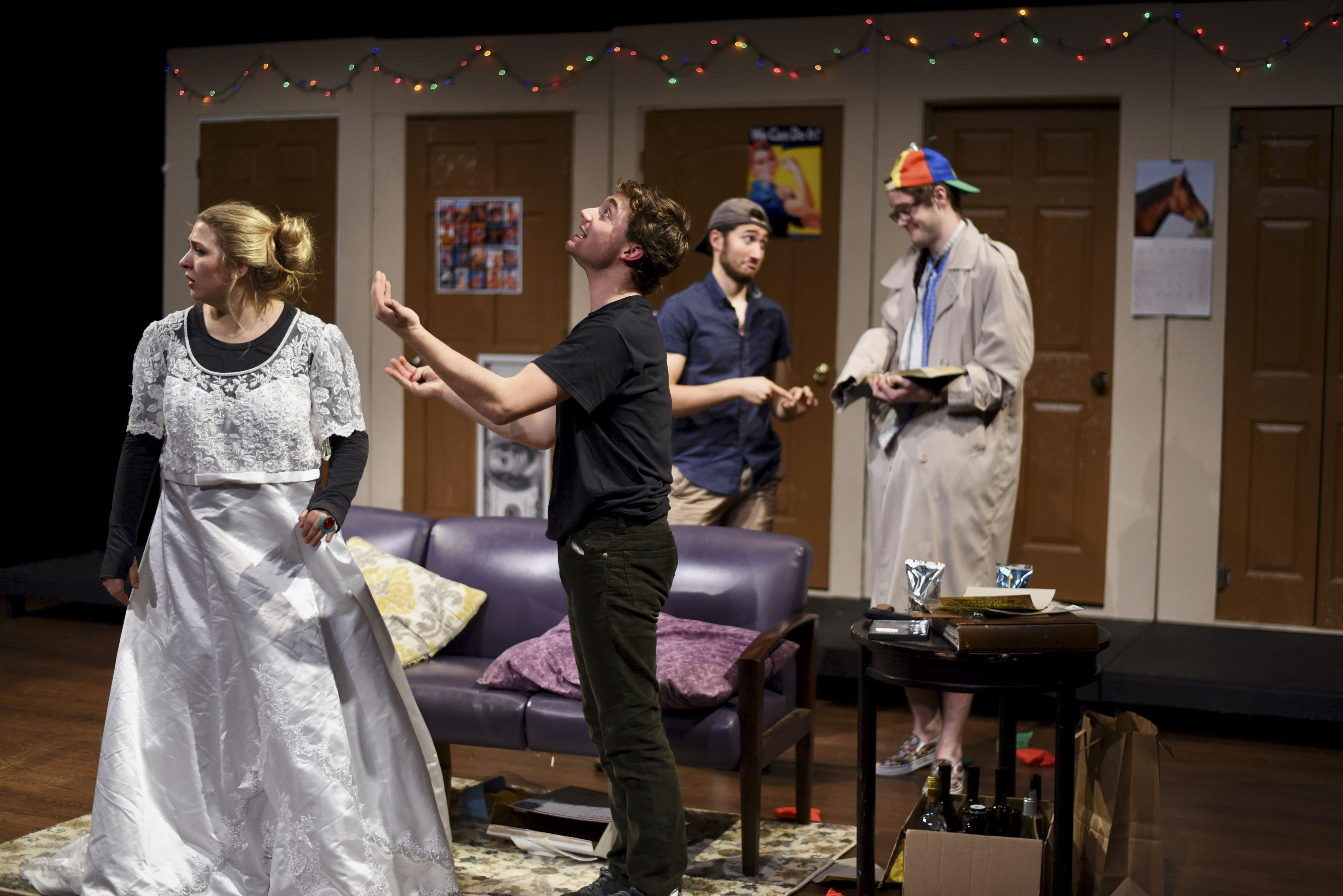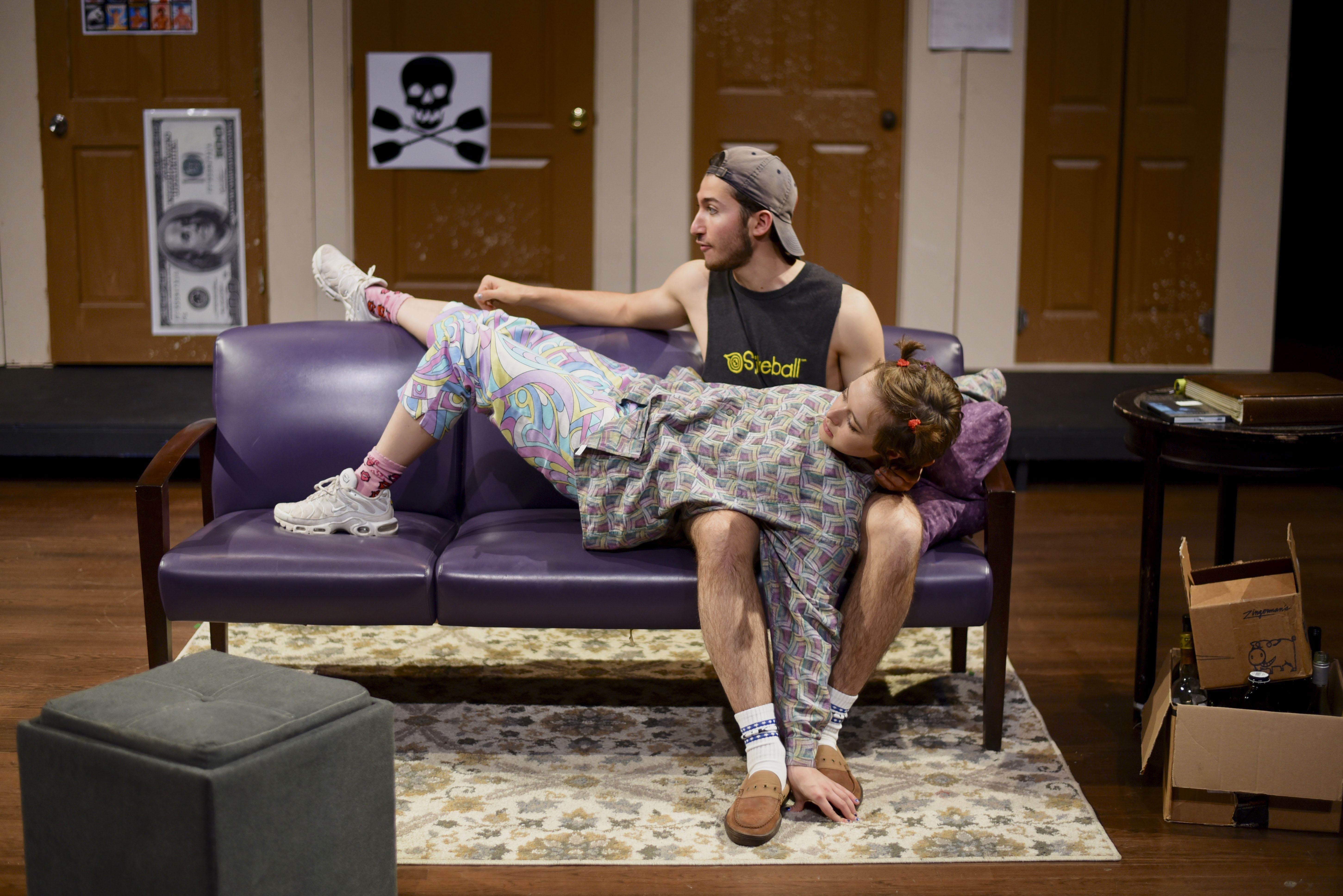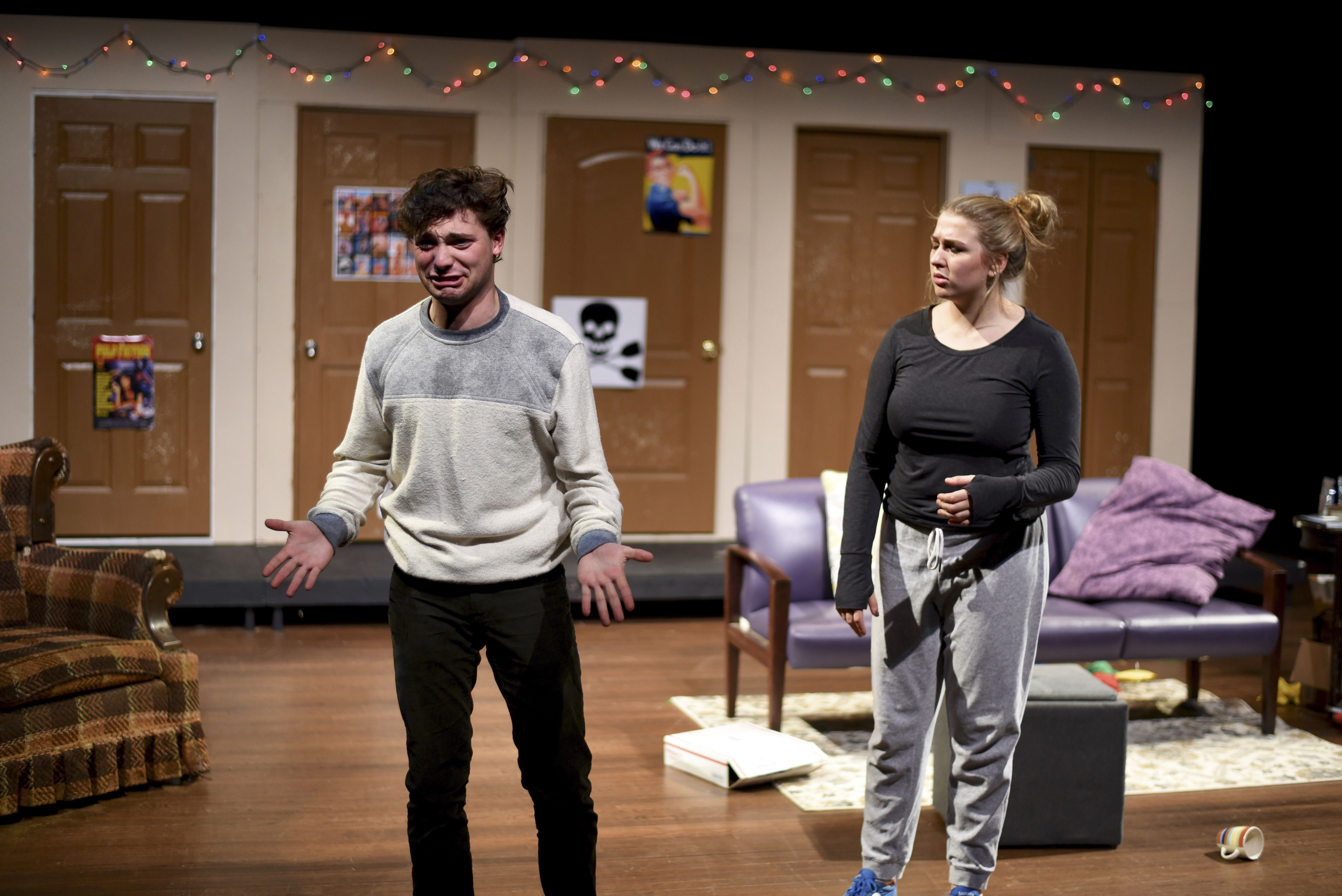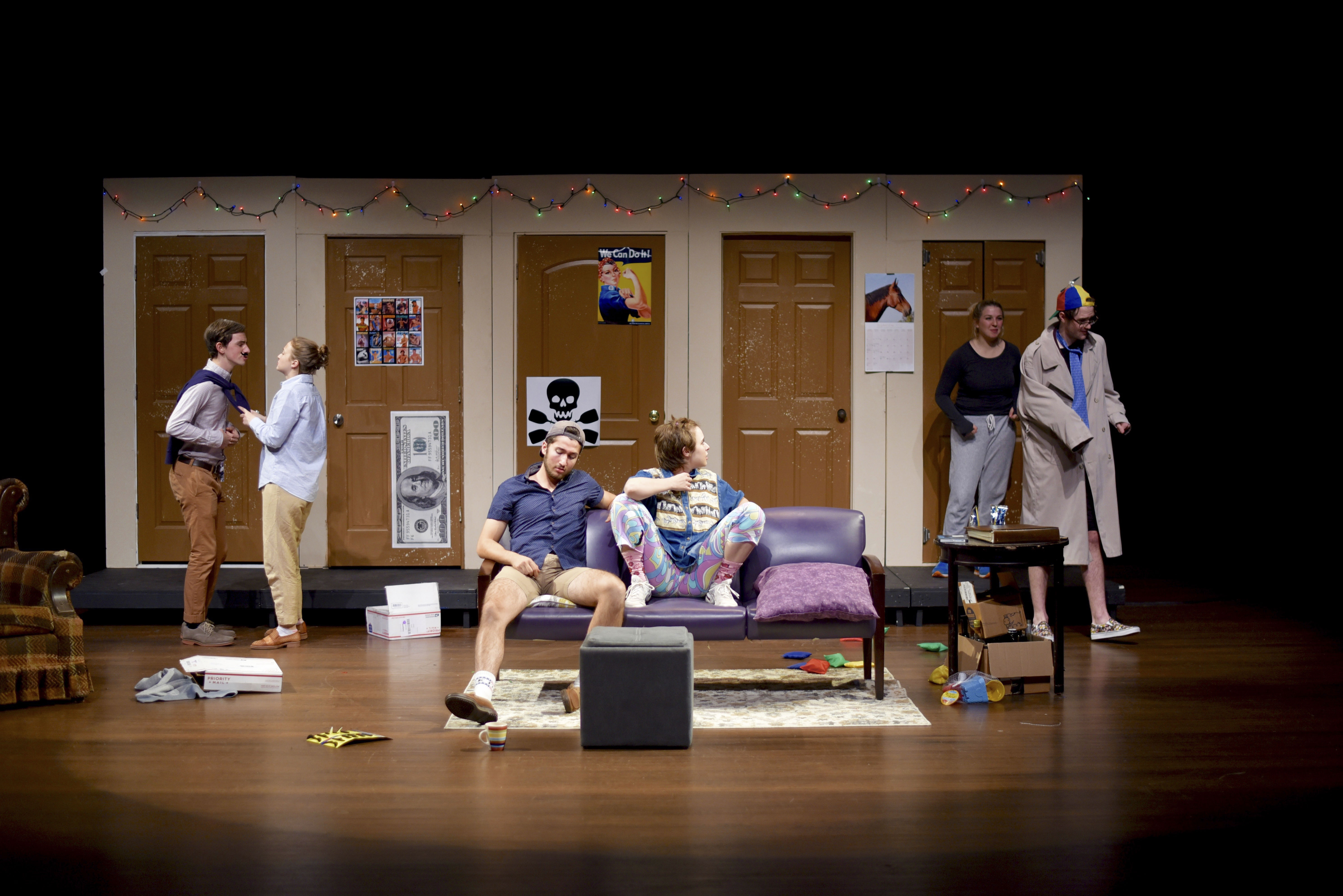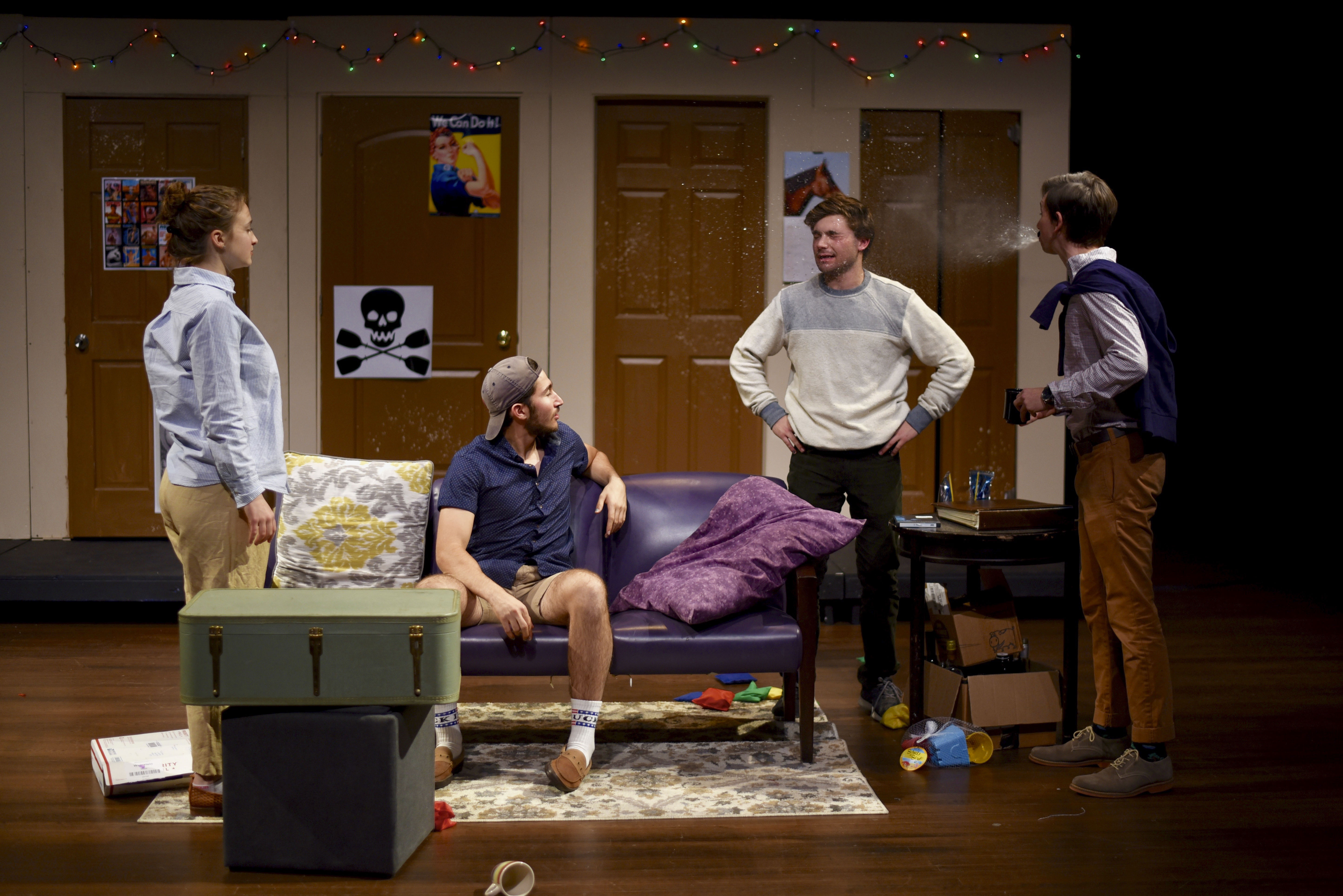 The play opens on a scene familiar to us all: the common room. It is backed by five doors belonging to our madcap cast of characters. First up is Pete, who has an excellent body but an awful personality. Try as he might, even his parents call him their “horrible son,” among other insults. Then, there’s Terry, the epitome of a bro—he wears a backwards baseball cap, yells gross and dumb things at the top of his lungs, and, of course, is an Econ major (In a particularly telling line, he yells, “Get your freak on with an econ!”). Next is Kayla, a loose cannon who has nothing to prove to anyone. Her neighbor, Laura, is the Fairy Puck of the play, an adorably evil mastermind who wreaks mischief in order to orchestrate the play’s chaos and hilarity. These lodgers are overseen by Ray the RA, an odd fellow who, according to the characters, may in fact be two toddlers wearing a trench coat.