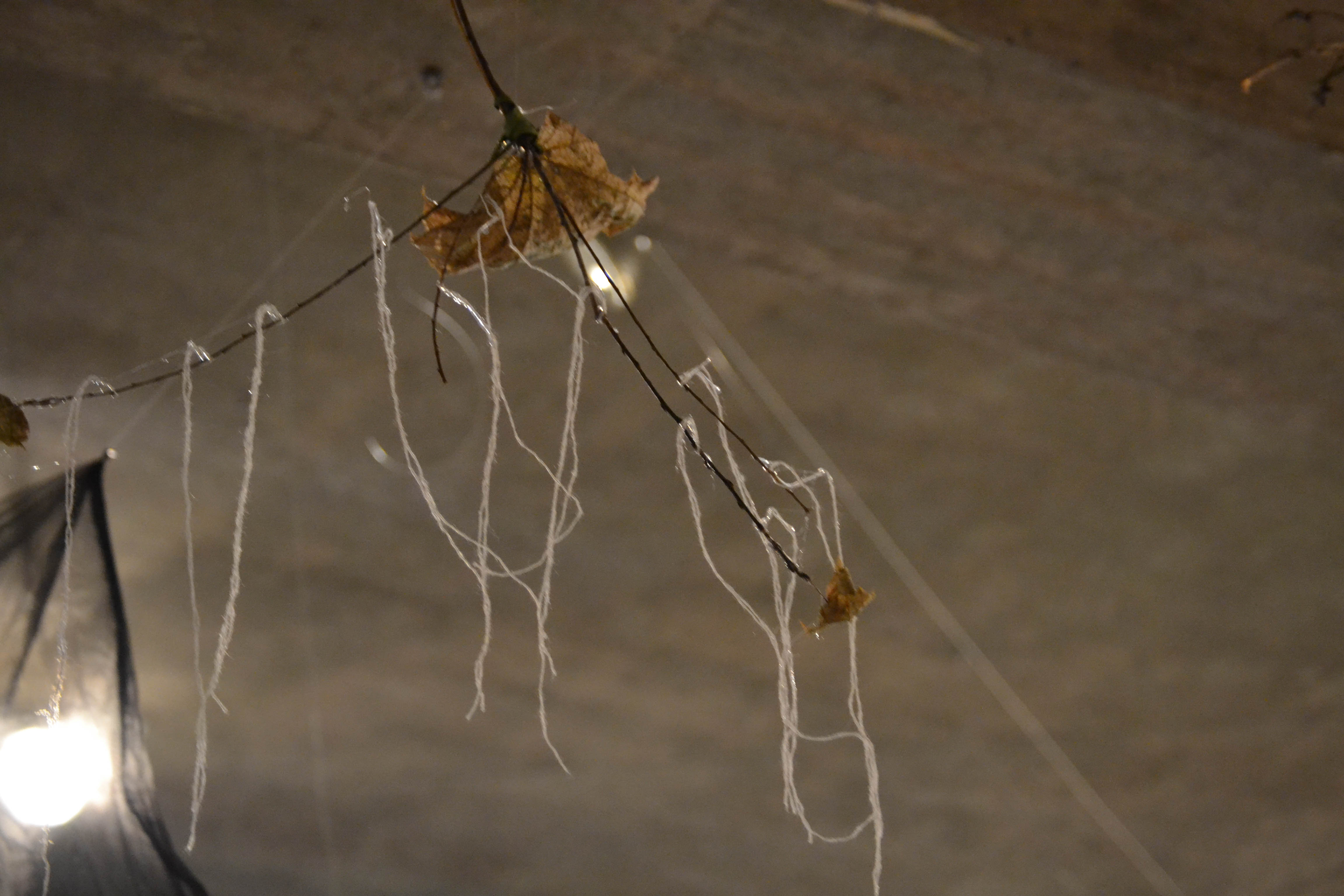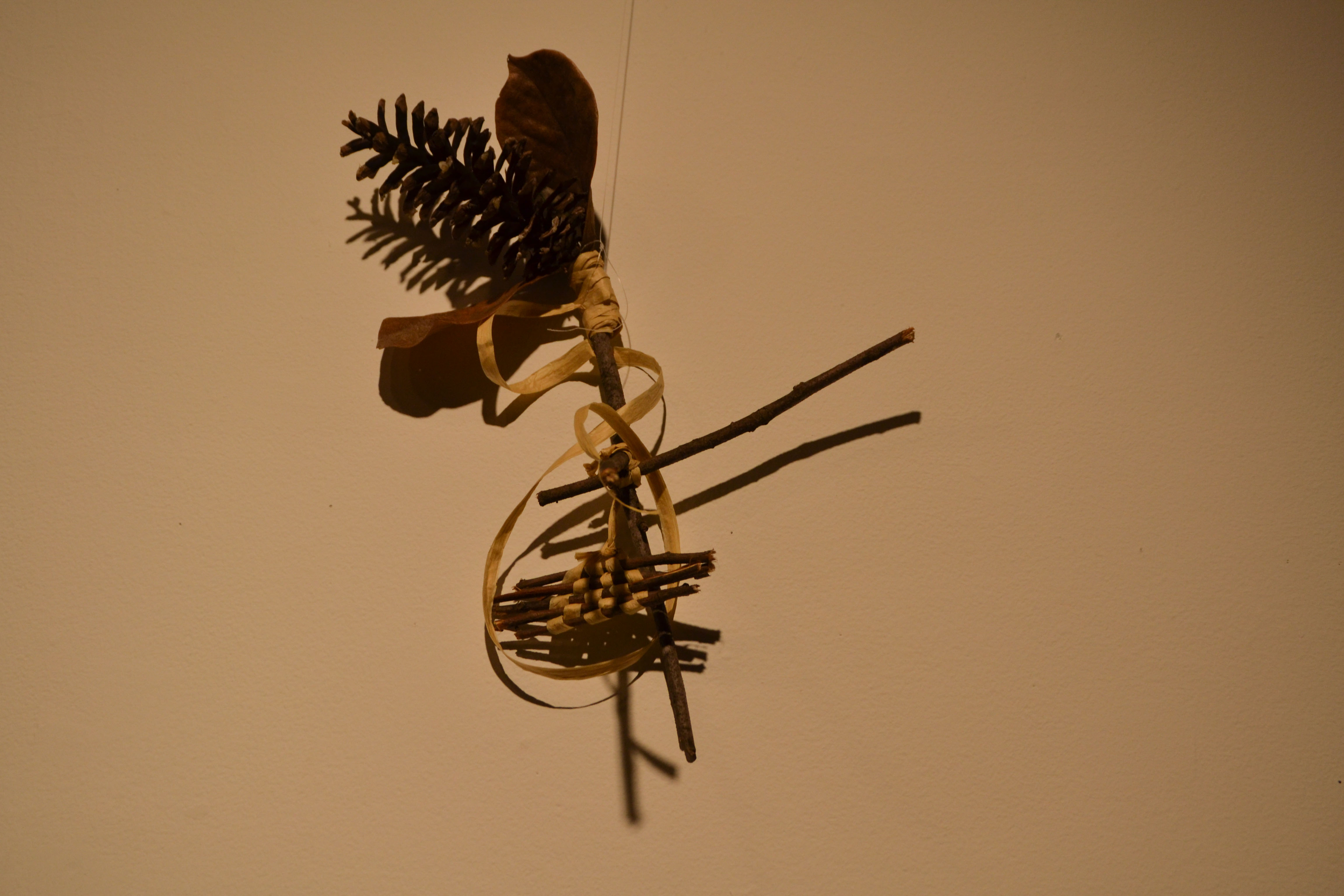 Another work, “Replanting Resistance,” consists of several sculptures of phoenixes hanging from the ceiling. These sculptures are created from leaves and branches and contain plant seeds. As the natural materials of the sculptures decompose, the seeds will fall and eventually blossom, creating new life from death and recalling the mythology of the phoenix, as well as the environmental aspects of racism.