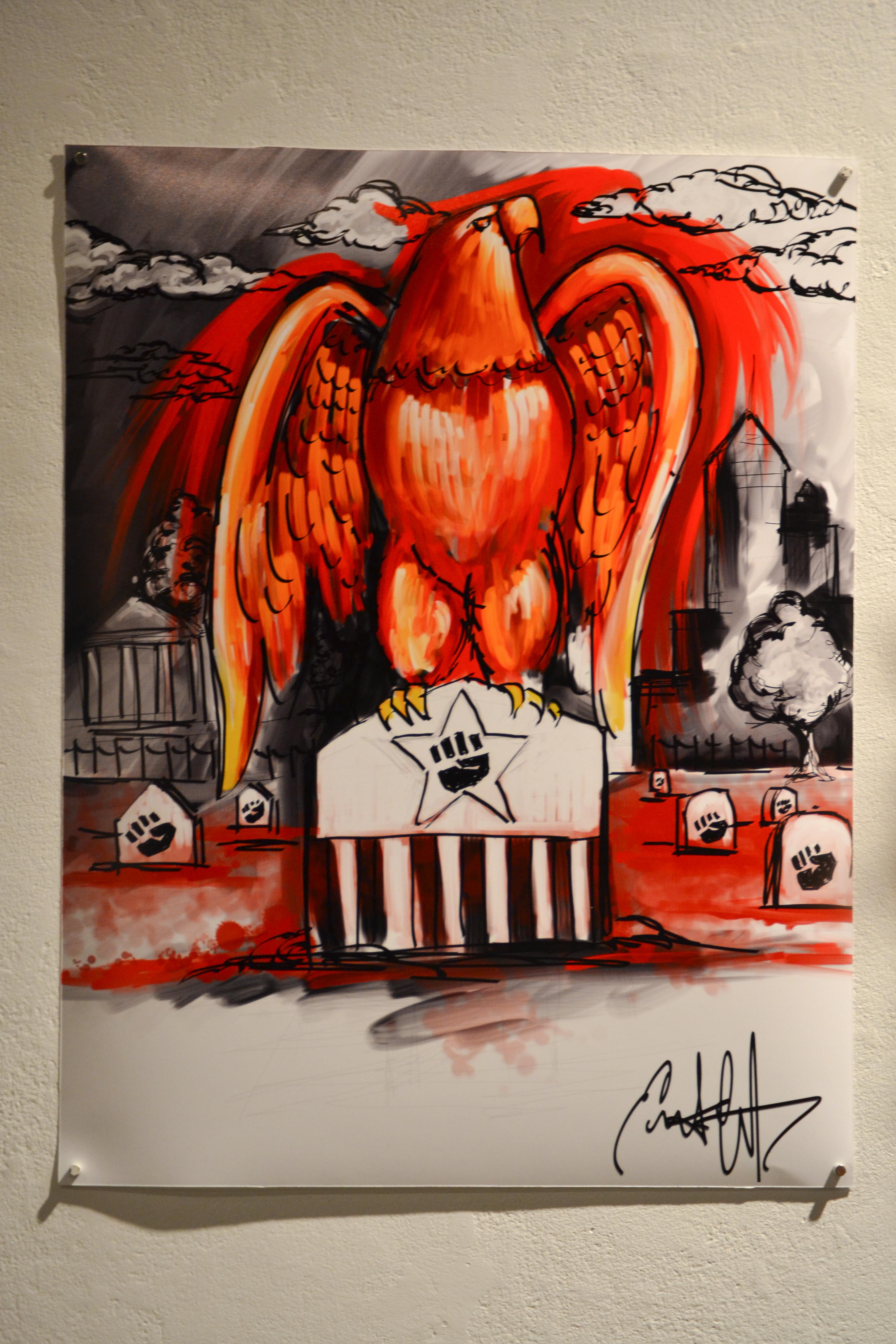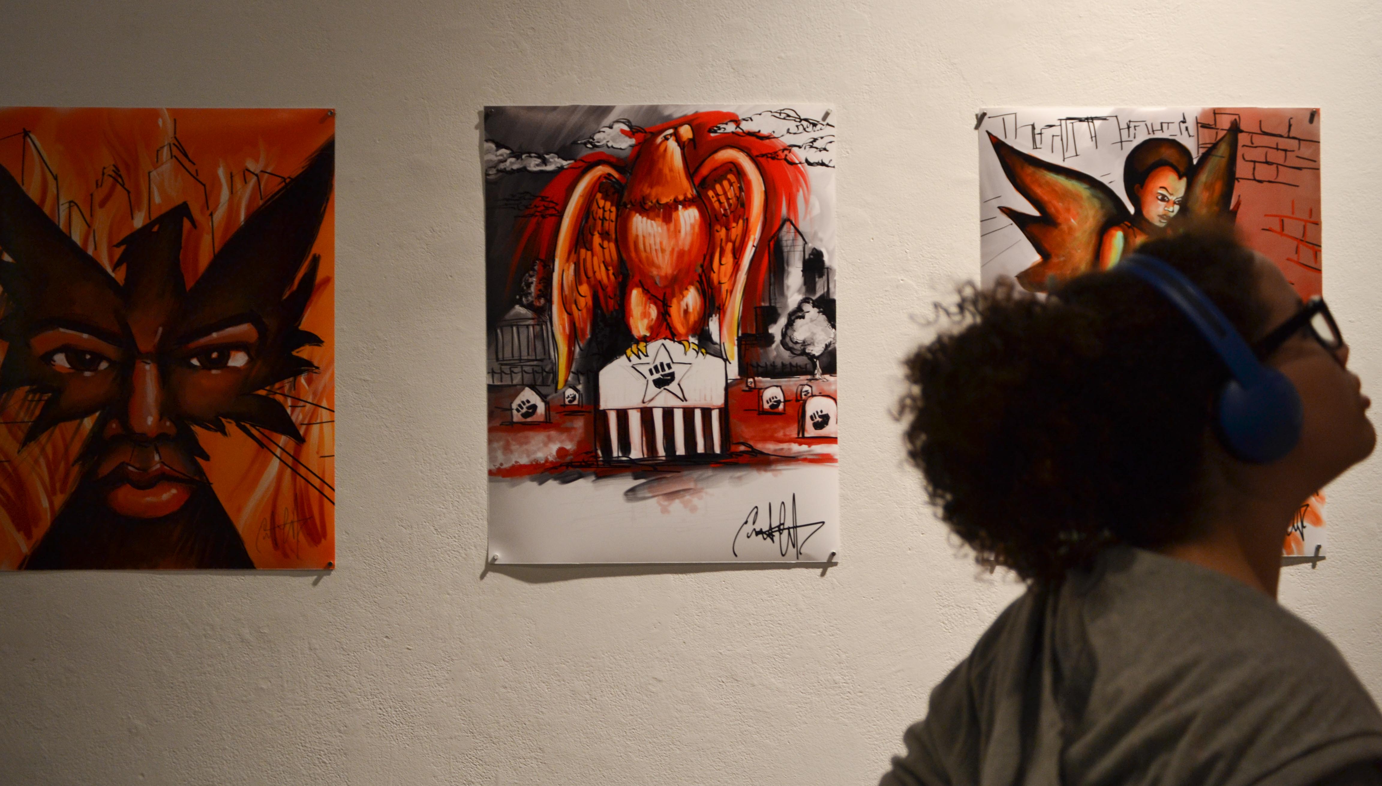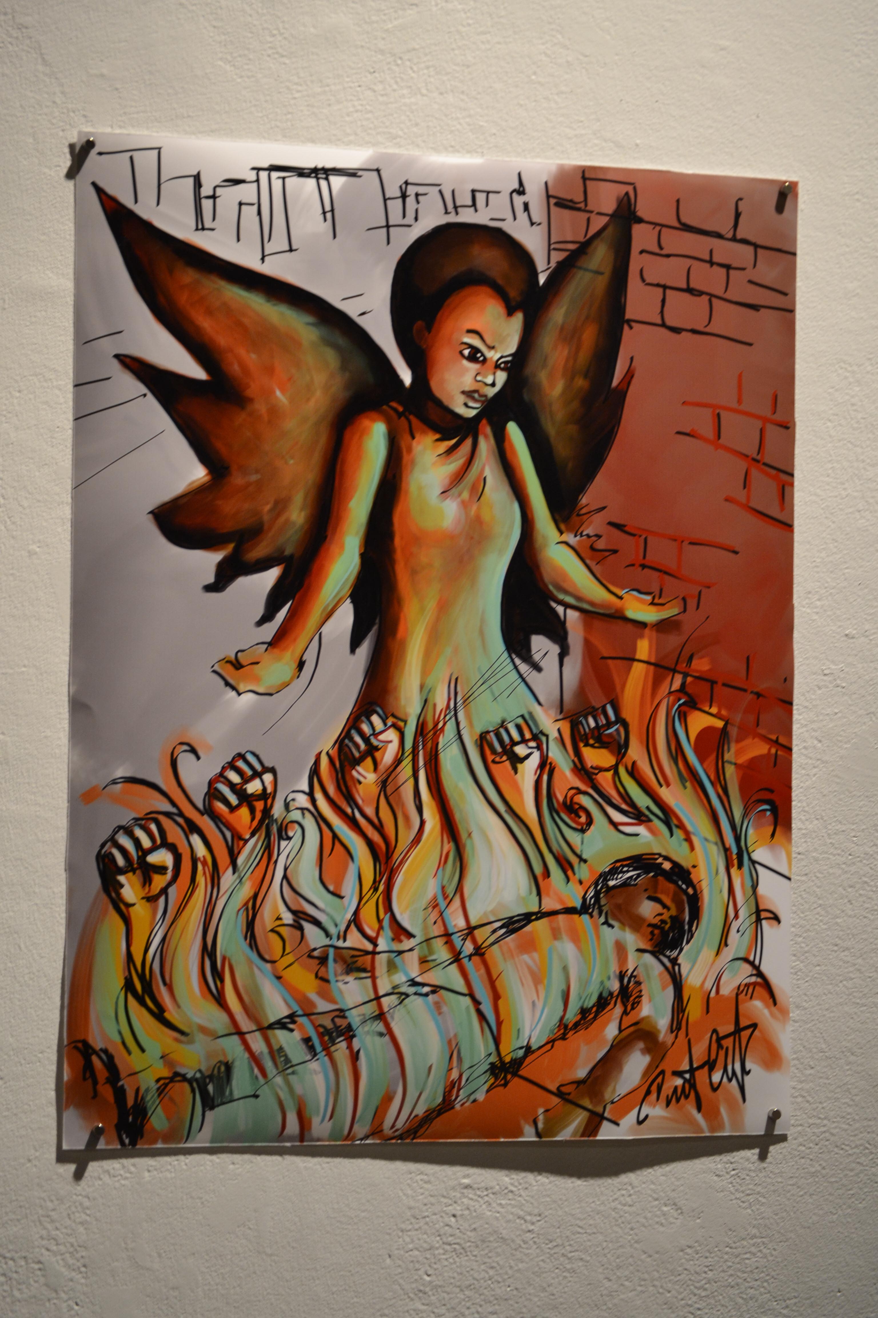 “A Black Phoenix Rising Art Experience” won’t be here for long, but it’s worth seeing while you still can. The exhibition, which opened yesterday evening and remains on display through this Sunday, is a collaboration between Associate Professor of African American Studies, Science in Society, and sociology Anthony Hatch; San Antonio-based artist Ernesto Cuevas Jr.; and students in Hatch’s Fall 2017 class “Black Phoenix Rising: Death and Resurrection of Black Lives.” The class studied the cultural and social institutions that justify the death and suffering of Black people and the ways that Black people have resisted such systems of oppression and reclaimed their lives.