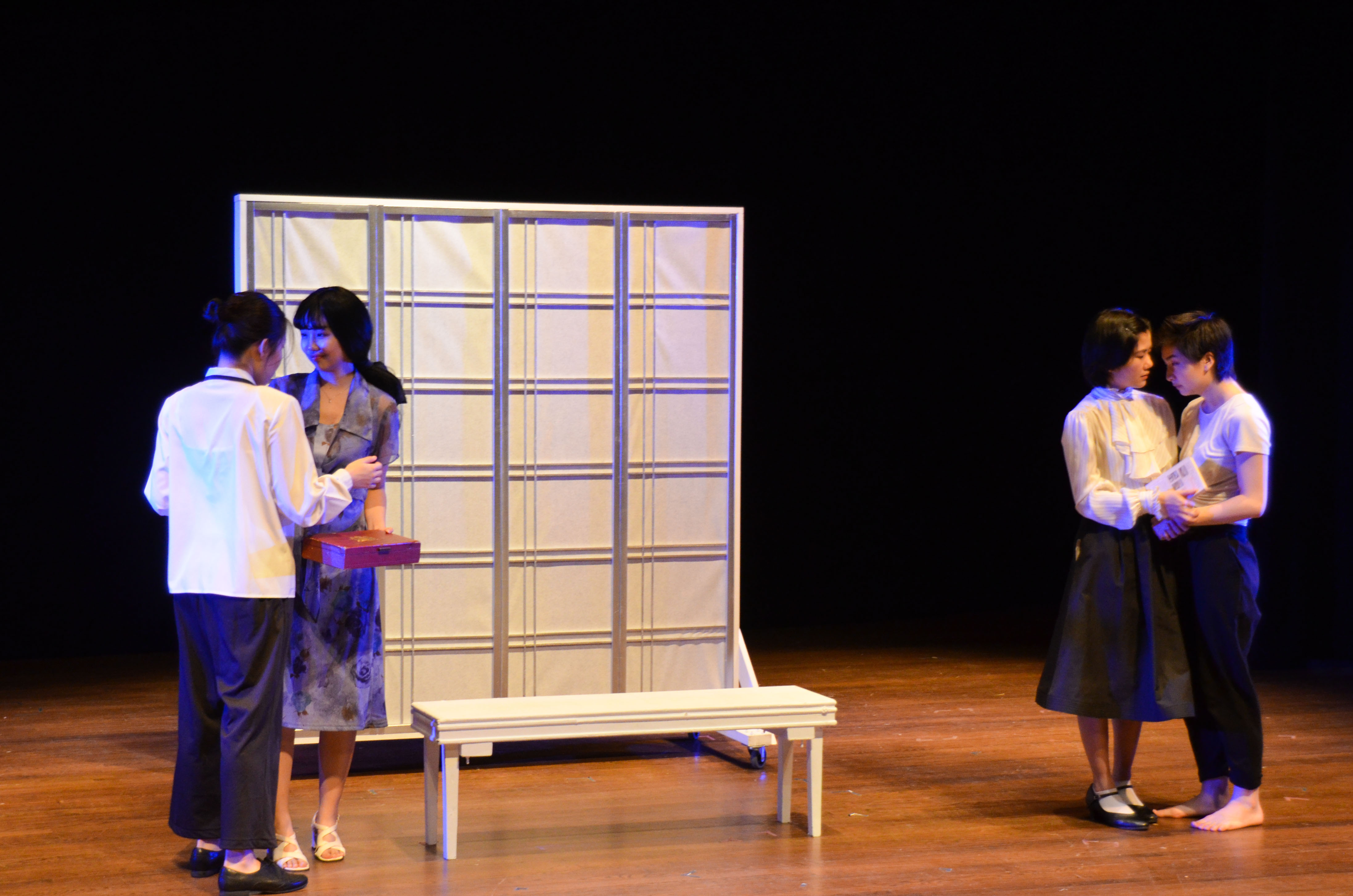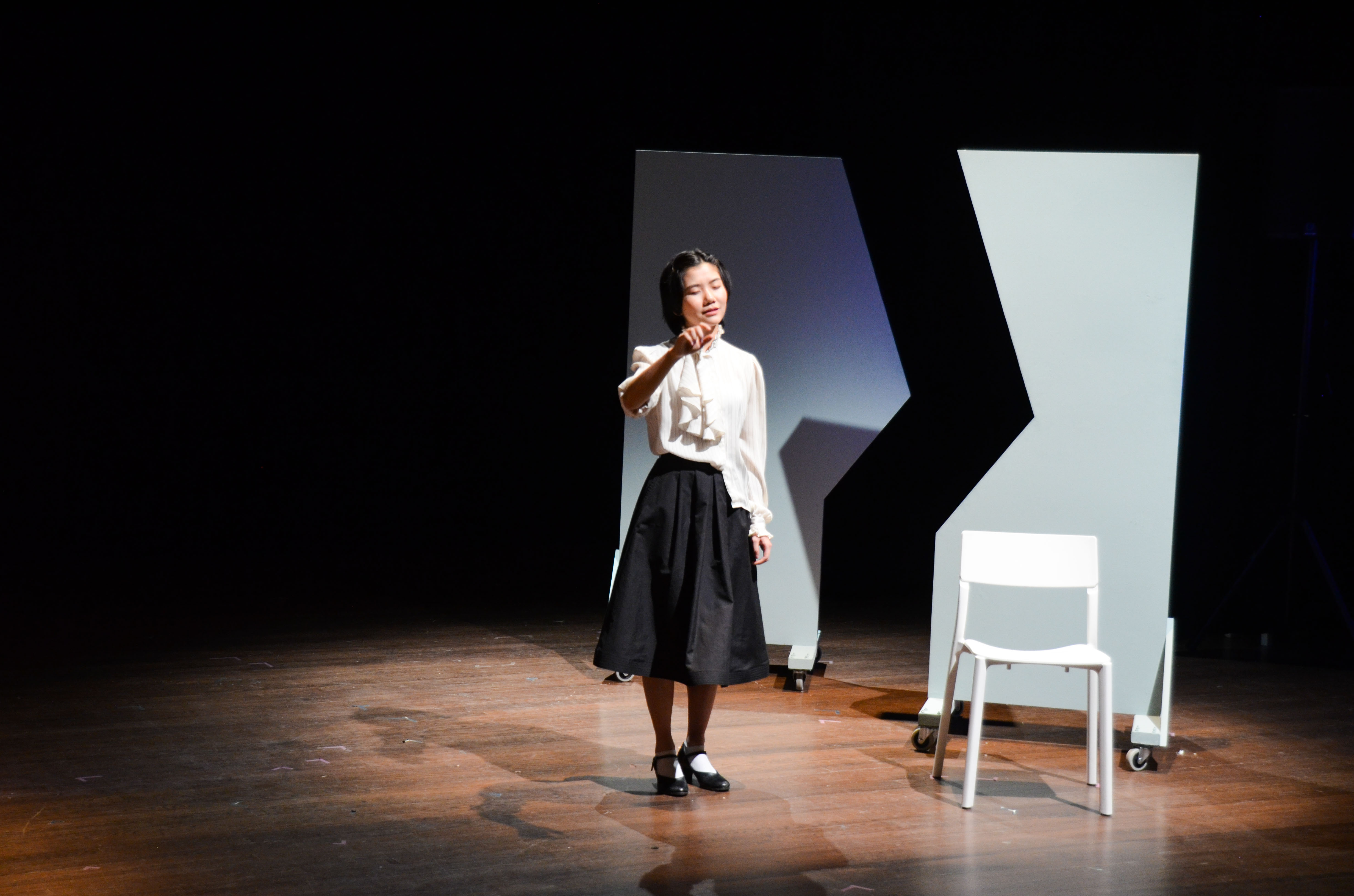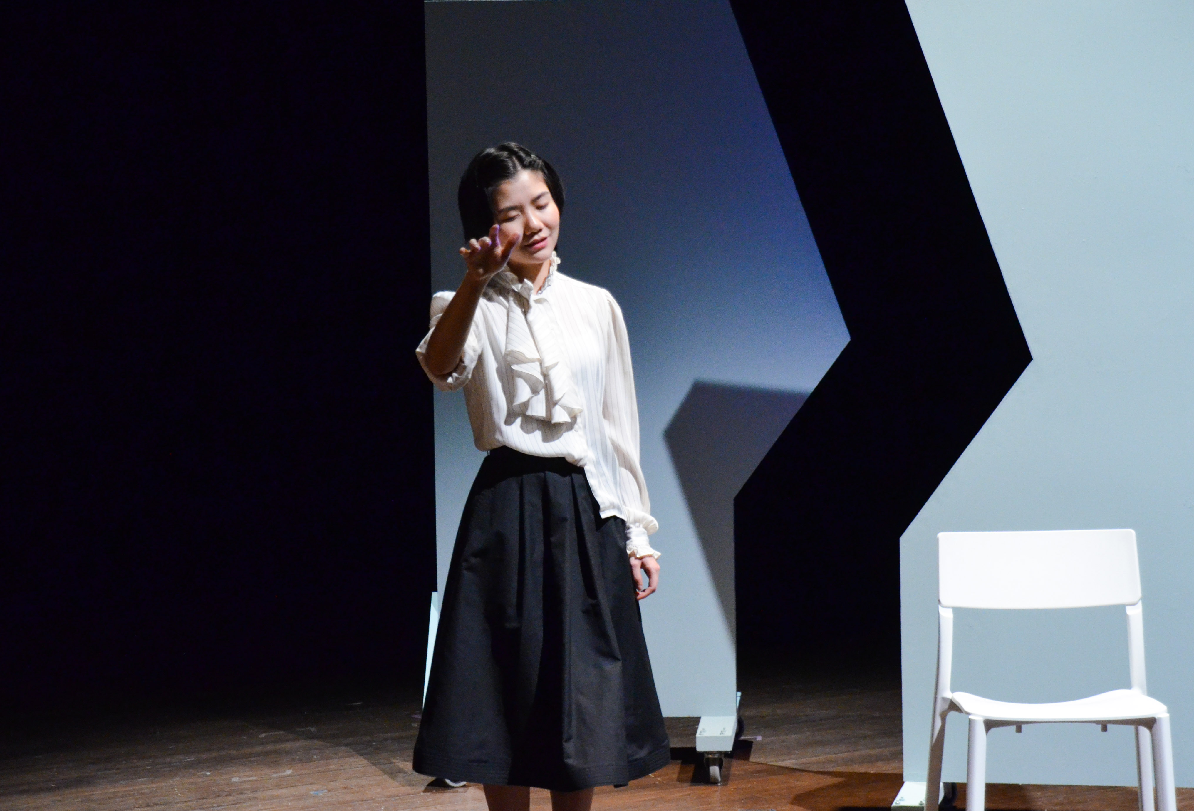 Working with a small cast and only a dozen or so props, it is remarkable what depth of emotion and complexity of plot the play achieves. There is a certain chiaroscuro surrounding the set, most evident in the wardrobe, dominated by black and white, rigid and geometric—but also flowing with the shared feature being pleats (designed by Lizzie Phan ’19 and Hanshu Wang ’21). As the play weaves through the lives of three women as portrayed by five separate actresses, all of their experiences unfold as distinct and yet superimposed over one another, to the effect of seeing double—quintuple, even. It is in this collectively hallucinatory fashion that the play reaches its conclusion, all five actresses standing as one, bathed in a blue light.