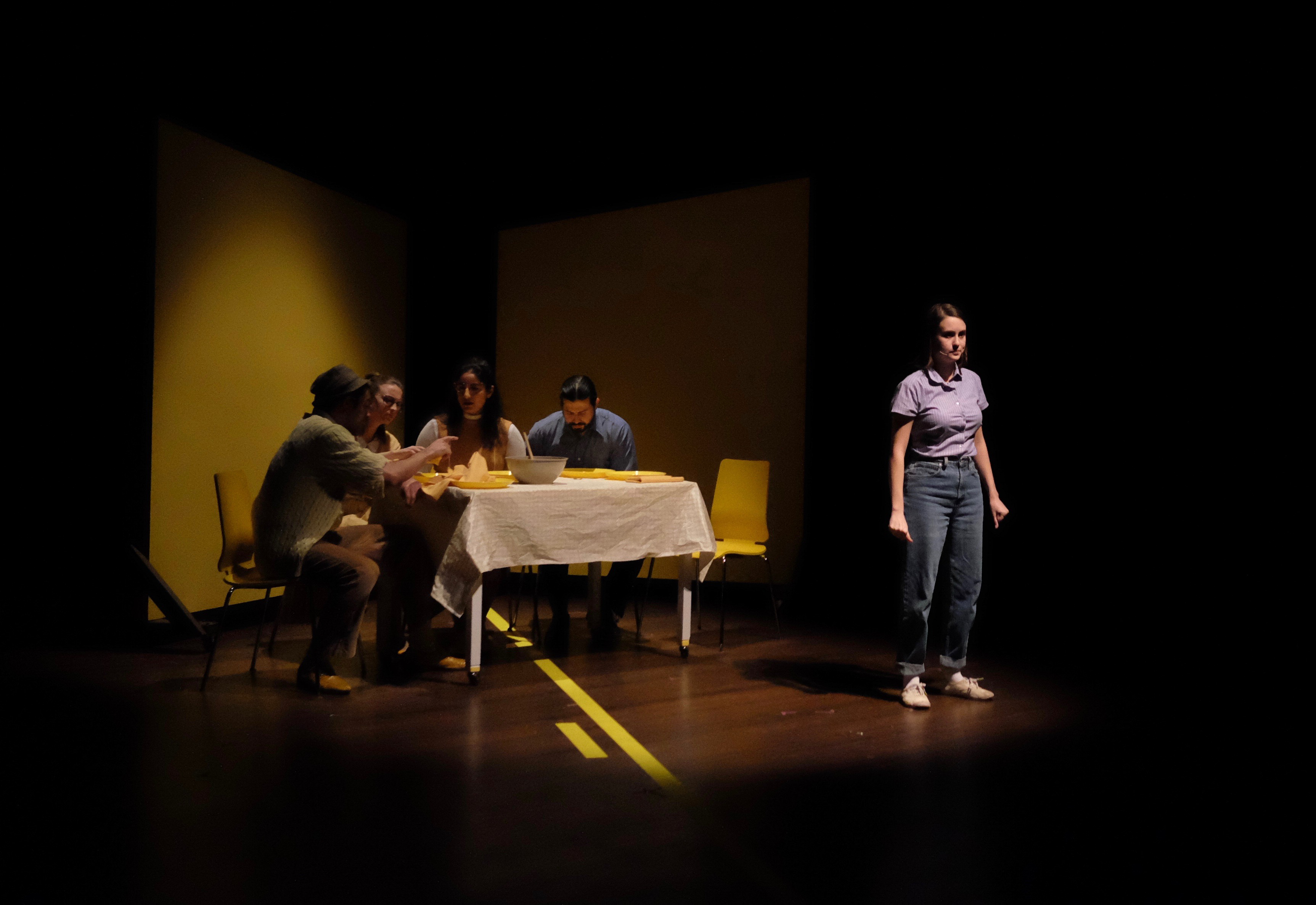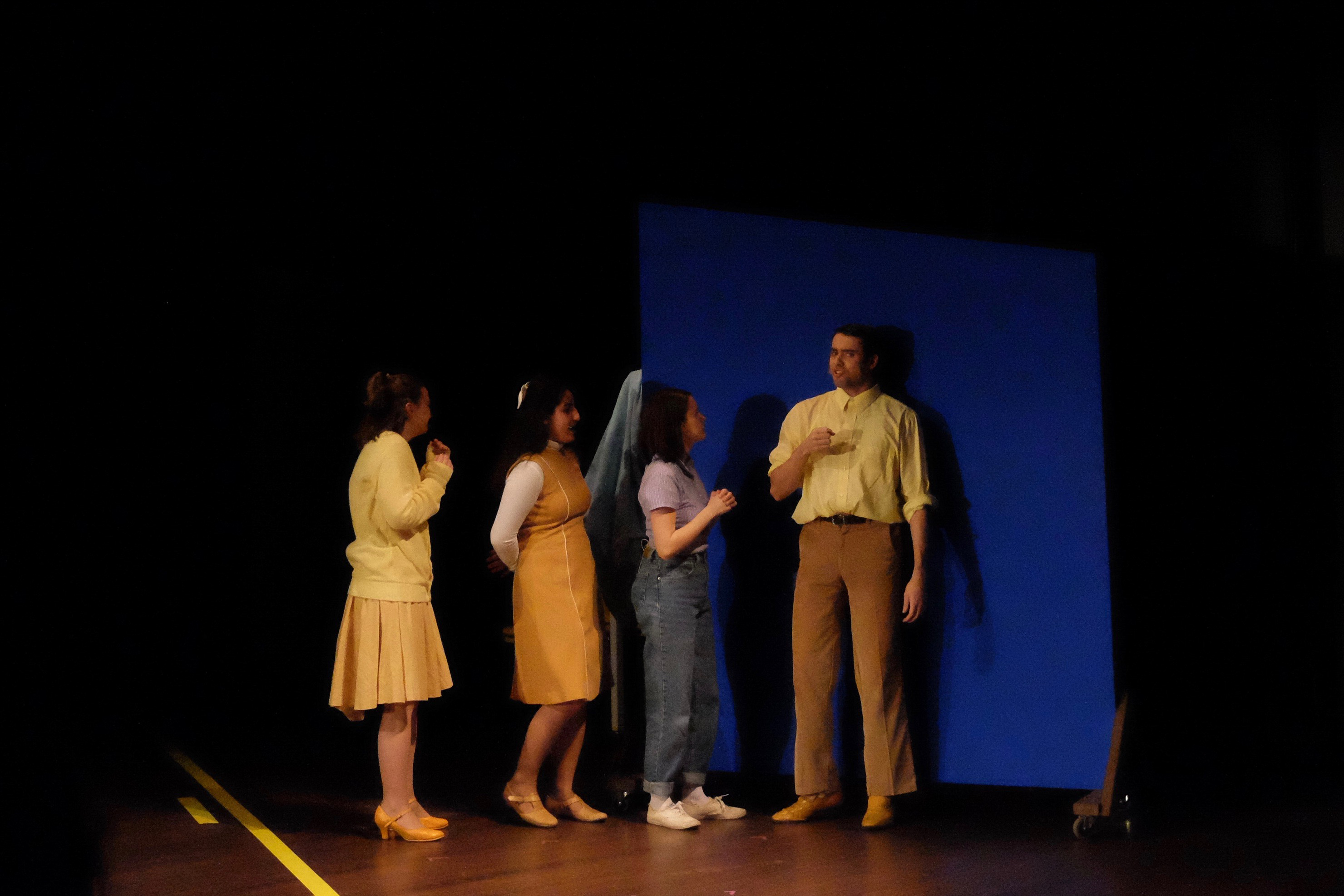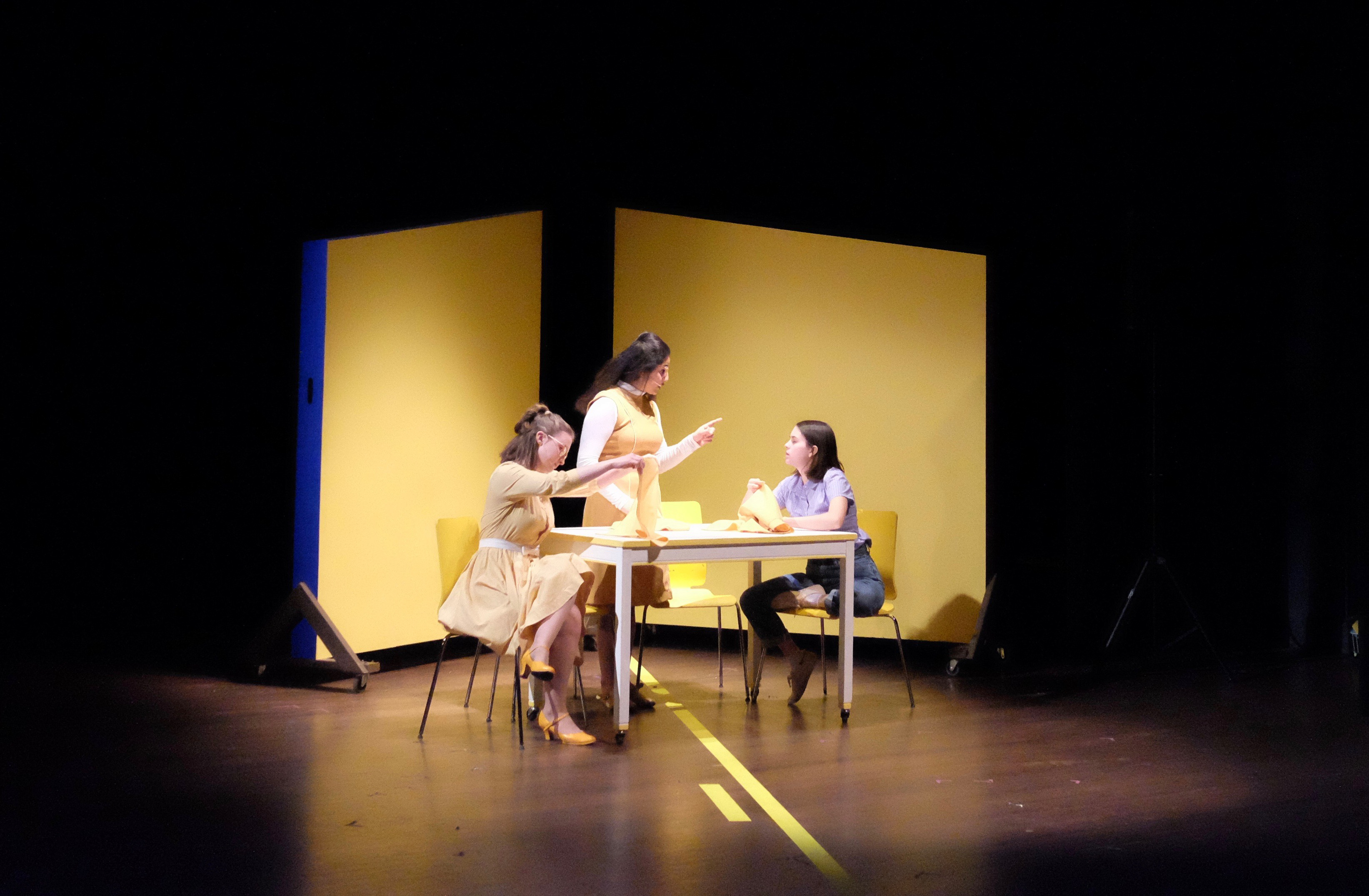 Li’l Bit and Uncle Peck appear on stage first, both dressed in blue and soon thrown into contrast against the yellow outfits of the ensemble, whose members constantly shifted roles, stepping in as servers, classmates, and other extras. The dishes and the movable walls are the same shade of pop-y yellow. Throughout the play, color continues to separate Li’l Bit and Uncle Peck from the rest of the cast and the world around them while creating the recognizable backdrop of a mythologized American mid-century.