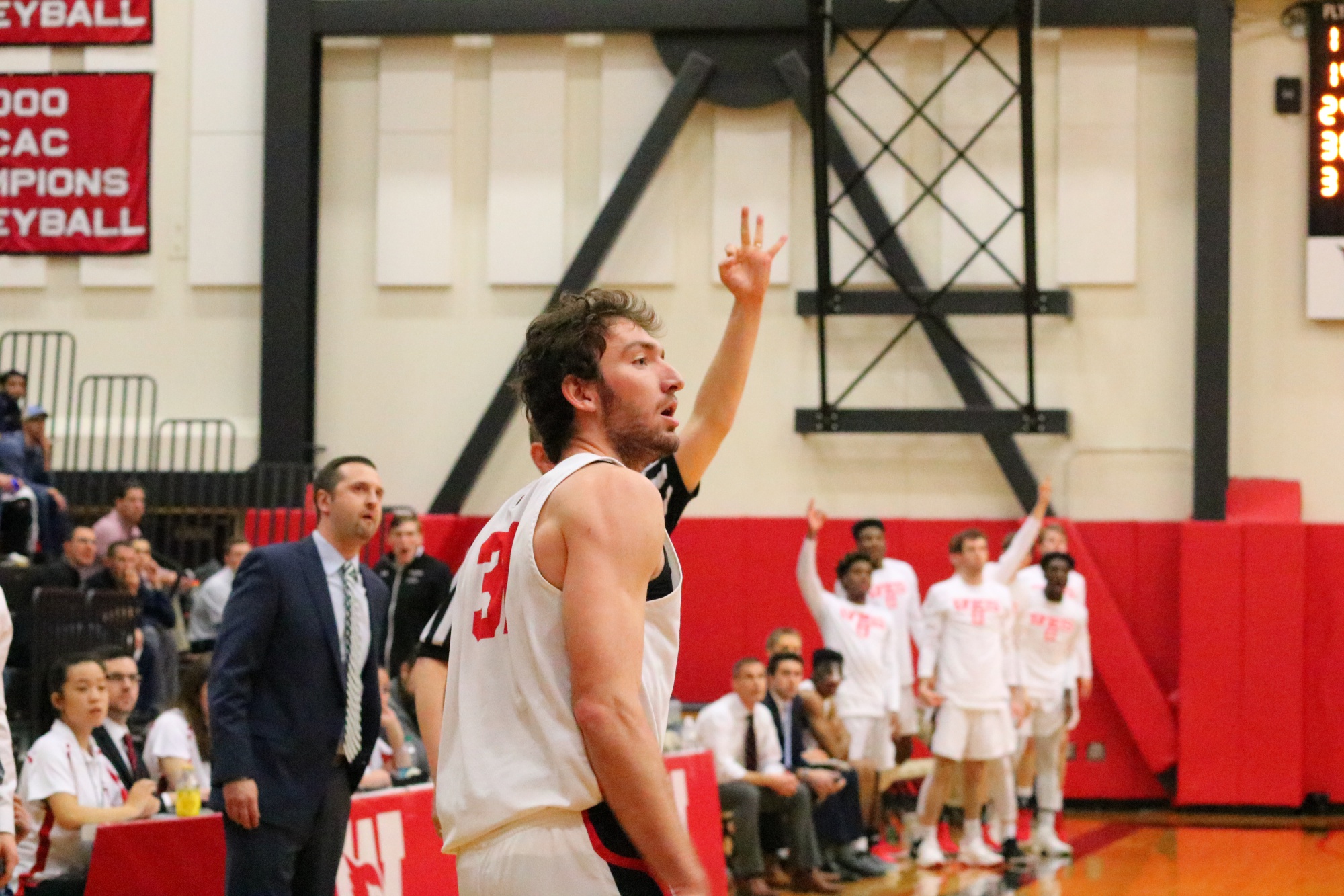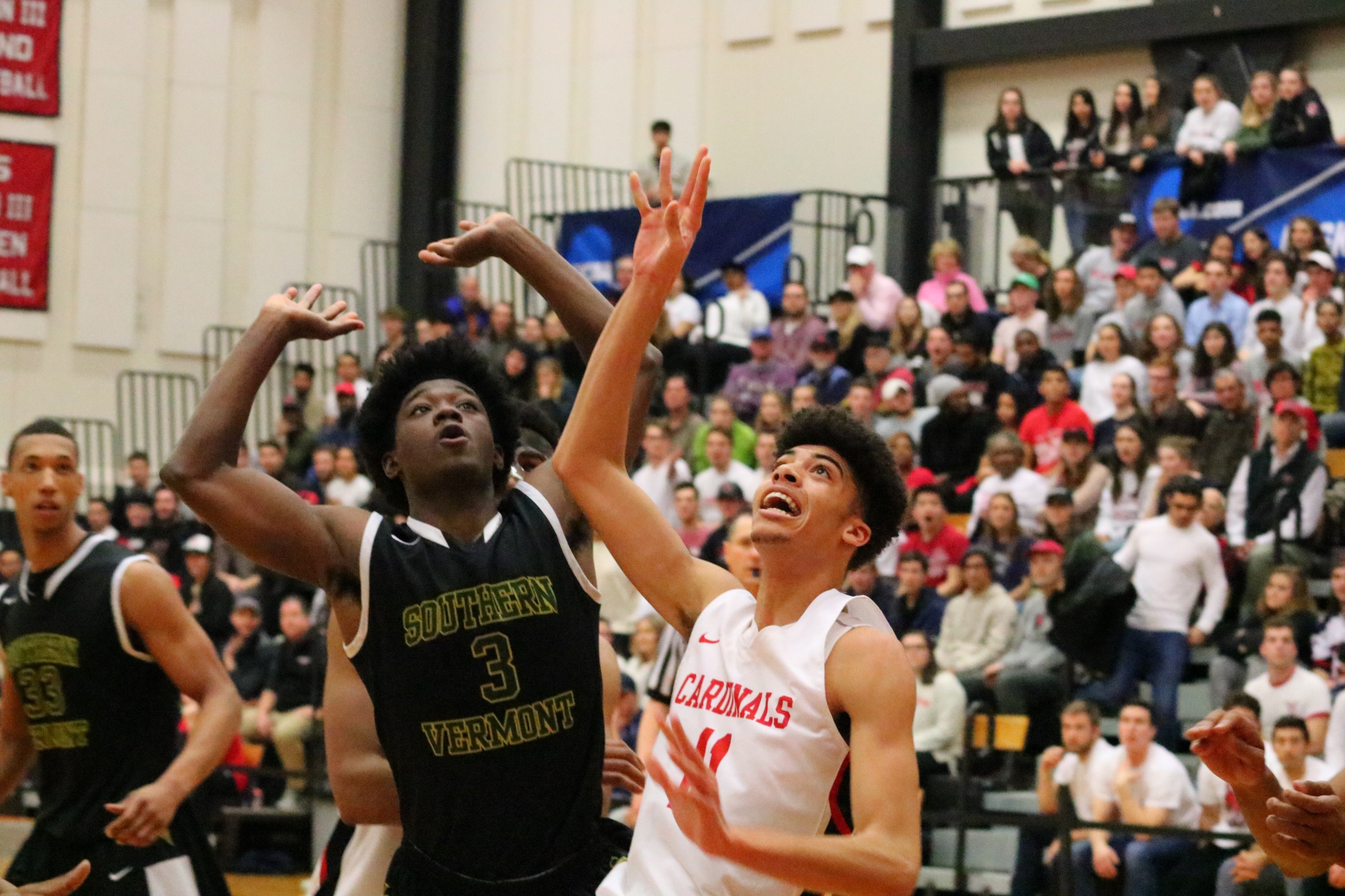 In the victory against Southern Vermont, the Cards were on fire offensively, shooting 14-31 from three-point range and 53.6 percent from the field. They were led by NESCAC Rookie of the Year Austin Hutcherson ’21, who poured in a career-high 33 points including drilling 7-9 3-point attempts. The Cardinals used their impressive height to dominate Southern Vermont on the boards, grabbing 50 rebounds to only 25 for Southern Vermont. This was their first-ever NCAA Tournament victory, which allowed them to advance for a matchup against Swarthmore the next night.