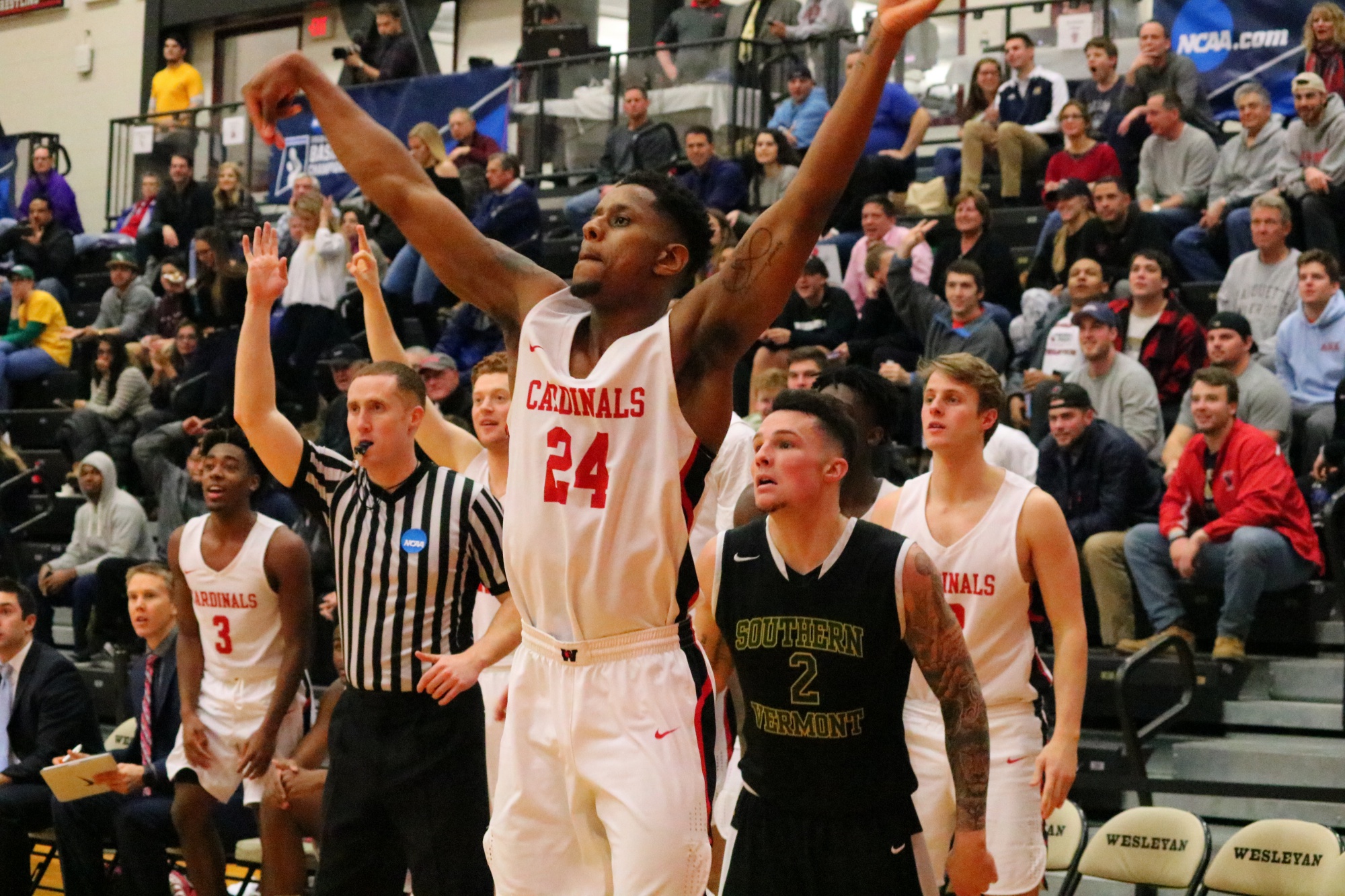 Following a stellar season, the Wesleyan men’s basketball team gained an at-large berth in the NCAA Division III Tournament. In the first two rounds of the tournament, played on March 2 and 3 at Silloway Gymnasium, the Cardinals had two games on opposite ends of the spectrum: they beat Southern Vermont College 101-71 on Friday in the first round before losing 97-75 to Swarthmore on Saturday.