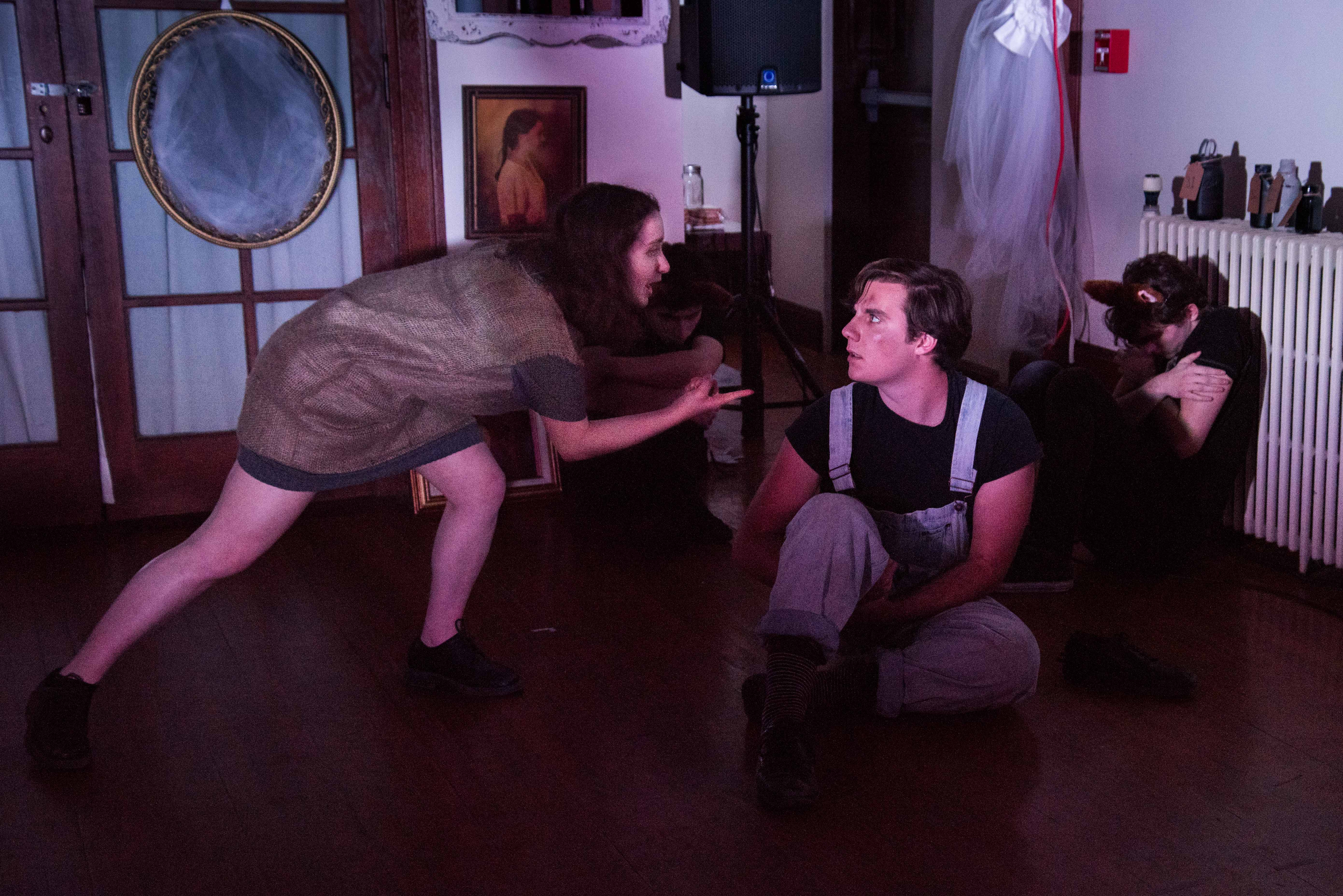 Walking into the Alpha Delt Green Room for Second Stage’s production “Constance and Sinestra and the Cabinet of Screams,” one might have thought they had walked into a haunted house. The entire cast of the musical stands facing the audience, gazing forward with blank stares while grim lighting and the sound of creaking floorboards only accentuates the level of creepiness. The strange opening tableau elicited a number of reactions as the audience settled into their seats: nervous laughter, uncomfortable silence, and the unnerving feeling of being both the observer and the observed. But more than anything, the blank stares offered an unrelentingly close connection between the actors and the audience. It’s a fitting choice for a play whose story creates increasingly grotesque, yet surprising, ways of probing the audience due to its own complicit relationship with this tragic fable.