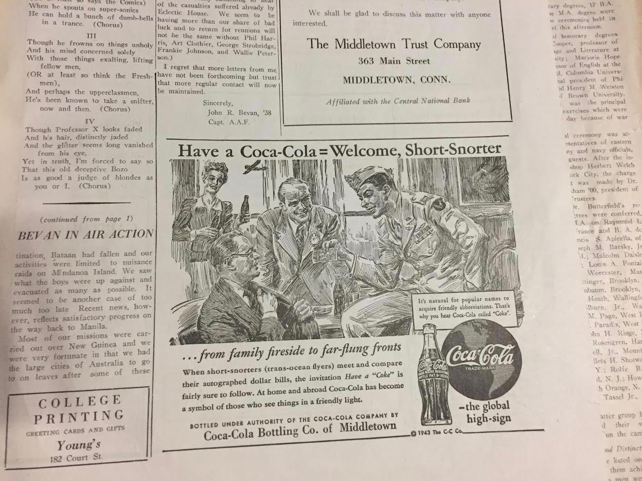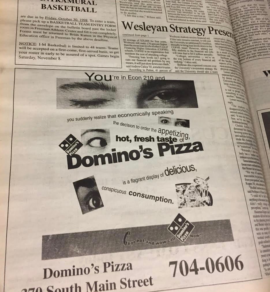 The Argus, which is now celebrating its 150th year in print, has long been a haven for local advertisers—mostly Middletown restaurants and on-campus events. In decades past, however, we also housed ads from larger, national companies, such as Coca-Cola, Domino’s, and Brooks Brothers, which reflects the changing role of local newspaper advertising through the past century and a half.