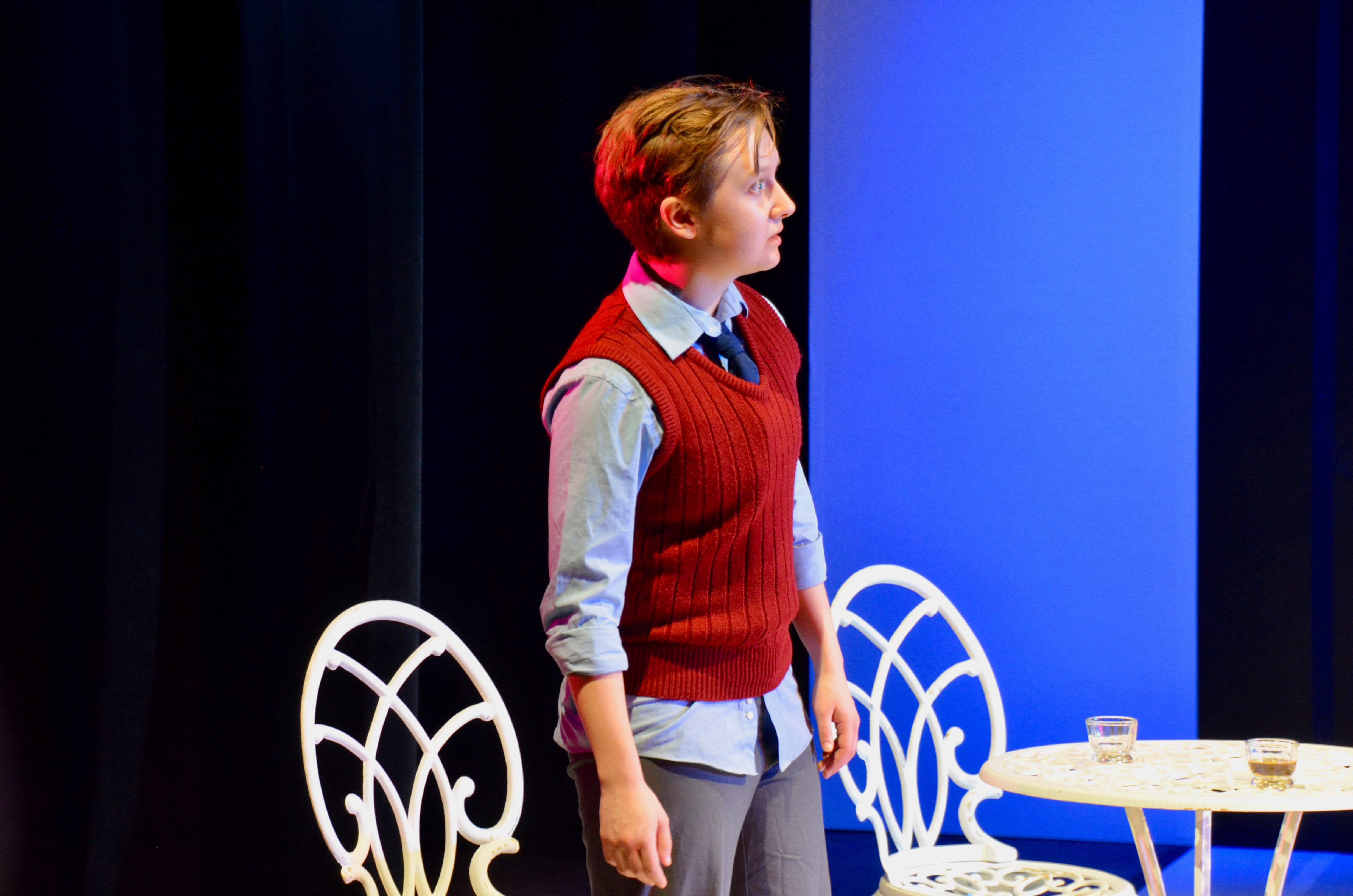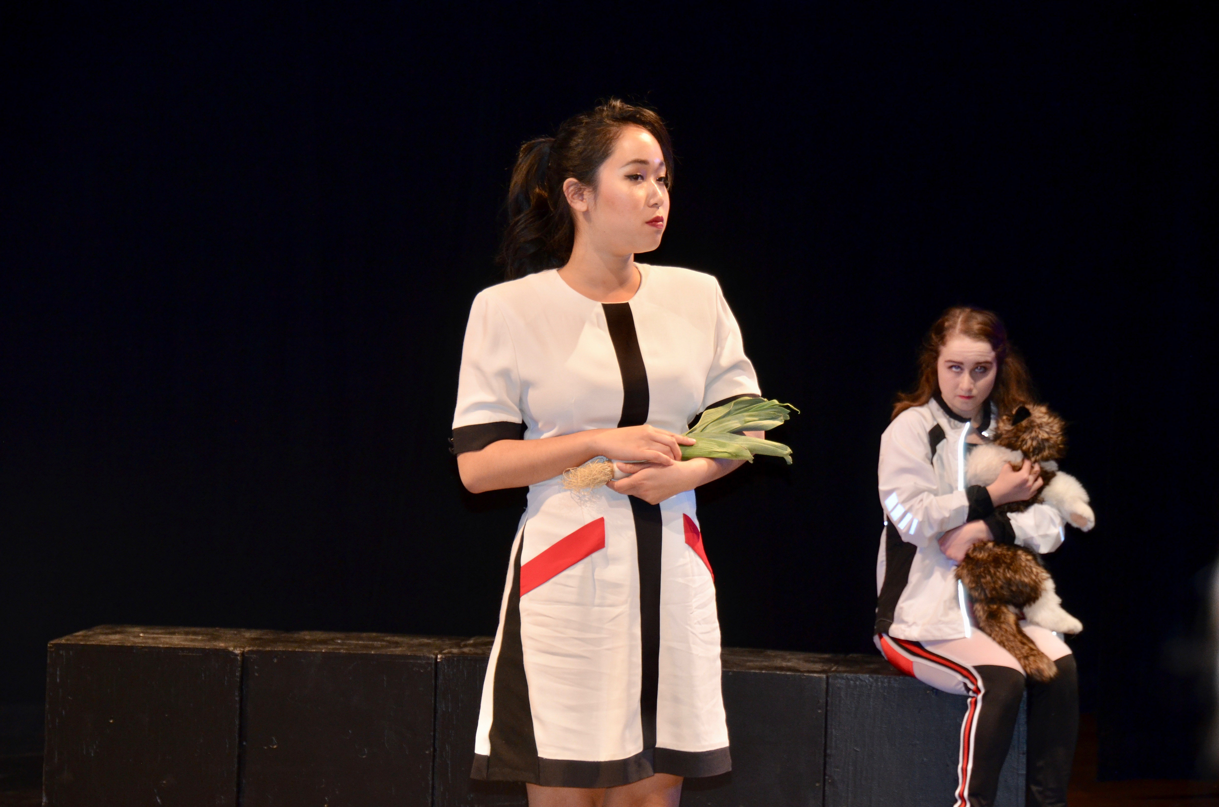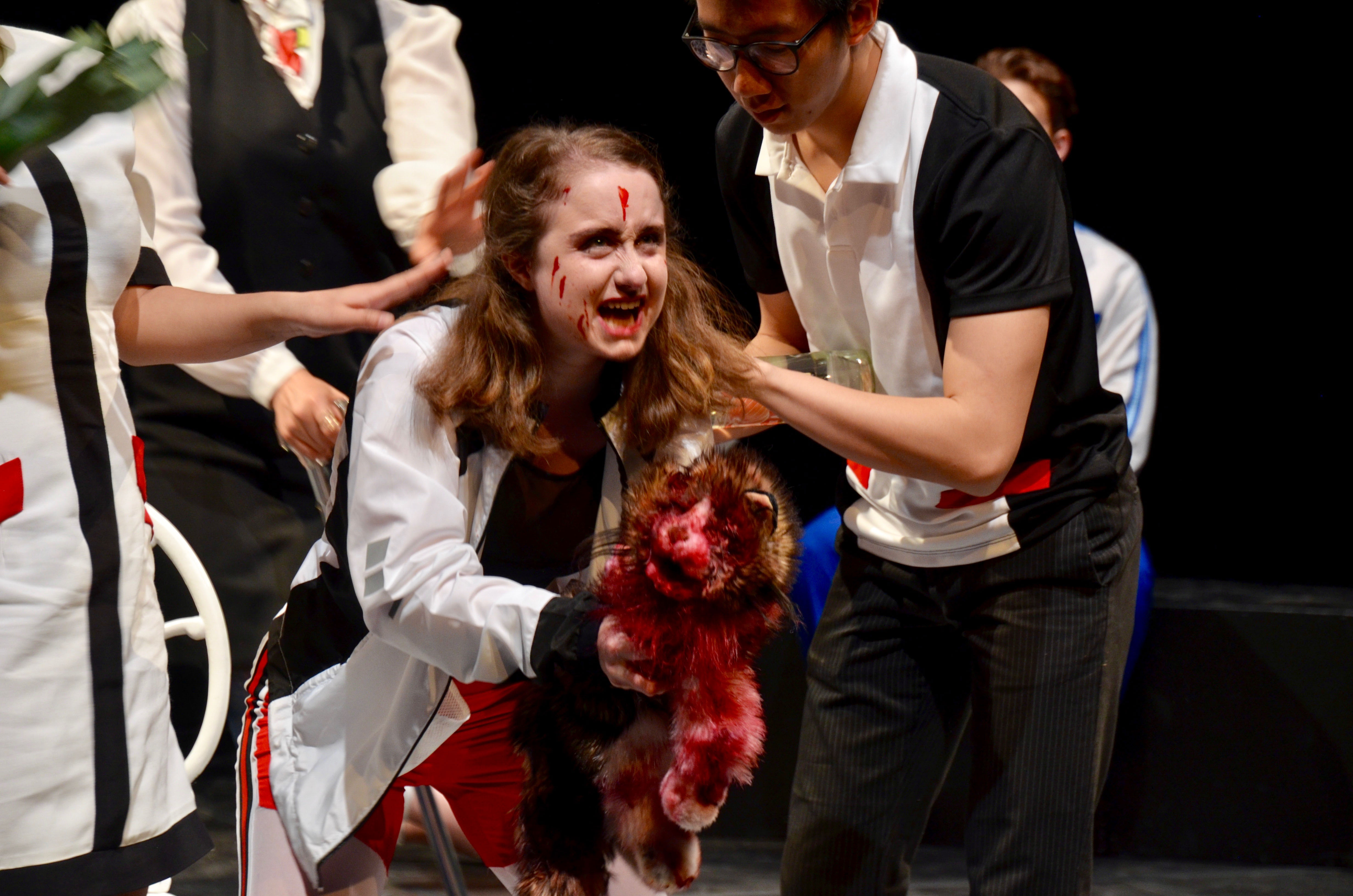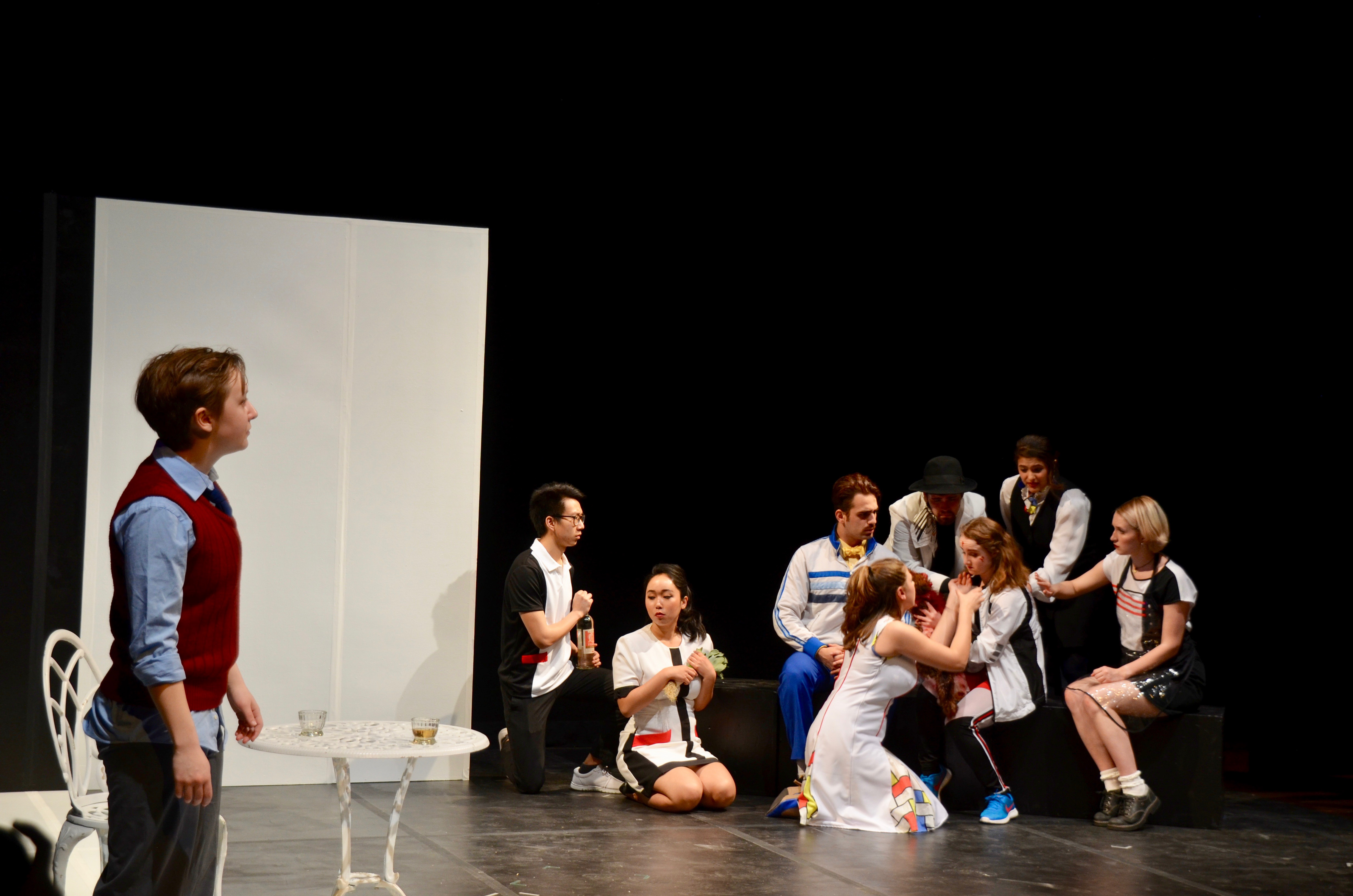 The cast of actors also helped this disorientation. Different conversations between characters would overlap at unusual points. Sometimes the audience had to swivel back and forth between different conversations happening simultaneously. Even worse, Fromm portrays Berenger realistically, but every other character acts more and more like caricatures. Sometimes the characters—like the housewife portrayed by Nicole Boyd ’18—are over the top to the point of hilarity. Other characters are maddening in their resistance to any semblance of reality. Tragash spoke about the acting of the play.