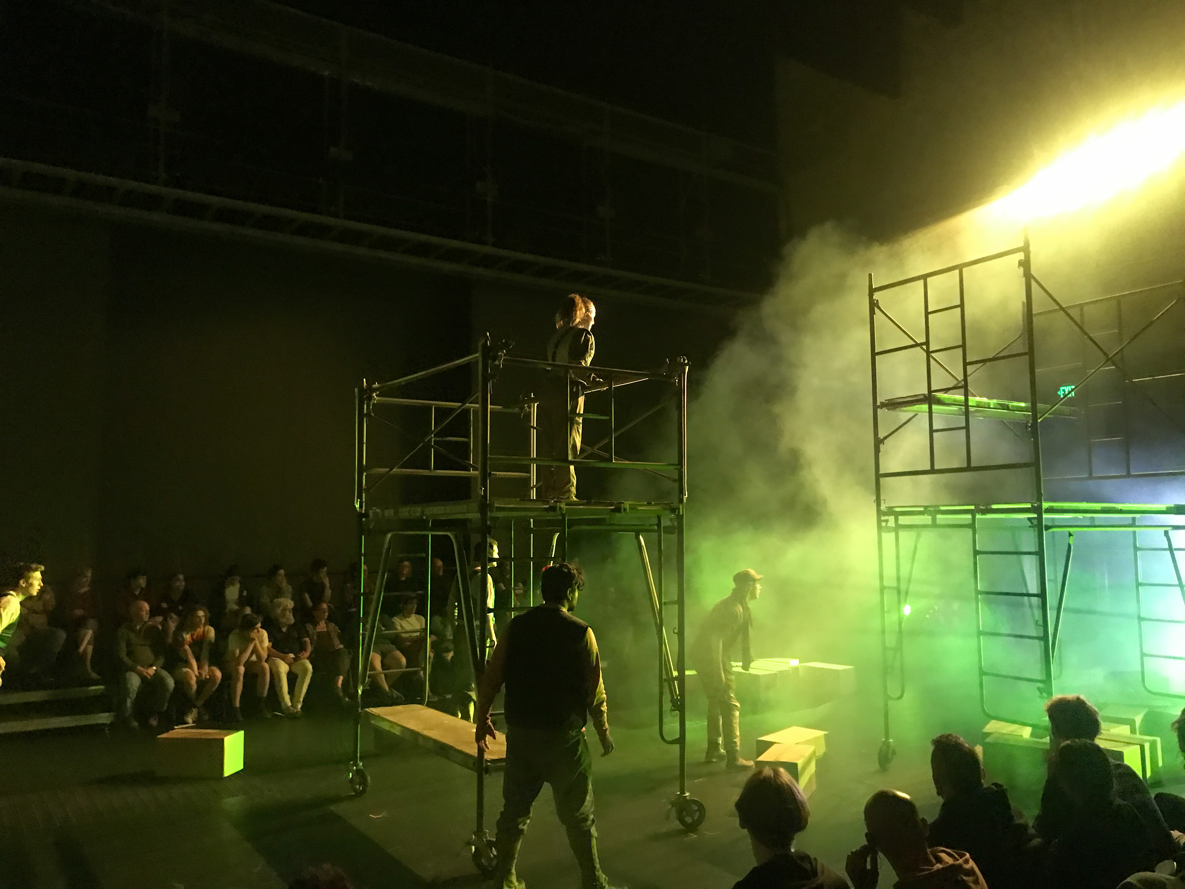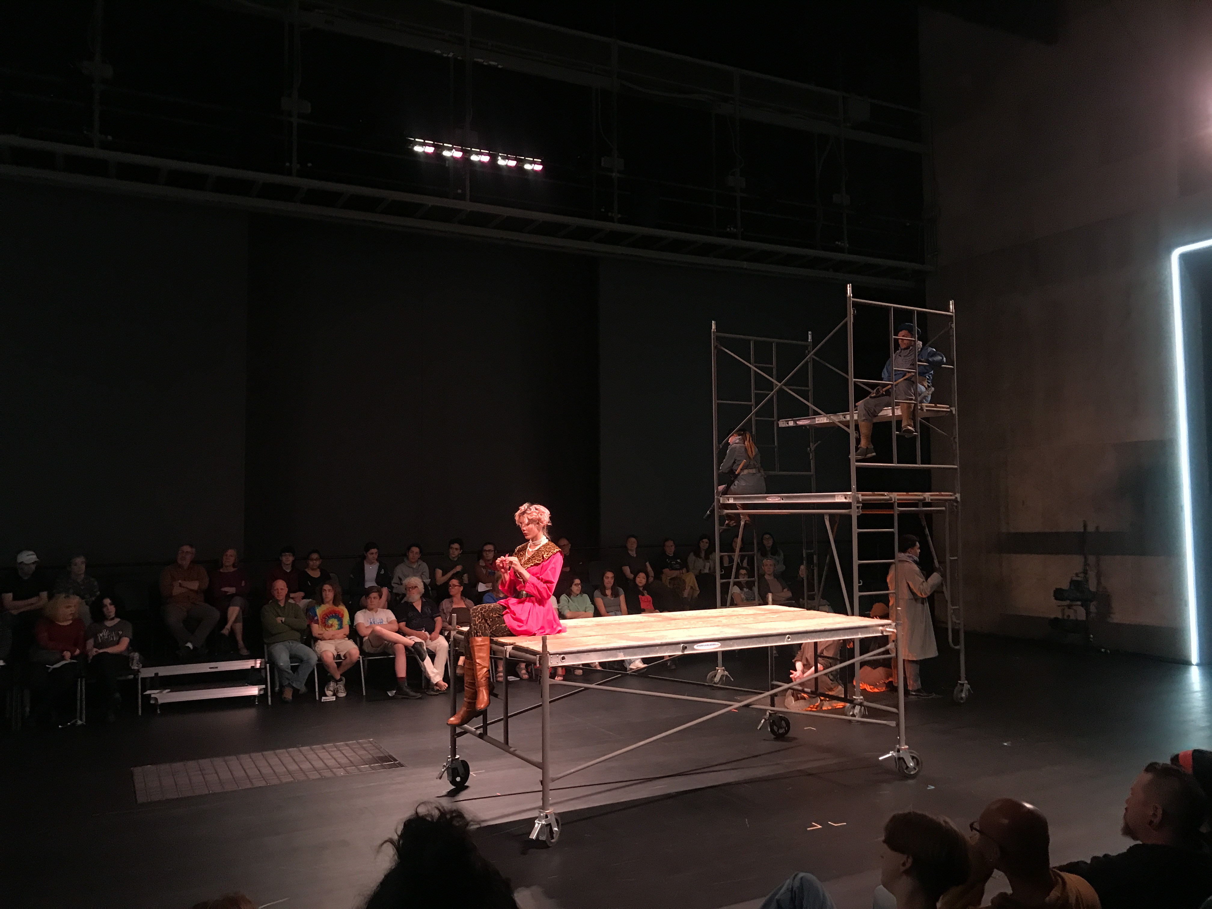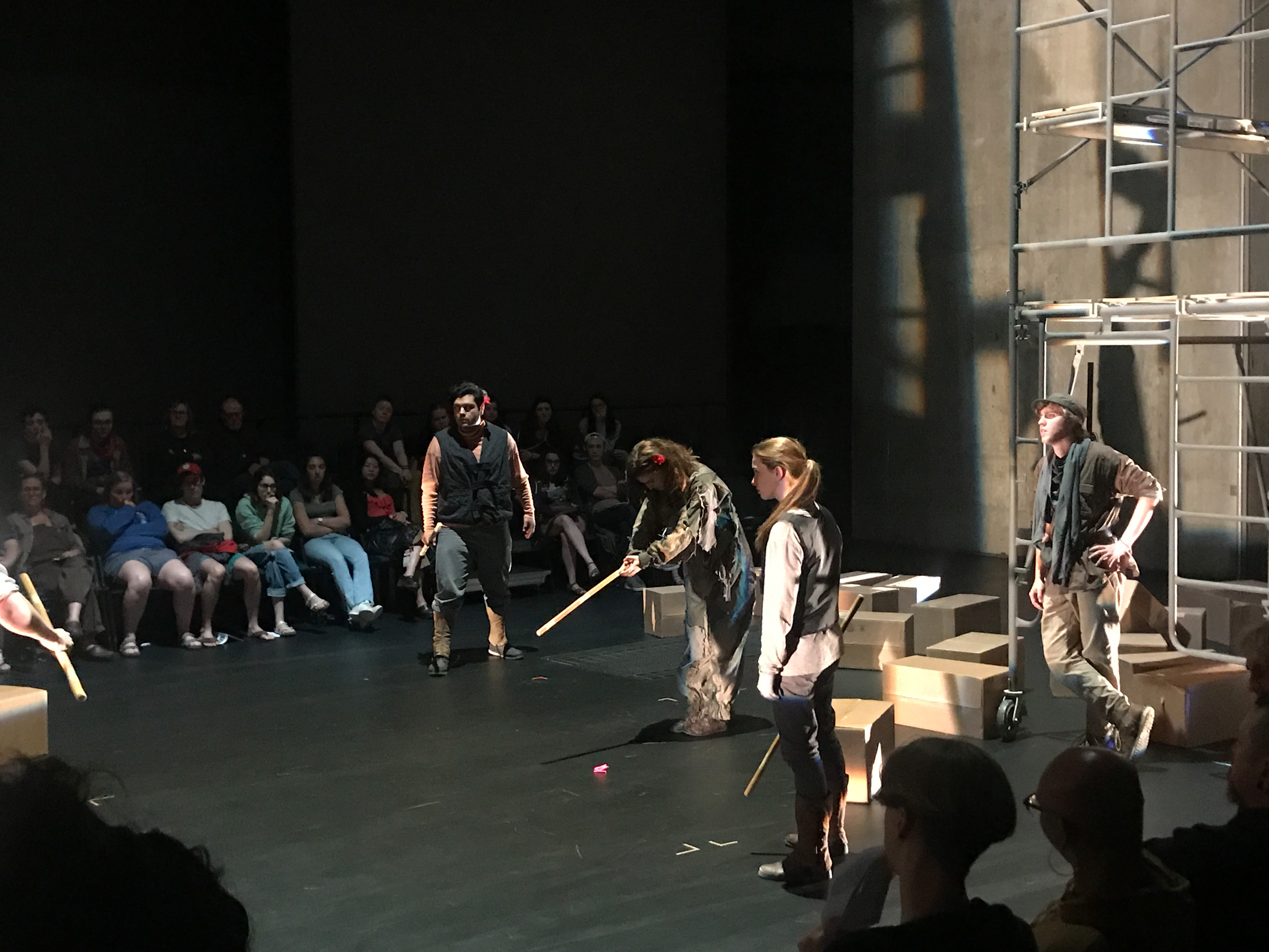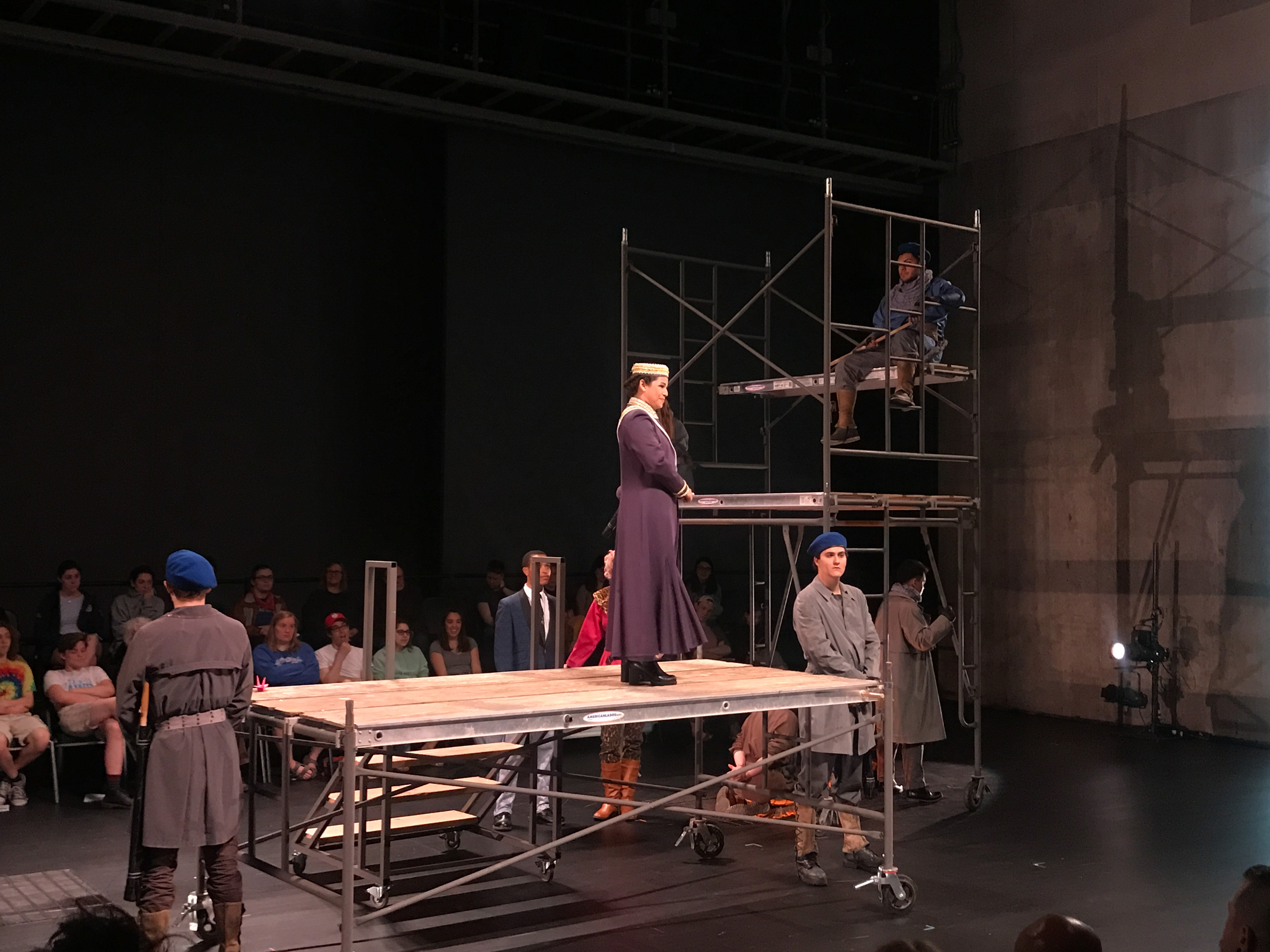 Quite contrary to the elaborate costumes, the set design was extremely simple and stripped down. It consisted mainly of scaffolding build of wooden planks and metal pipes. These pieces were movable and served many purposes throughout the play. The set was evocative of the classic design of Jonathan Larson’s “Rent”: simple and utilitarian, yet useful and effective. It remained dynamic despite its simplicity because of the level to which the actors interacted with the set pieces.