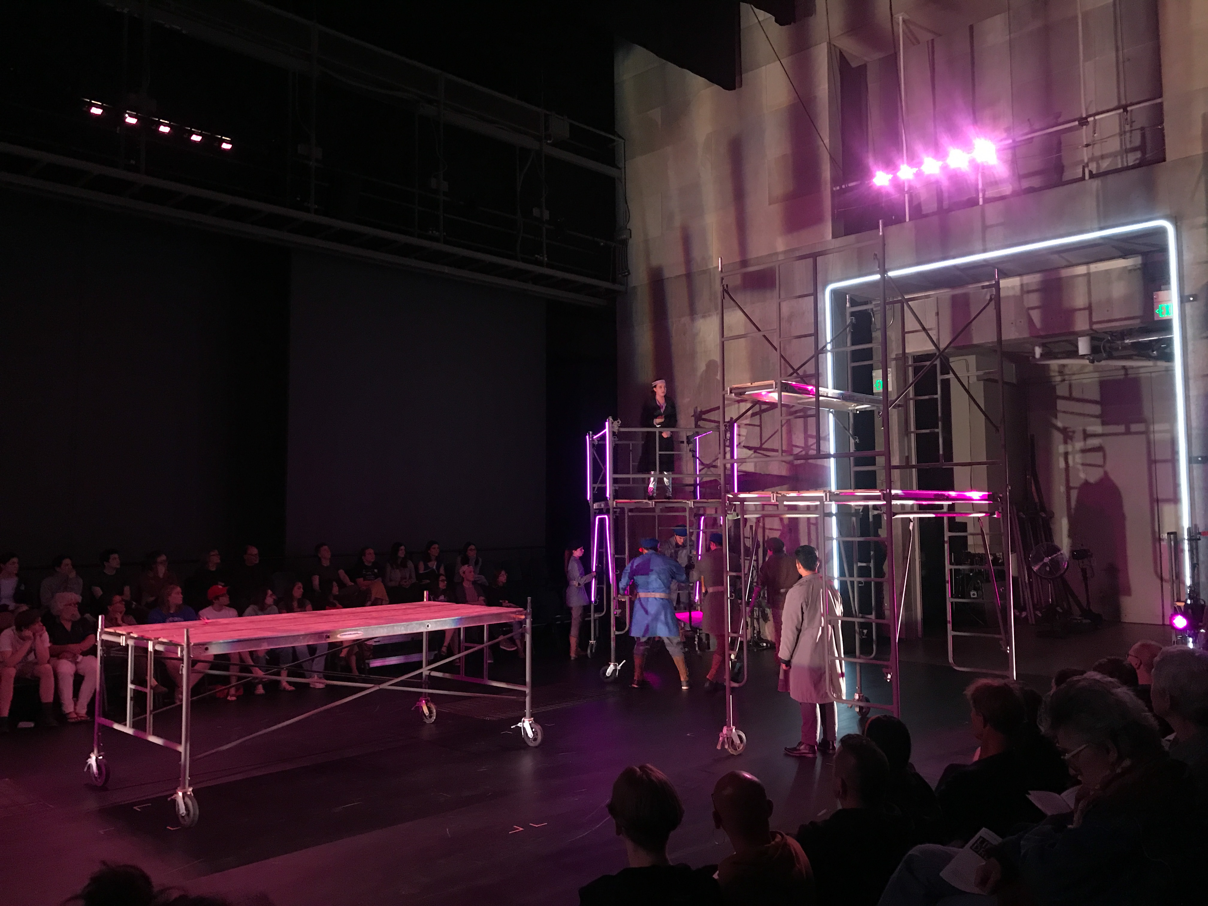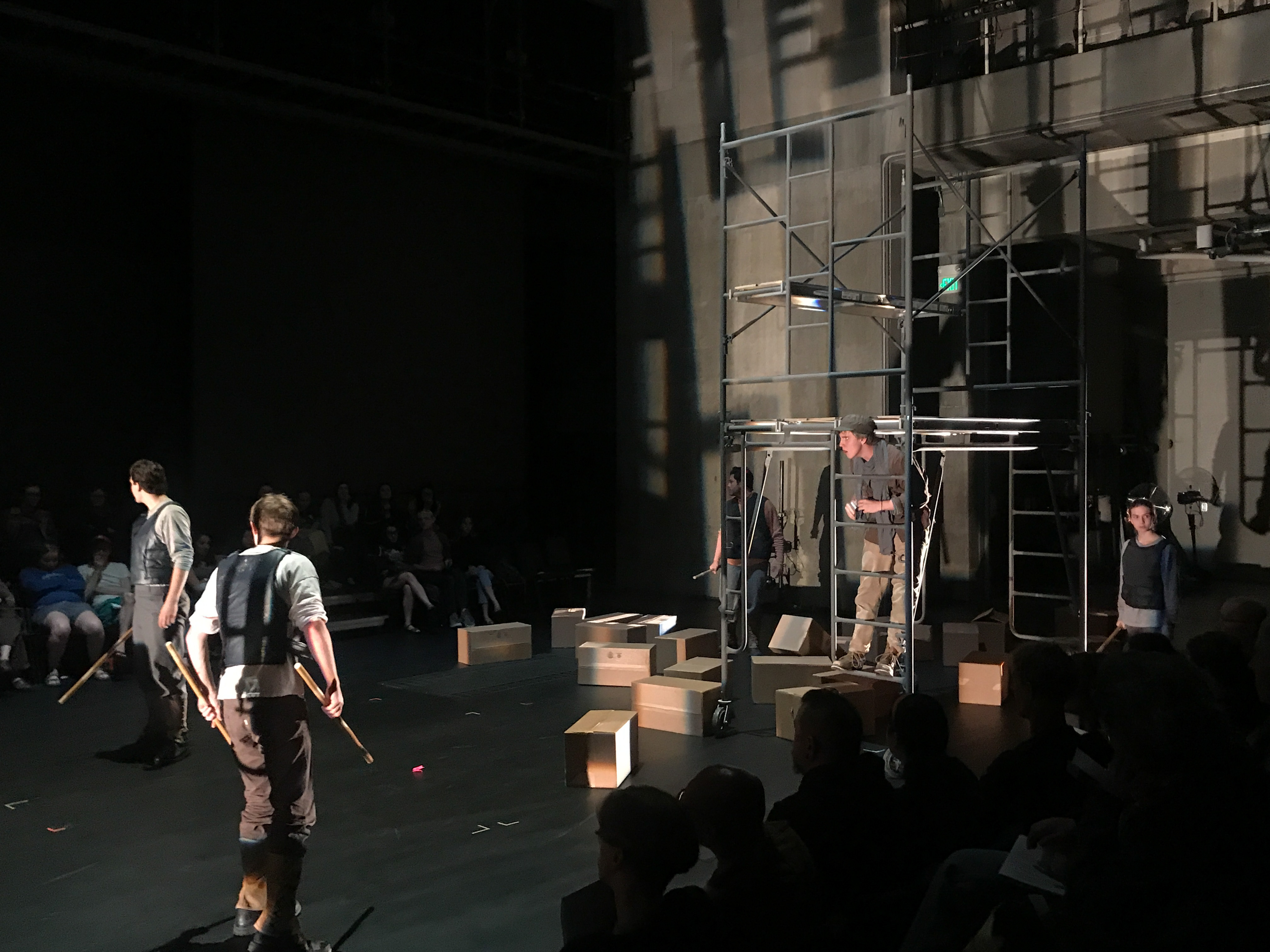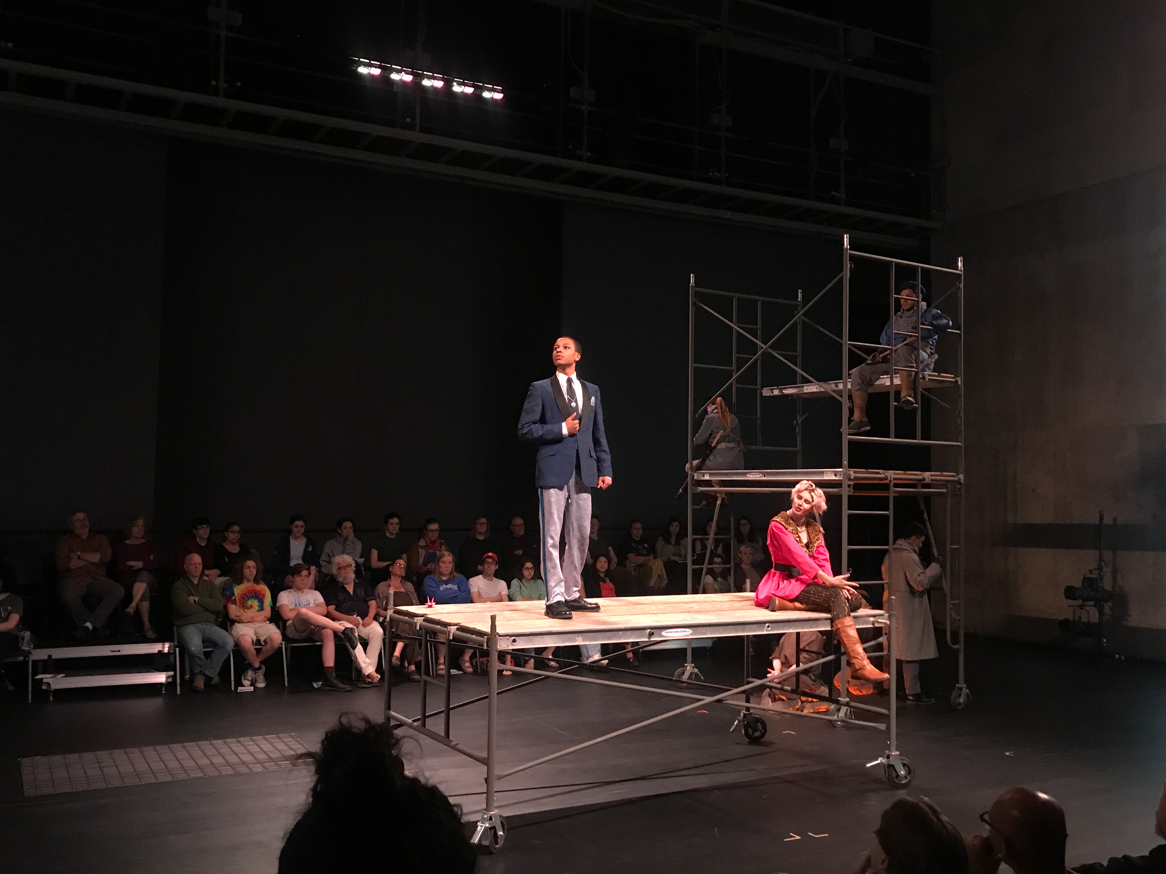 Quite contrary to the elaborate costumes, the set design was extremely simple and stripped down. It consisted mainly of scaffolding build of wooden planks and metal pipes. These pieces were movable and served many purposes throughout the play. The set was evocative of the classic design of Jonathan Larson’s “Rent”: simple and utilitarian, yet useful and effective. It remained dynamic despite its simplicity because of the level to which the actors interacted with the set pieces.