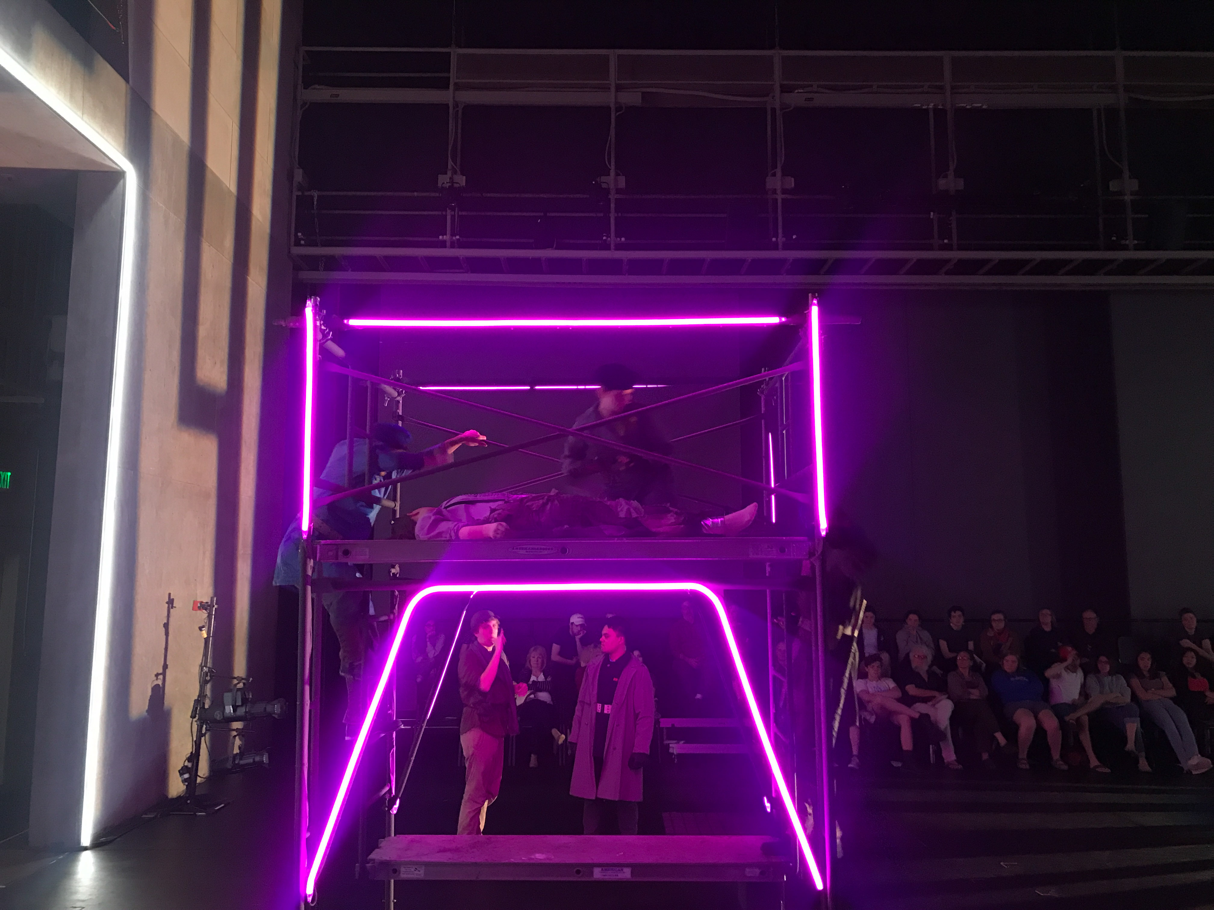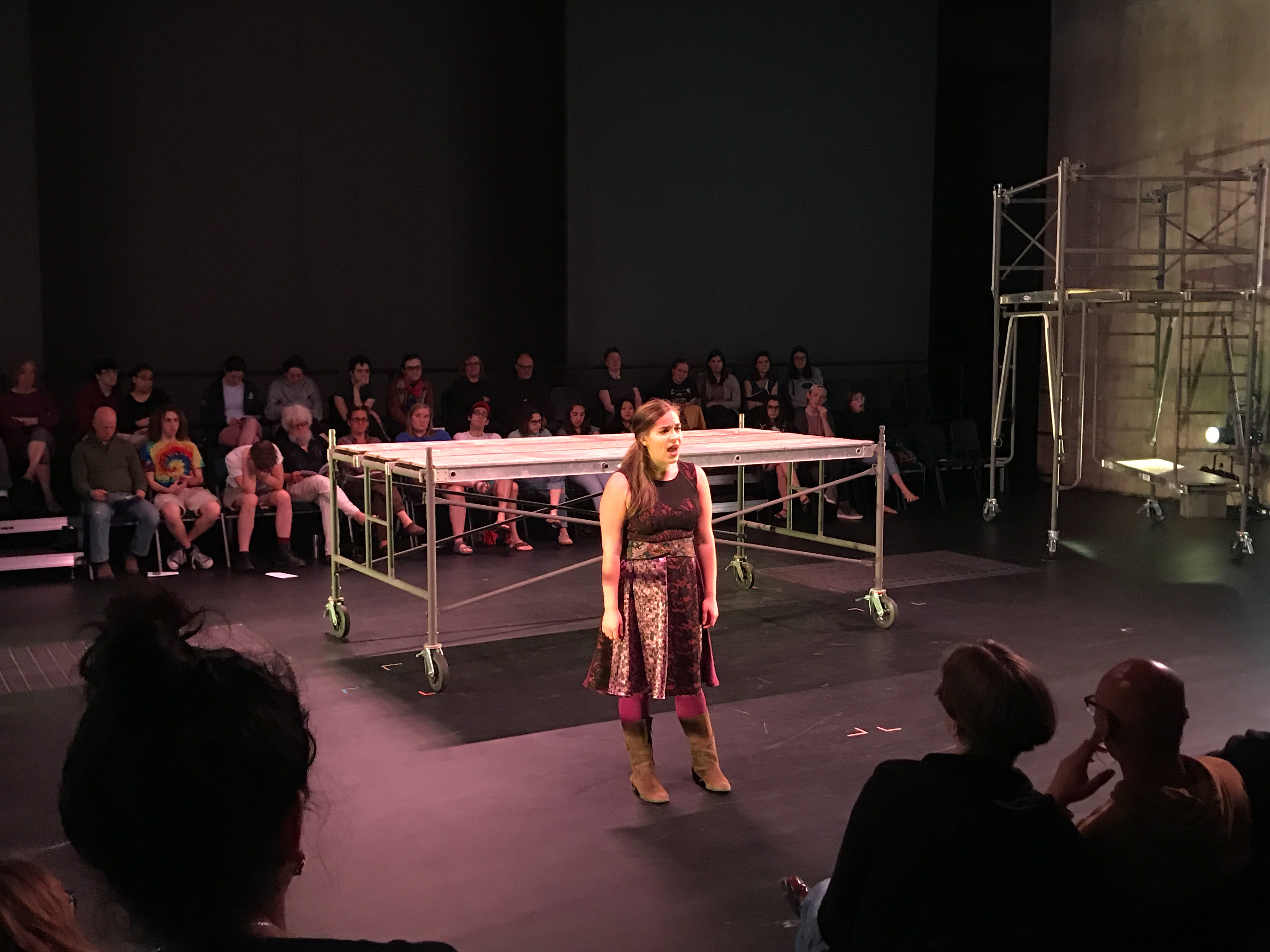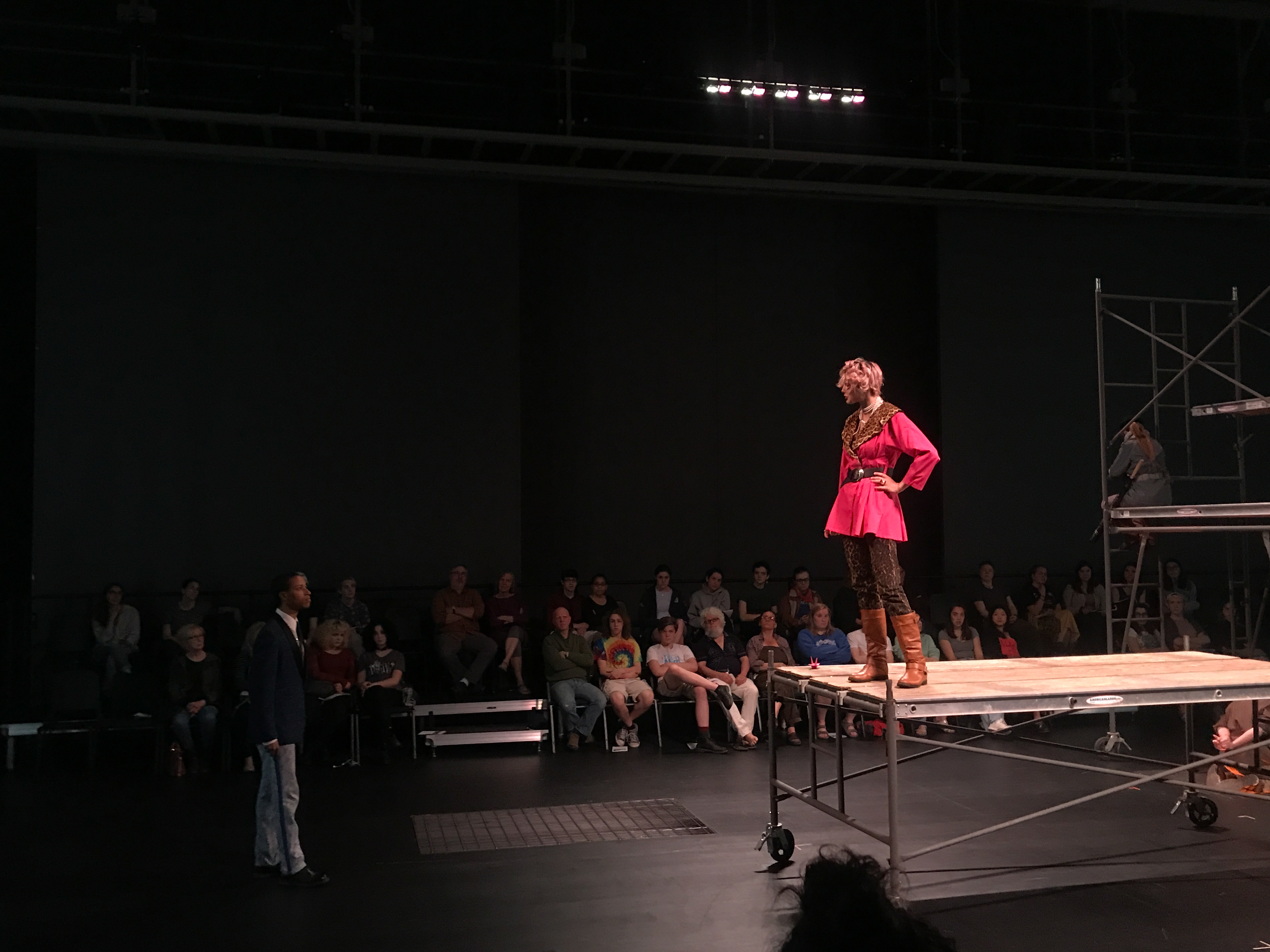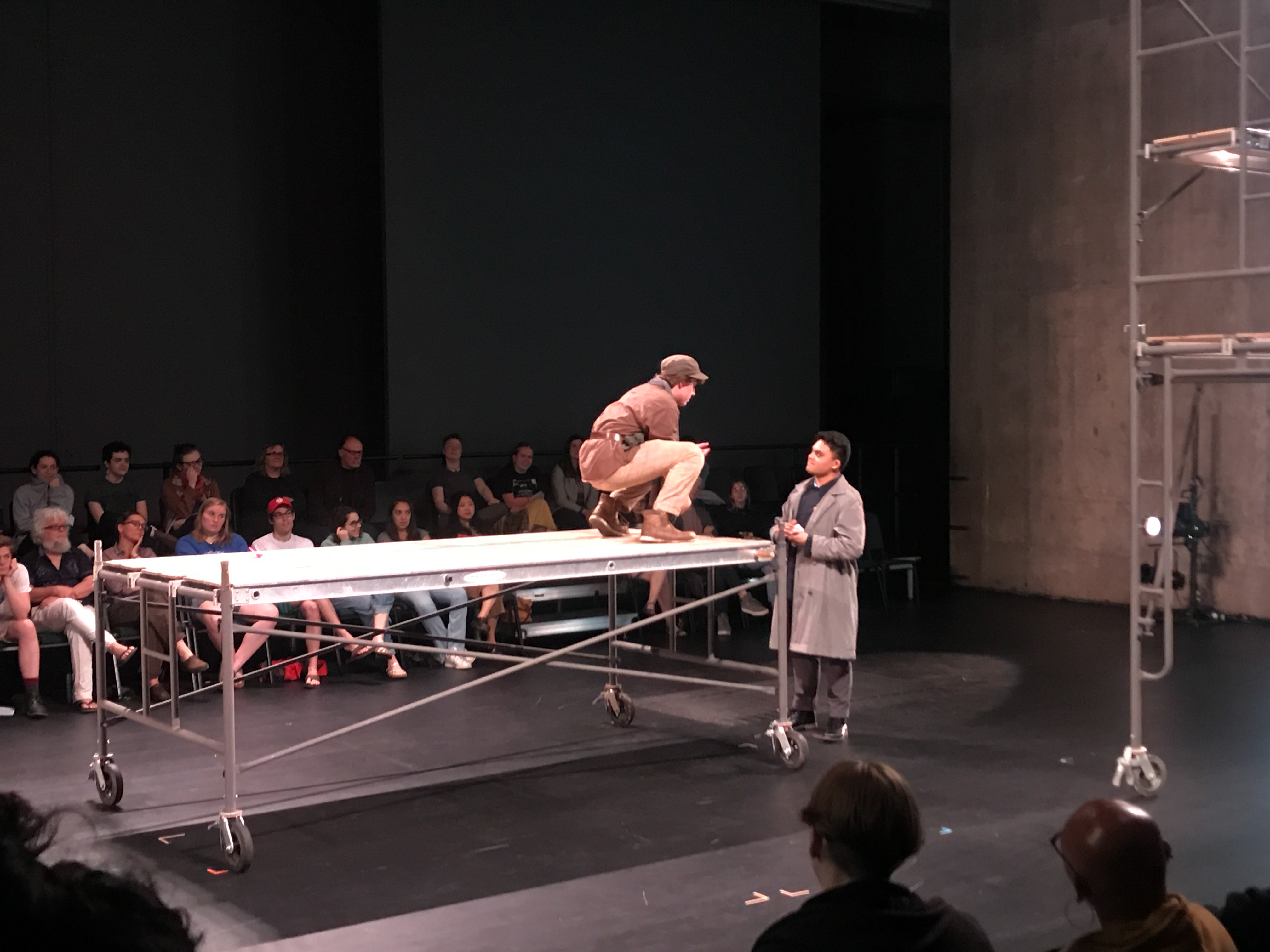 Quite contrary to the elaborate costumes, the set design was extremely simple and stripped down. It consisted mainly of scaffolding build of wooden planks and metal pipes. These pieces were movable and served many purposes throughout the play. The set was evocative of the classic design of Jonathan Larson’s “Rent”: simple and utilitarian, yet useful and effective. It remained dynamic despite its simplicity because of the level to which the actors interacted with the set pieces.