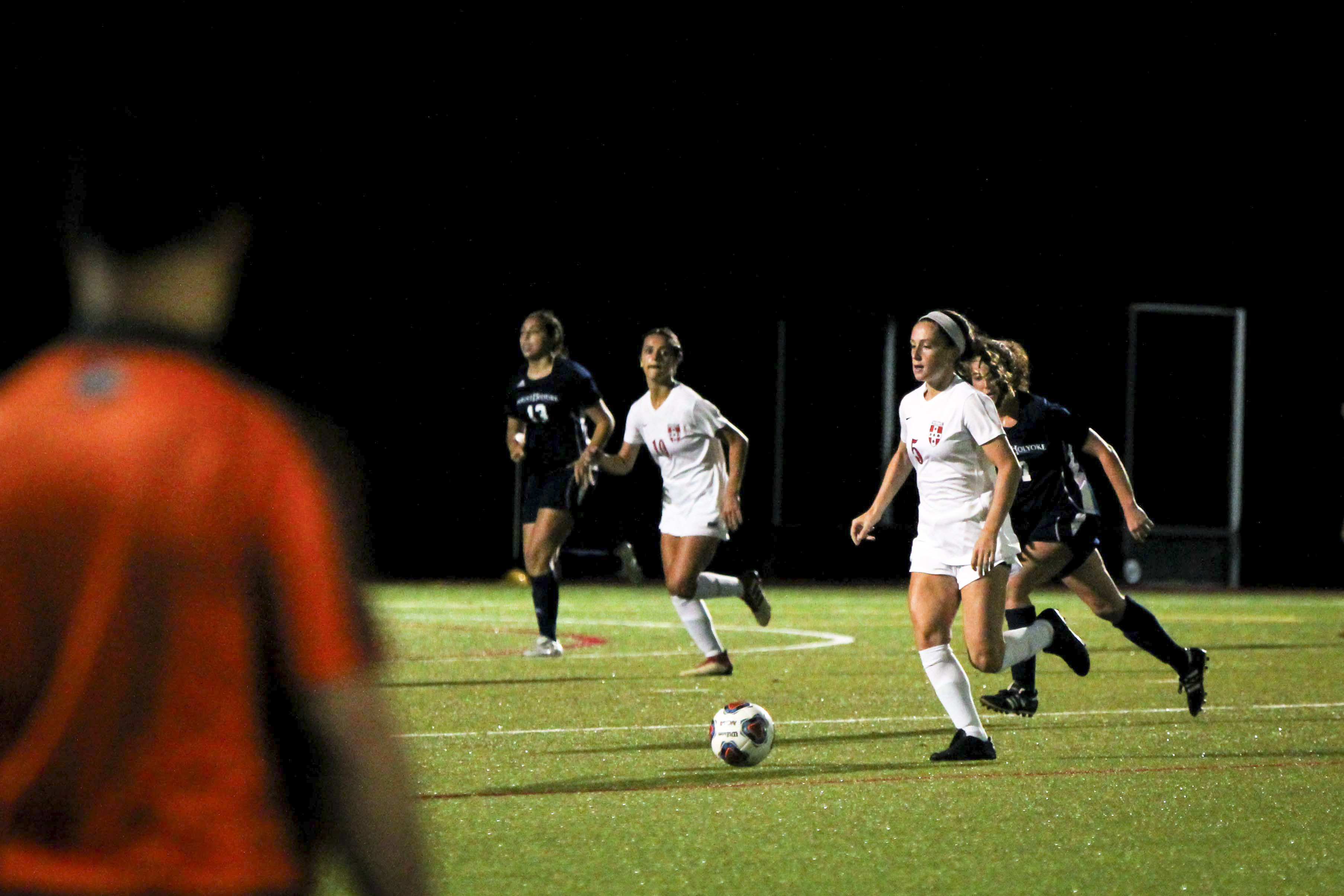 The Red and Black got off to a quick start when defender Kayla O’Brien ’19 took advantage of a defensive breakdown by Mt. Holyoke and scored a goal at the 8:28 mark. The Cards were later able to notch a second goal at 18:01 when Gianna Argento ’21 trapped a cross from O’Brien and tucked the ball straight into the net. The lead again expanded at the 40:56 mark with Shannon Sweeney ’21 taking advantage of a penalty kick, securing a 3-0 lead before half-time. In the last eleven minutes of the game, Katie Frizzell ’20 and Sweeney were each able to notch a goal for the Red and Black. After netting two goals, Sweeney commented on what turned out to be a fun night.