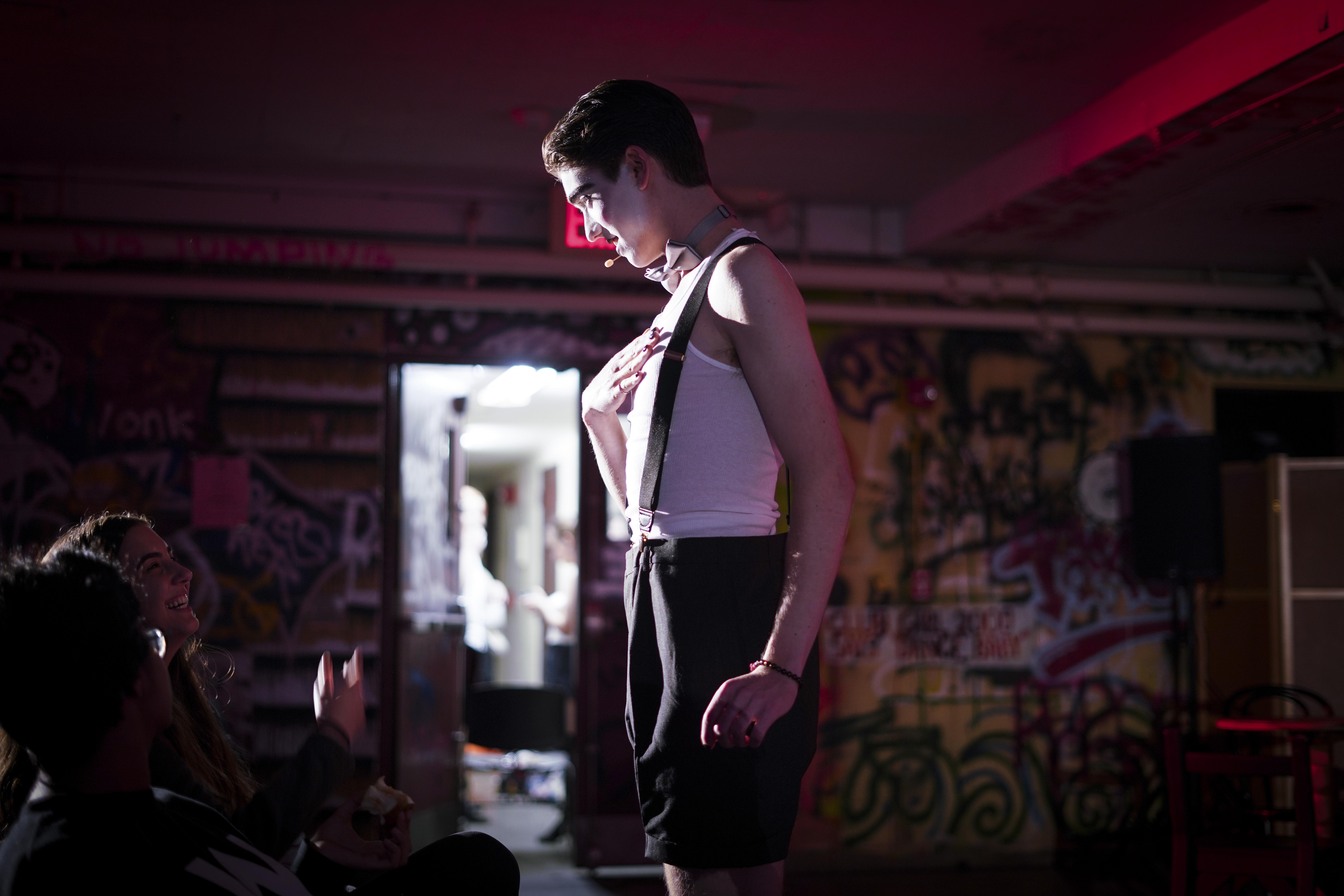 This space, too, was narrative. Pryor Krugman ’20’s Emcee drew upon both its predecessors but found its own poignancy.  He had a disturbing, doll-like manner at times, as Grey, but would have made Cumming proud with his naughty behavior.  Most importantly, there was something more.  He was not a mere mixing but added his own perspective and substance, seen as much in his costuming as in his acting. Brilliantly, Costume Designer Emma Graham ’19 dressed him not only in Grey’s mime facepaint and Cumming’s risque suspenders, but also added elements never before seen—an undershirt and converse shoes. The play was by no means modernized, but the Emcee’s appearance and manner were at times contemporary. Just as he wore modern clothing, so too he slipped out of a theatrical, German demeanor periodically and was distinctly modern. In these moments, we looked to the WestCo graffiti behind the setthe background that looked so old before was recognizably current.
