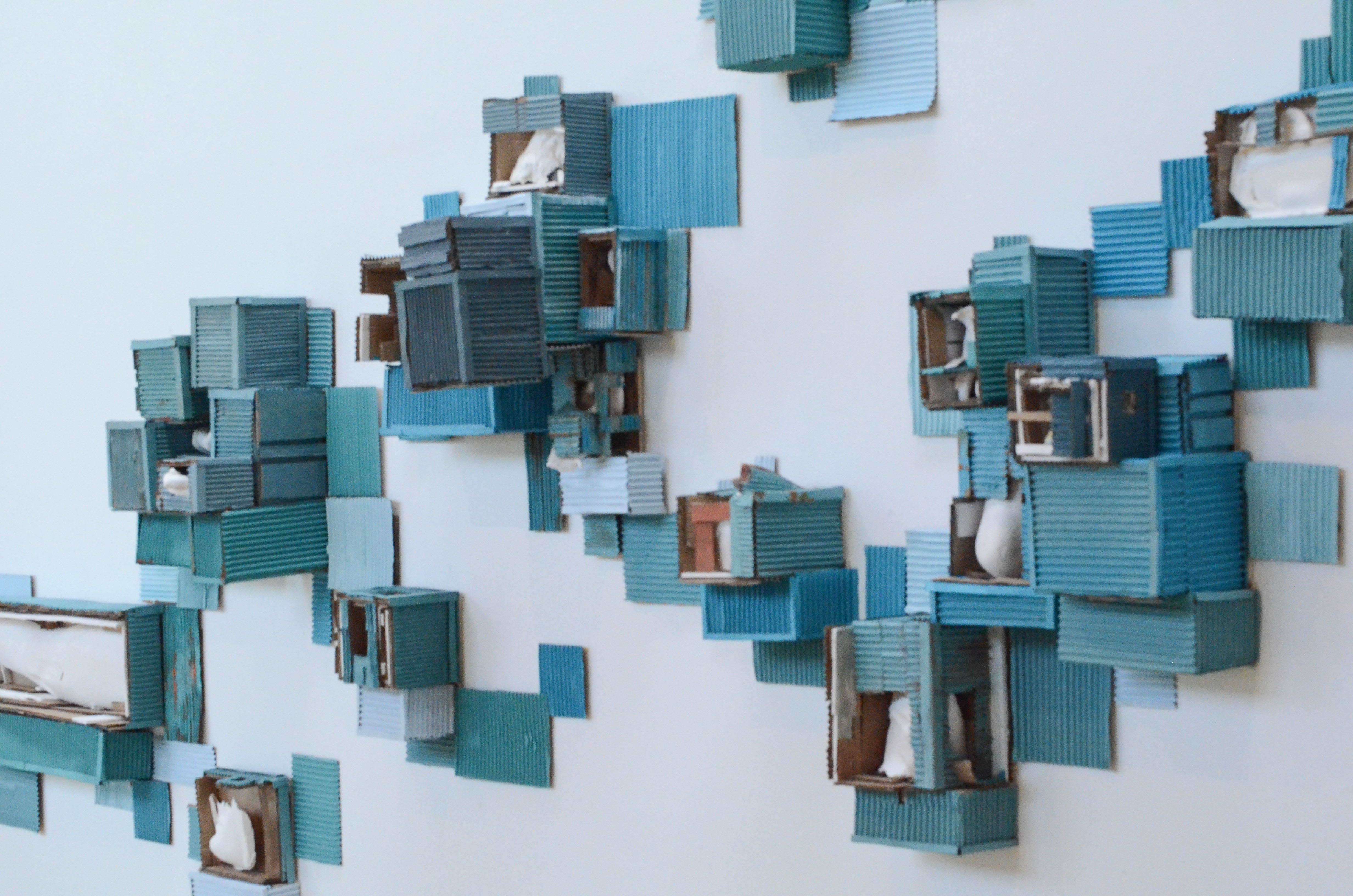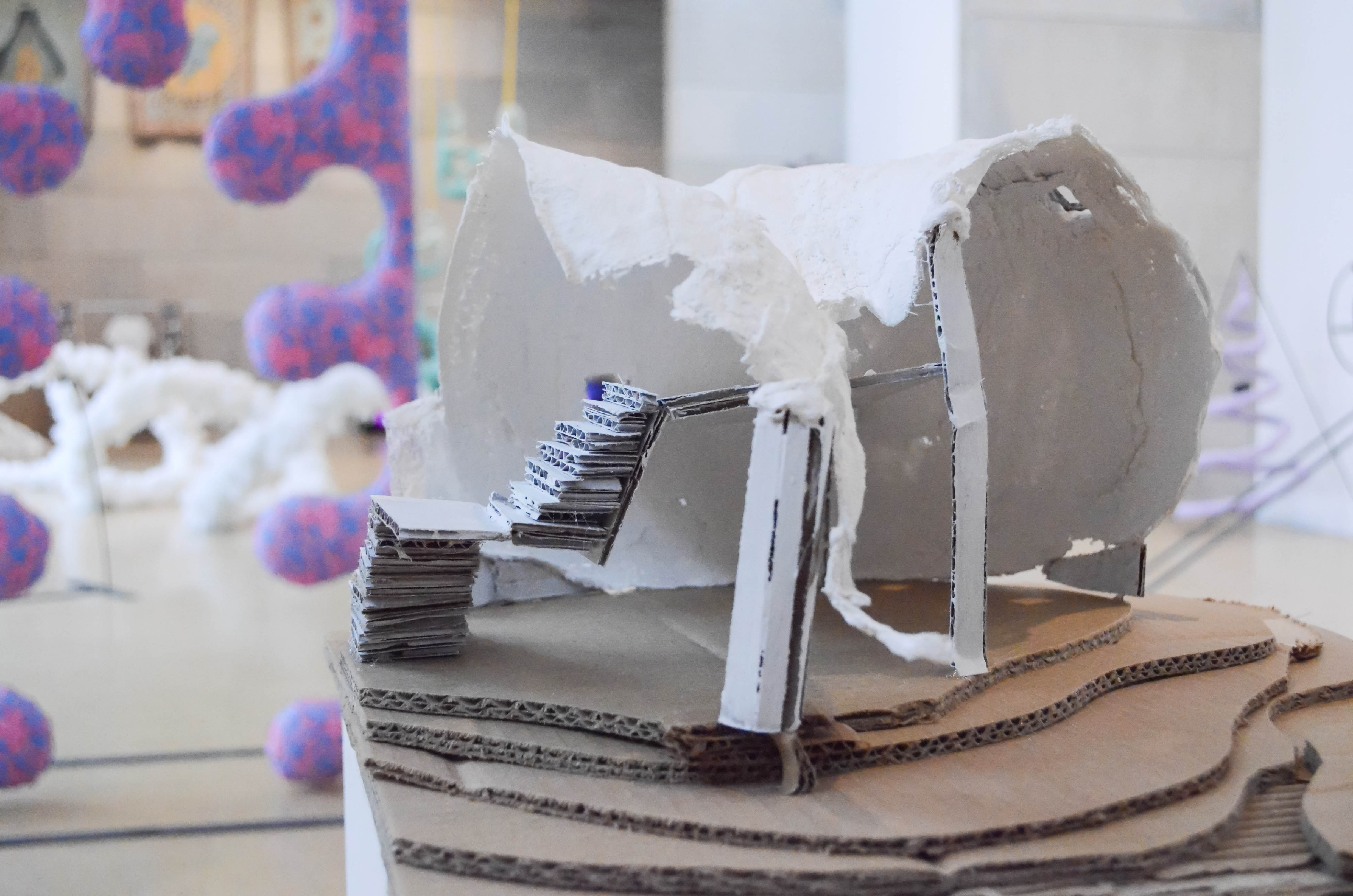 “Both my advisors are really process oriented, so over the summer and during the first semester of this year there was a really big emphasis on just experimenting with materials and trying out ideas…” Weisner said. “The project evolved out of a pre-existing interest in containment and world-building. Specifically I was looking at these steel barriers on the side of train tracks over the summer and was really interested in the ways that they look like they’re made up of cubby-spaces.”