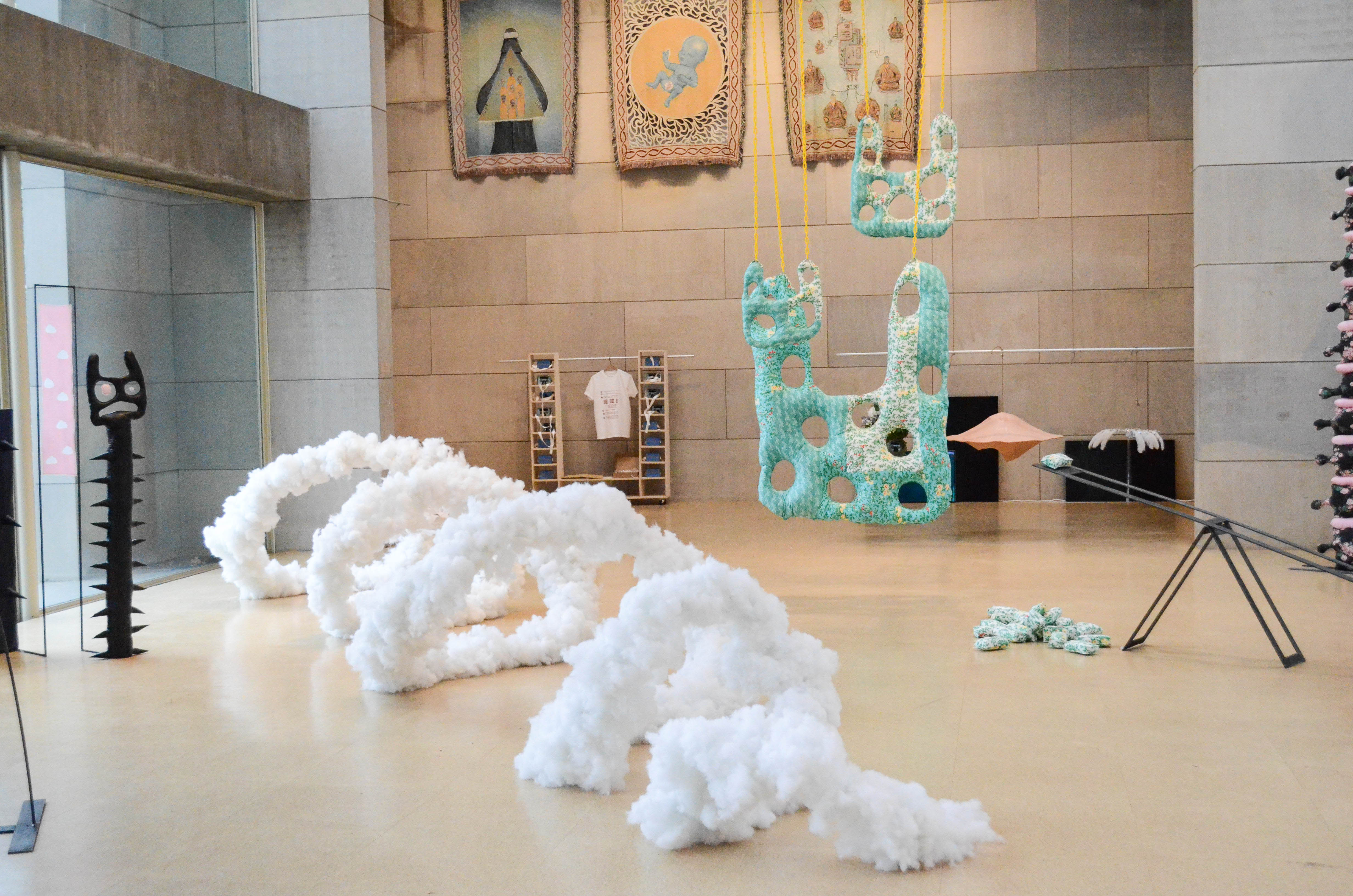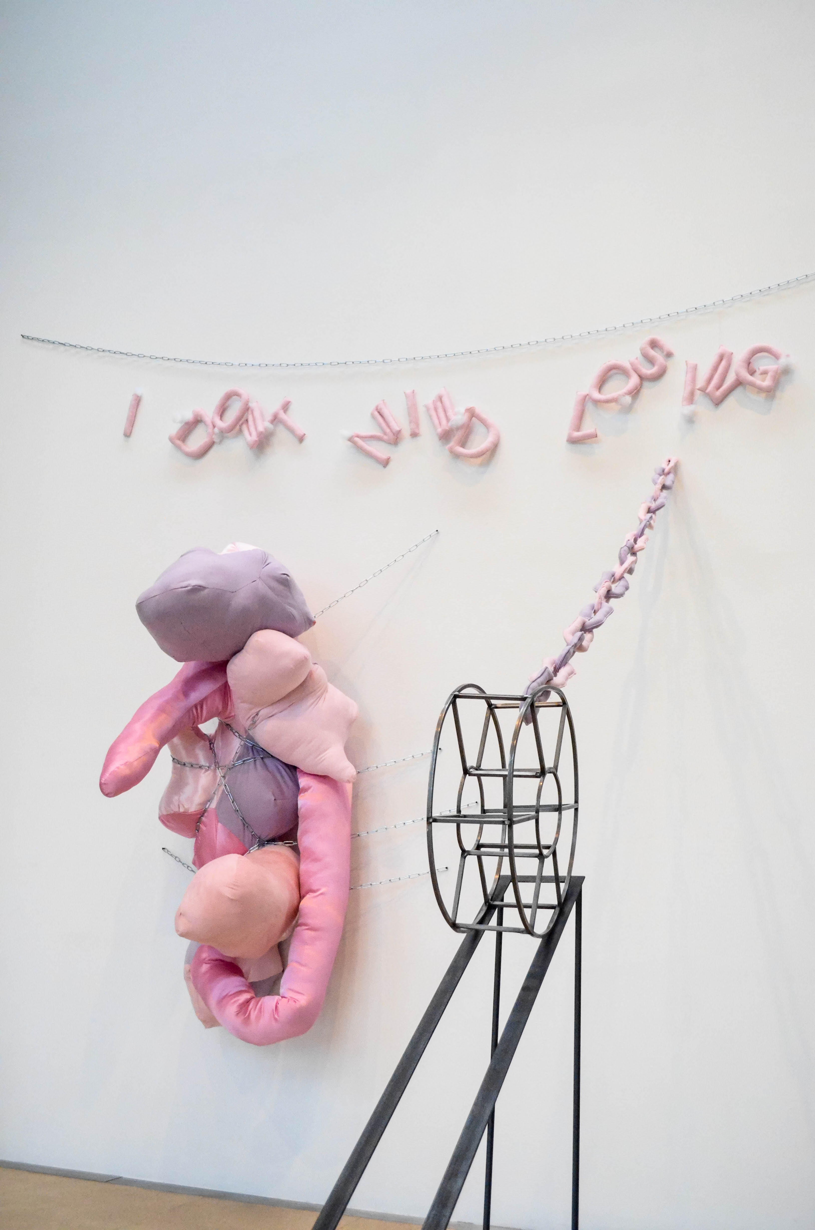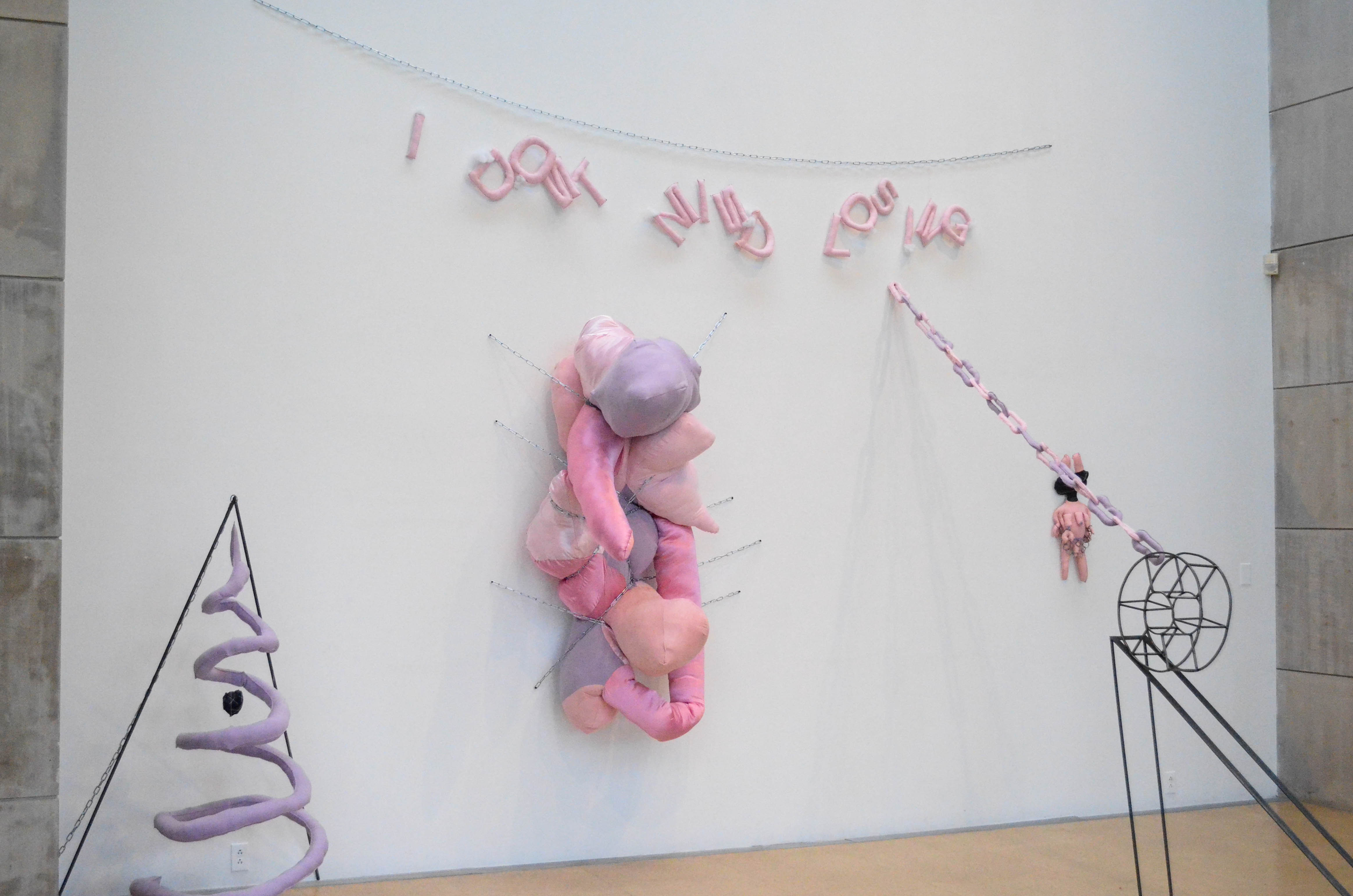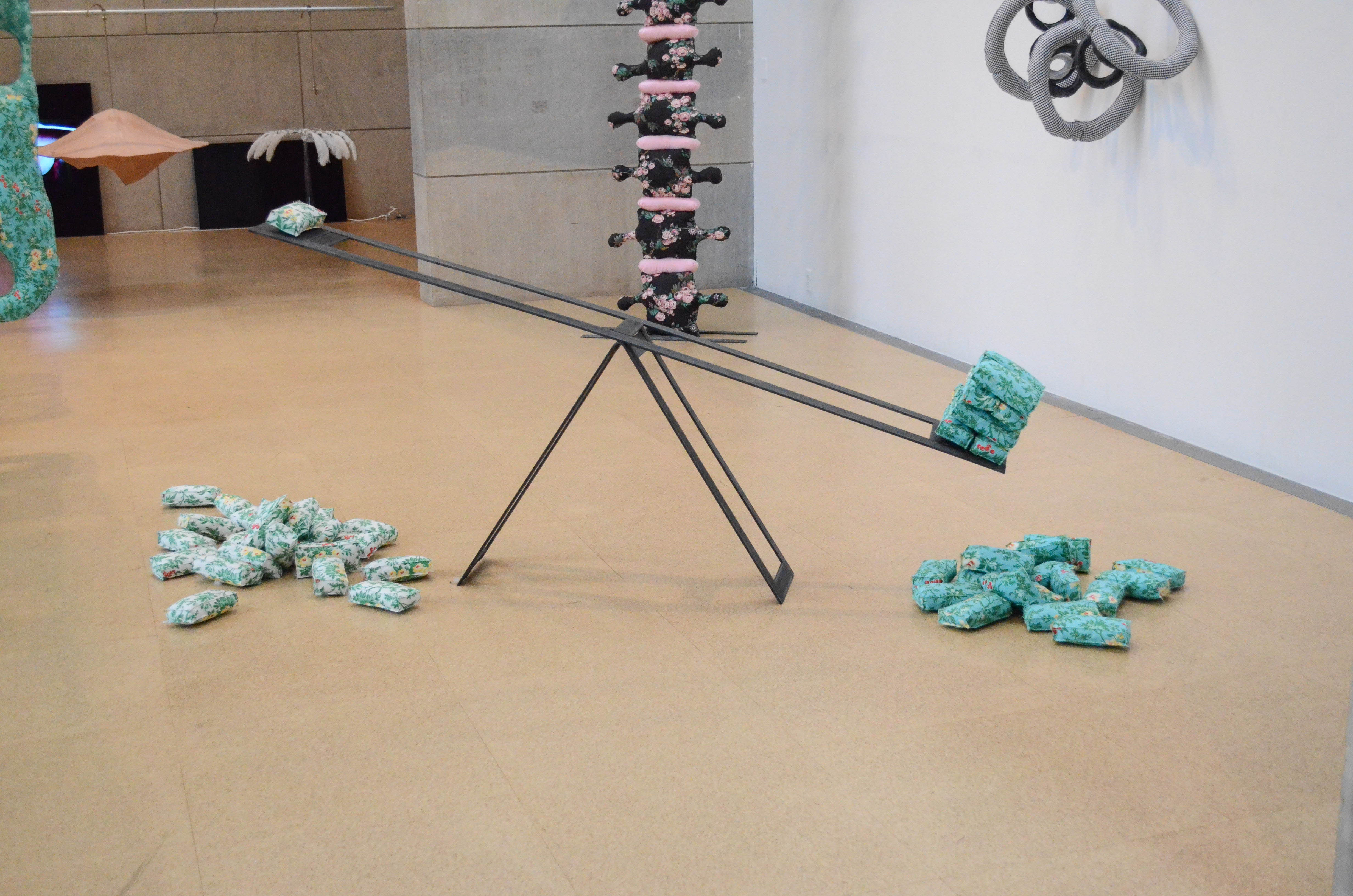 While the range of unorthodox materials (steel, fabric, and pillow stuffing) in the different pieces initially captivates the viewer, there are subtle yet complex themes imbued within the relations between the materials and their implied connotations.