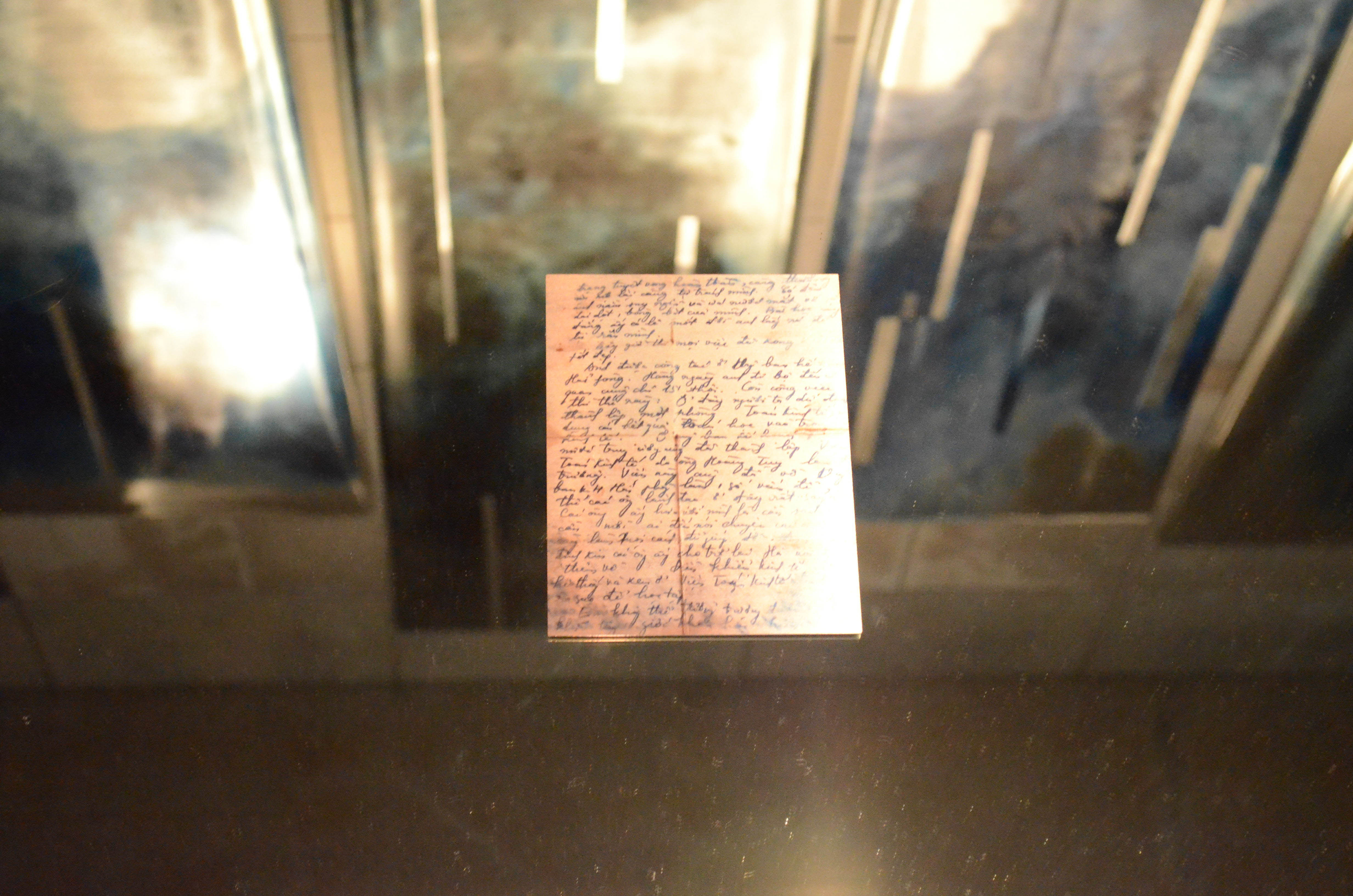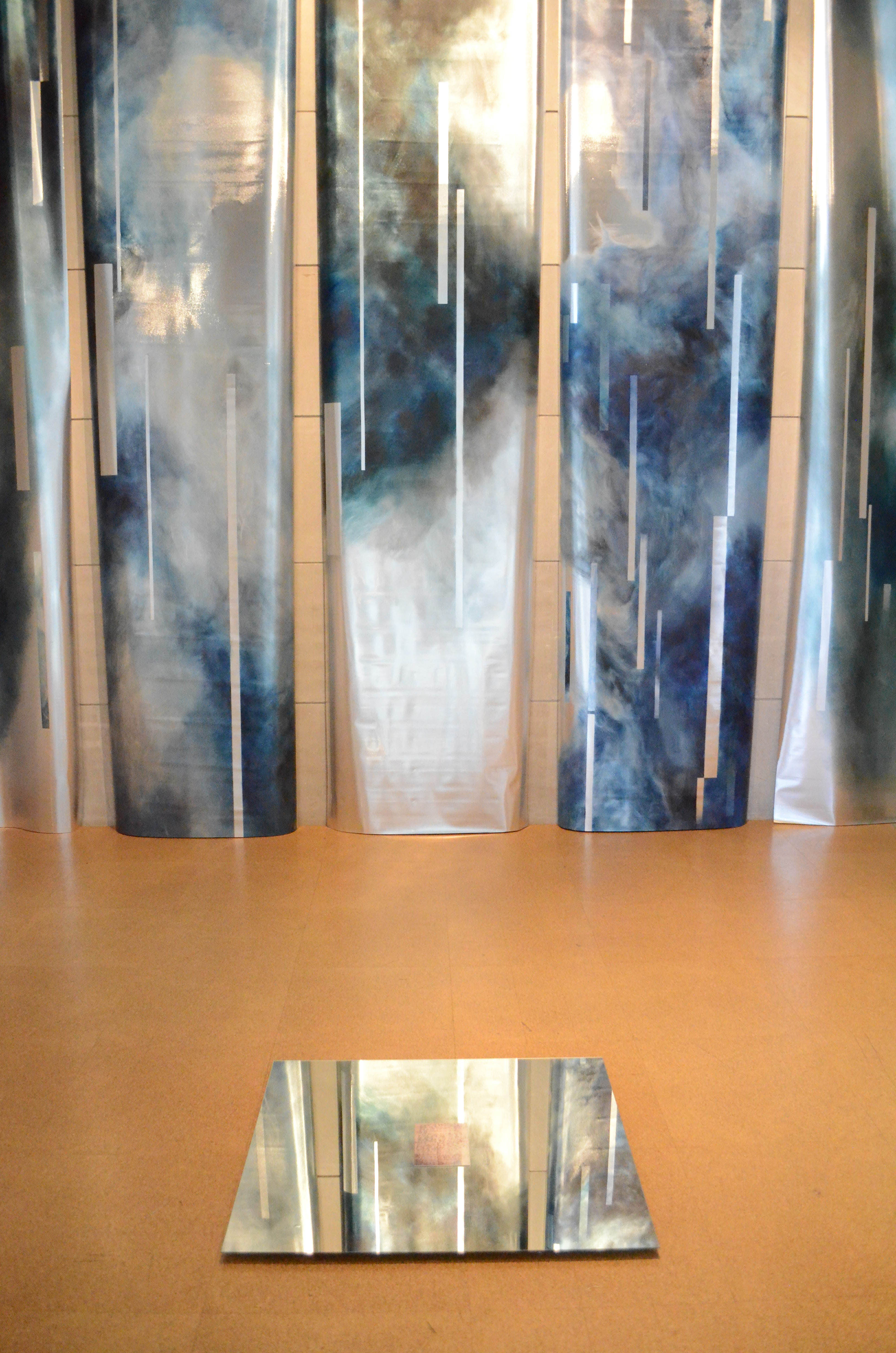 In the middle of the installation, a mirror lies flat on the floor, reflecting the ceiling. An aged-looking note written in cramped Vietnamese script sits on top of the mirror. Small oil paintings in muted colors depicting zoomed-in versions of various objects—a flower, a pile of rice—are hung on three of the four walls surrounding the mirror. On the fourth wall, directly behind the mirror, hangs a row of long, narrow tapestries covered in abstract streaks of color.