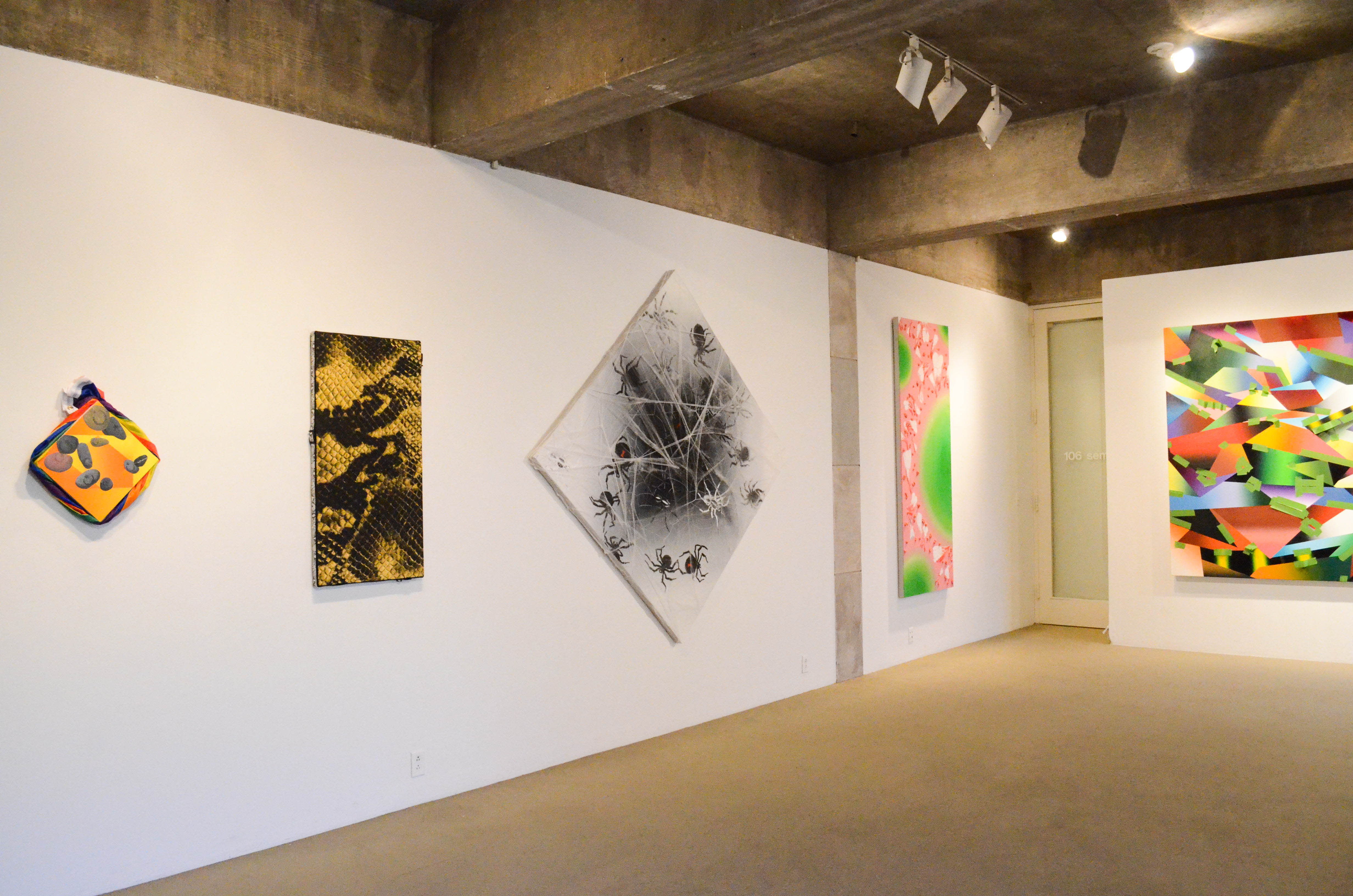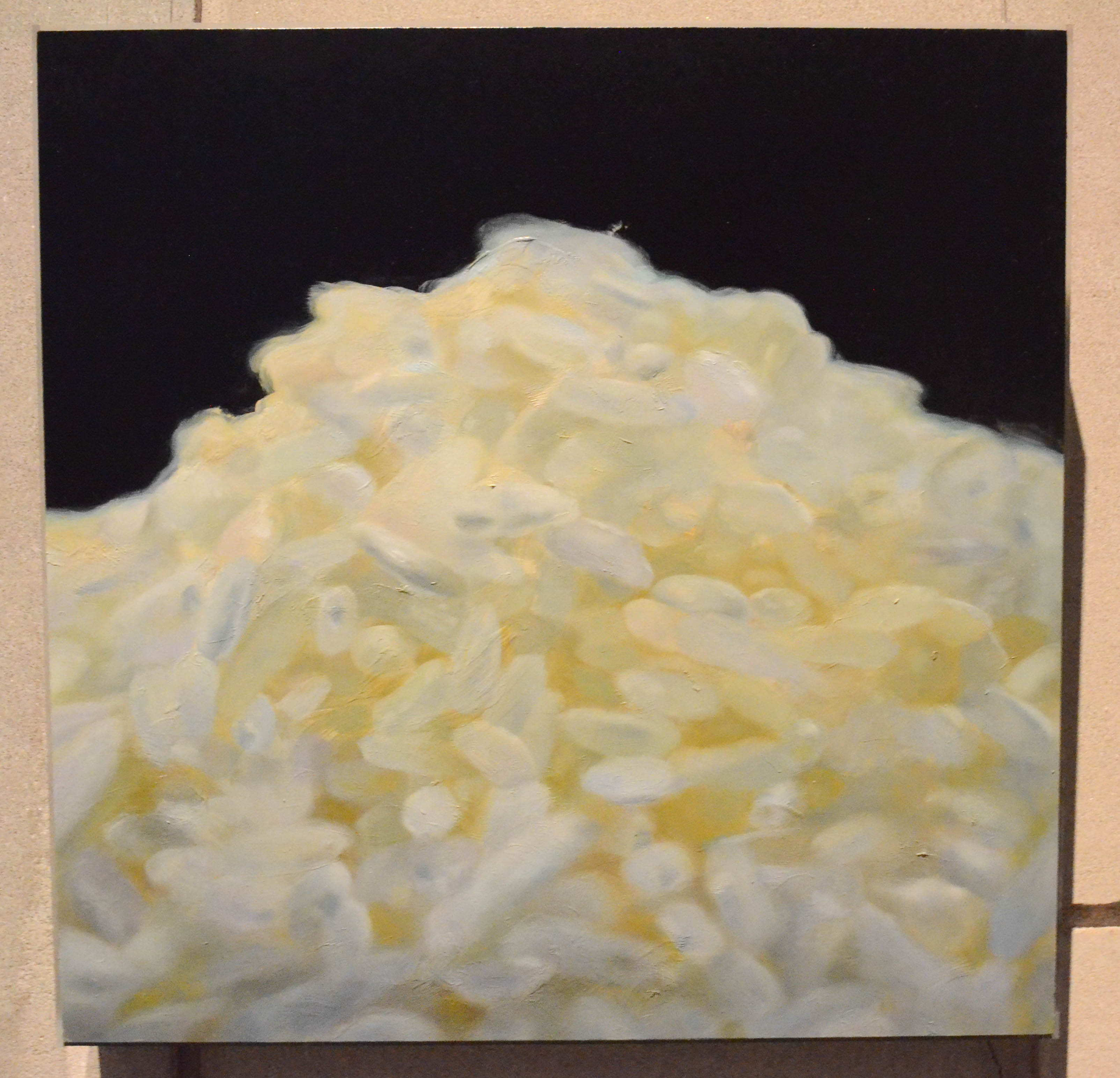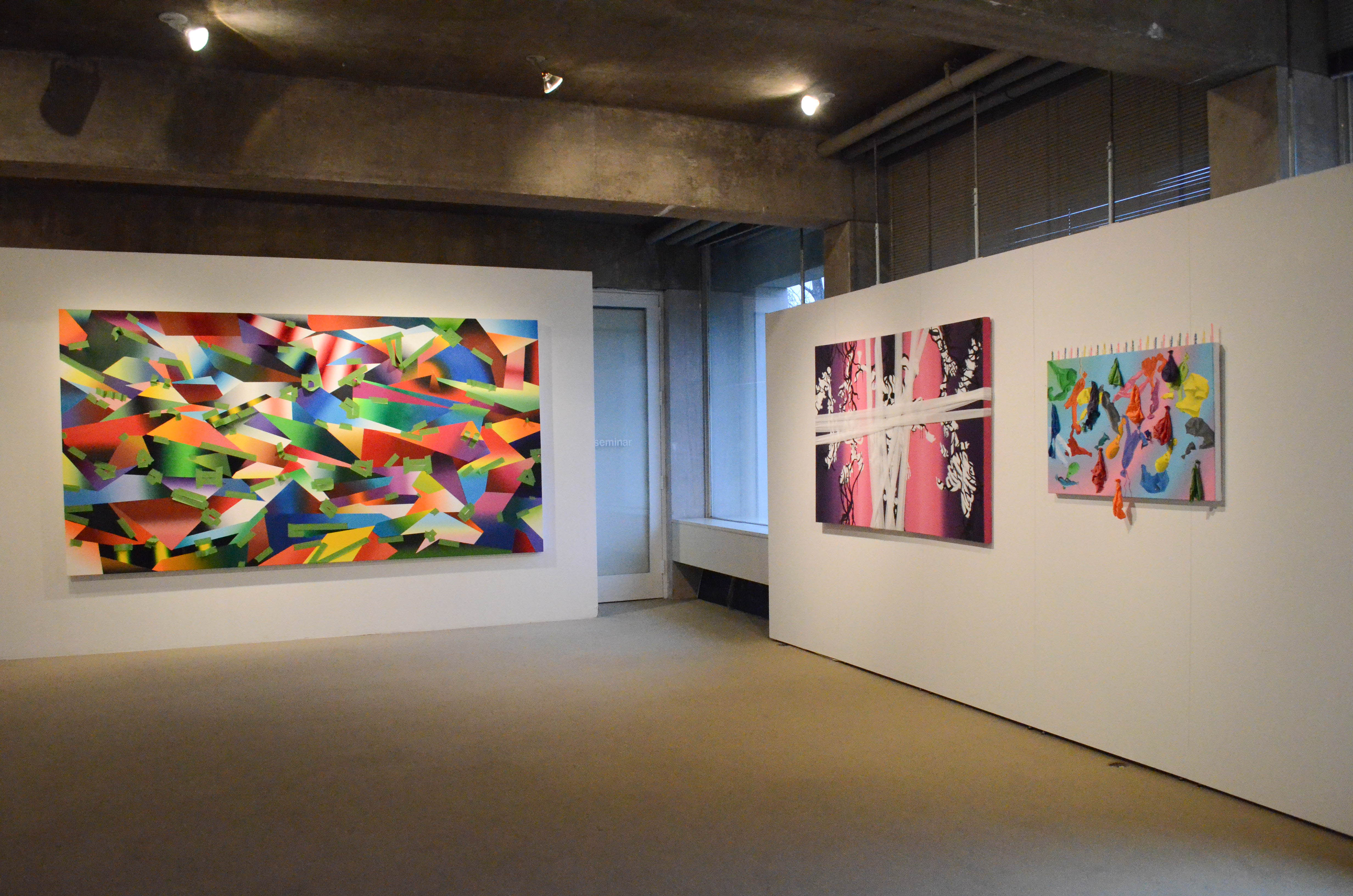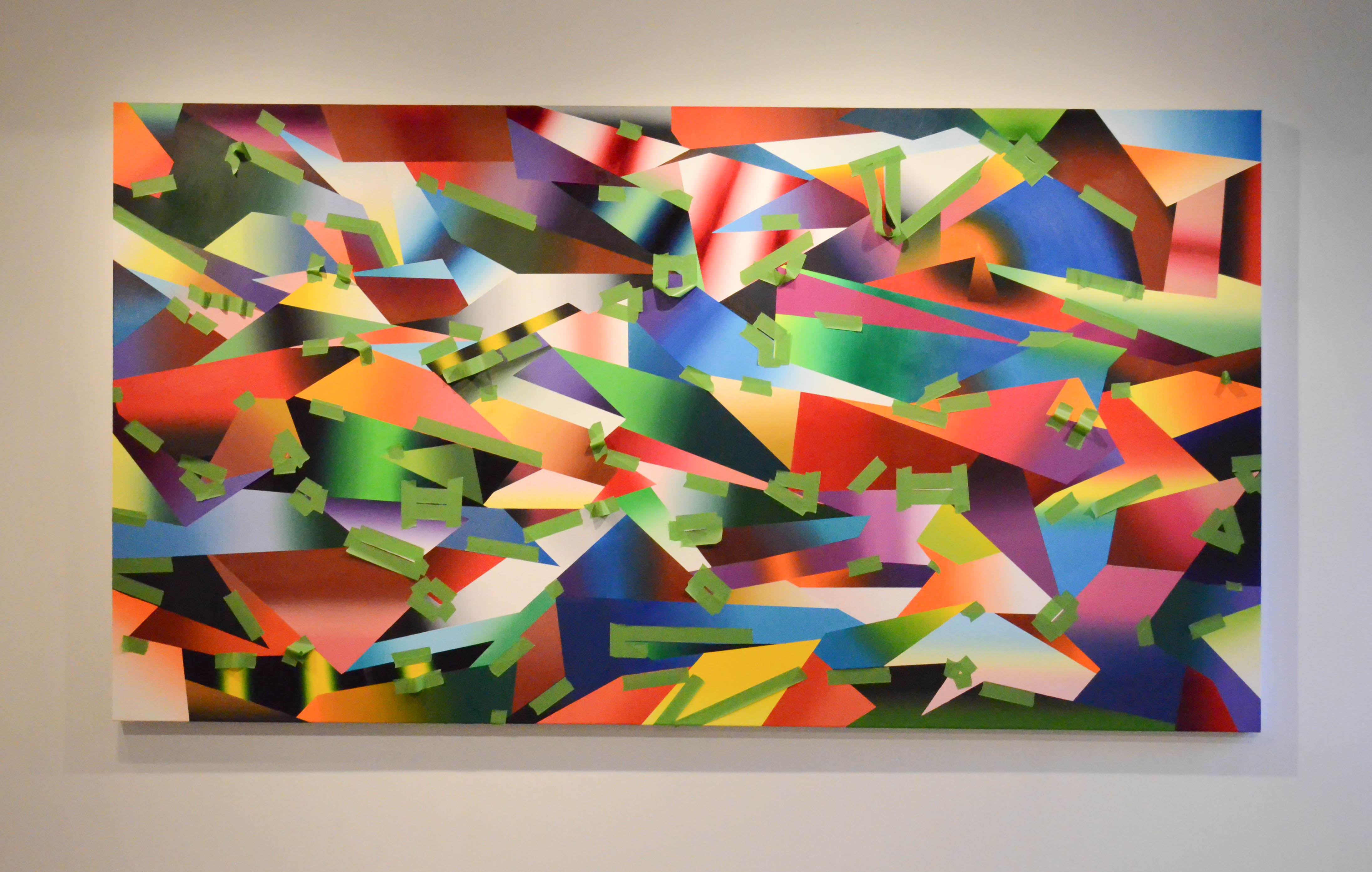 Halilovic’s thesis, “I Will Not Fear,” consists of a series of semi-abstract paintings which reflect the artist’s struggles with feelings of depression and fear. The paintings are diverse in style and content—one piece consists of a mosaic-like pattern of brightly colored geometric shapes, while another is painted with a spiderwebbed pattern of white lines to resemble a cracked piece of glass—but all draw viewers’ attention with their vivid colors and graphic patterns.