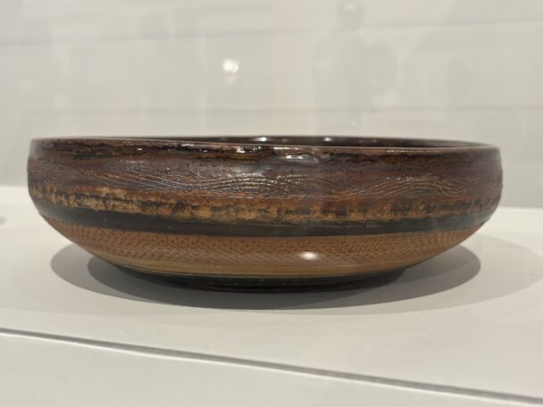Upon my arrival to “Excavations,” I began to survey the scene. Organized to mimic a museum, O’Neil’s assorted ceramics are encased in glass and lined up in neat rows. I searched for something not immediately visible in the clinical overhead lighting. It took a moment to find this something: the bowl pictured above, untitled. Made of stoneware clay and glaze, it measures 10.75 inches by 3 inches.
