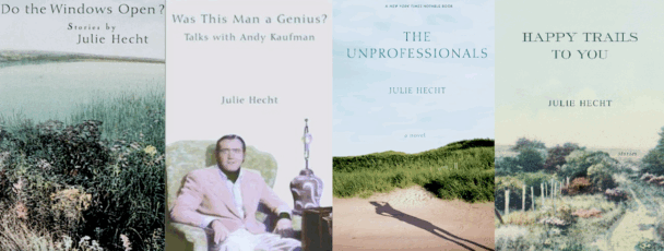 Julie Hecht is one of those rare authors whose books can actually be judged by their covers. Each cover is a mix of blues and greens with a distinct font and an emphasis on natural surroundings. Even her only official non-fiction book, whose cover shows Andy Kaufman sitting in a chair, attempts to make him and the objects around him as nature-adjacent as possible (the back wall looks similar to the sky). These covers perfectly convey the pleasures of reading one of Hecht’s works.