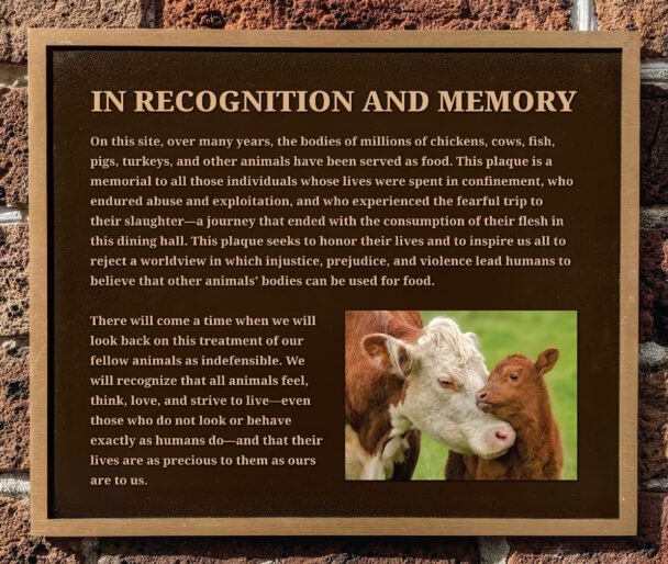 The plaque (rendering included below) is an invitation to consider that every meal offers an opportunity to make choices that are kinder to animals. As living, feeling beings who value their lives in the same way that we value ours, animals deserve our empathy and consideration.