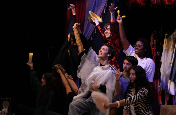 Pearl described “the group of alchemists and thinkers” she assembled for this production. When Momo (Sally Hu ’29) discovered a pair of ballet shoes in the sand, she rose en pointe and gracefully counseled her fellow castaways as she spun while simultaneously soothing herself. During a dream sequence medley, Ivy subconsciously comforted her anxiety through a lyrical number, bowing to puppet horses that drift alongside her, through the scene. Sezra (Saydie Grossman ’26) serenaded the desert with Mitski’s “I Want You” to overcome her devotion to silence, and to accept that it very well might be “the end of the world.” Each actor’s talent propelled their characters to embrace an aspect of their authentic selves that could not be actualized under the strain of public judgment.