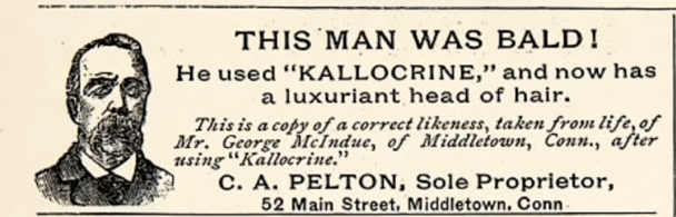 “This man was bald!” read one Argus ad published today, Dec. 5, 135 years ago. The ad included a sketch of a well-groomed man’s portrait. “He used ‘Kallocrine,’ and now has a luxuriant head of hair,” The Argus explained. “This is a copy of a correct likeness, taken from life, of Mr. George McIndue, of Middletown, Conn., after using ‘Kallocrine.’”