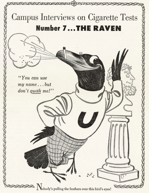 By 1950, The Argus was running cigarette campaigns with a real sense of structure. In the Dec. 5 issue, a Camel ad appeared under the headline “Campus Interviews on Cigarette Tests,” presenting a cartoon raven who announced, “You can use my name… but don’t quoth me!” The copy insisted that “one fast puff or a quick sniff” couldn’t tell a smoker much, and proposed an experiment to remedy the issue: “the 30-Day Camel Mildness Test,” in which students were invited to smoke Camels “pack after pack, day after day.” At the end of the month, the ad said, one’s “T-Zone (T for Throat, T for Taste)” would settle the matter.