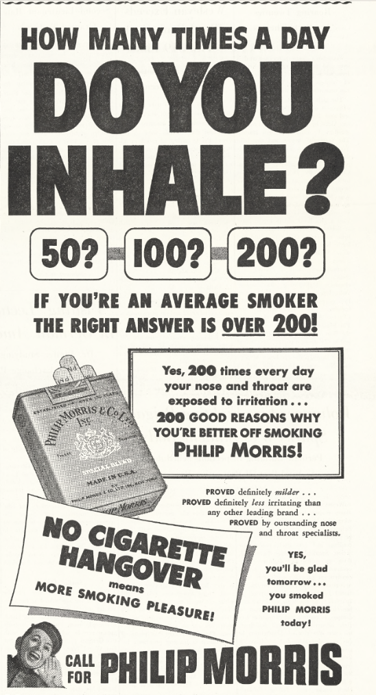 Moreover, Philip Morris use extreme language to make three points about the effectiveness of their cigarettes, saying, “PROVED definitely milder… PROVED definitely less irritating than say any other leading brand… PROVED by outstanding nose and throat specialists.”