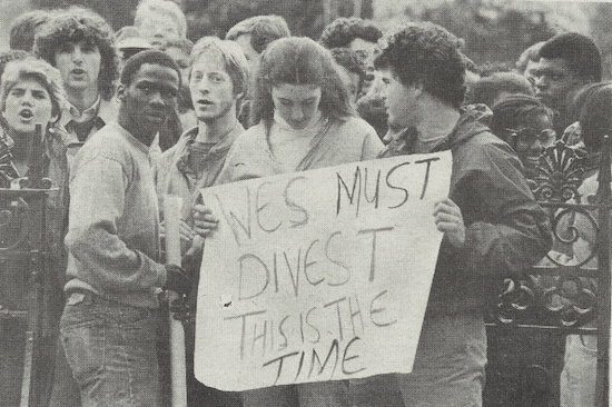 In 1985, Wesleyan recorded near record protest numbers in a clashing confrontation with the Board over the endowment’s financial ties to South Africa. More than 400 Wesleyan students stood proudly, entreating divestment from an apartheid-ridden nation. Ultimately, the University was pressured to enact more stringent requirements for companies in which it held shares that conducted business in the country. Additionally, the board provided supplemental funding for research on corporate conduct. Notably, then-University student Isaac Shongwe ’87 joined the protest knowing full well that the resulting press attention would bar his return to South Africa—a home he hadn’t seen in five years. I was taken aback by the act of courage. It seems so foreign that a student with so little to gain and so much to lose could soberly risk it all for his beliefs.