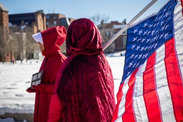 Members of the Middletown community dress in clothing from the Handmaids Tale, holding an upside down American flag (right) and a sign that reads “HANDS OFF OUR BODIES” (left); c/o Finn Feldman