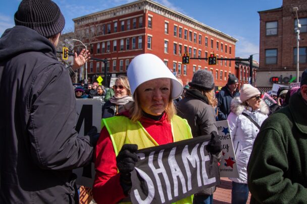 An organizer in a handmaid’s costume stares down the camera; c/o Finn Feldman